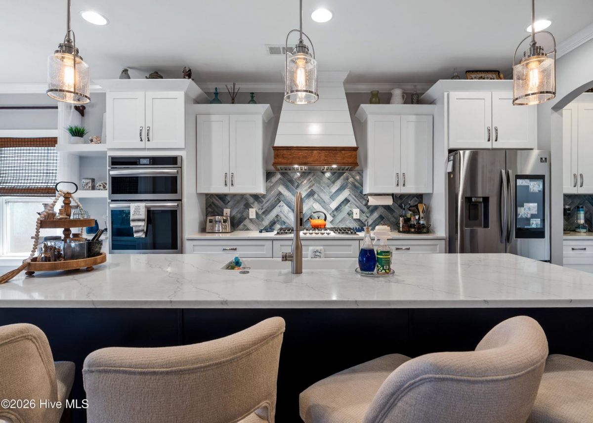 Enjoy the unmatched coastal lifestyle of St. James in this beautifully crafted and maintained 3-bedroom, 3-bath home, ideally located near one of the community's gated entrances and within walking distance to the Seaside Club. Inside, the home offers engineered hardwood floors, a formal dining room with arched doorways, wainscoting, and a convenient butler's pantry. The open concept kitchen/living areas includes a totally renovated gourmet kitchen (2023) with an oversized quartz island, blue glass tile backsplash, gas cooktop, wall oven, microwave, and custom pantry. The living room features built-ins flanking a shiplap fireplace and opens up to a three-season room with EZ Breeze windows overlooking a pond. The main level also includes a guest bedroom, full bath, laundry room, and an oversized primary suite with tray ceiling and sitting room/office/flex space. Upstairs offers an additional bedroom/bathroom suite, large bonus/game room, and ample attic storage. Additional features include a 2-car garage with epoxy floors and fenced backyard. The Seaside club features a zero-entry pool, wet and lounge decks, splash pad, tennis and pickleball courts, fitness center, seasonal bar and grill, sand volleyball, and more. HOA fees cover lawn maintenance for care-free living. St. James residents also enjoy four championship golf courses, a marina, private beach club on Oak Island, parks, trails, dining, social clubs, and more! Conveniently located to downtown Southport area restaurants and shopping. Book your showing today! See agent remarks regarding possession.