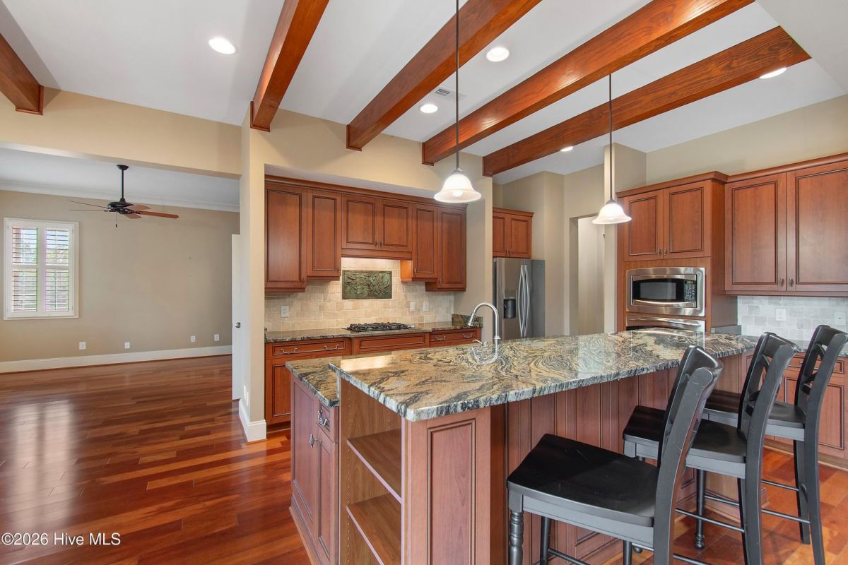 Situated on one of the most beautiful and sought-after streets in the Reserve section of St. James Plantation, this brick home offers a rare pond setting surrounded by water on two sides and a protective retaining wall designed to prevent erosion while preserving the timeless pond views. The treed location on the street provides exceptional privacy and a peaceful approach to the home, complemented by an inviting open front porch. Inside, the spacious living room features a wood-burning fireplace and flows seamlessly into the open-concept kitchen and dining areas—ideal for both everyday living and entertaining. A dining room and a dedicated office / den add versatility to the floor plan. A Jack-and-Jill bath connects the office/den and an adjacent bedroom. The office could be closed off and used as an additional bedroom if desired. A screened porch and open patio offer perfect spaces to relax while enjoying views of the gently flowing water. The primary suite is generously sized and thoughtfully designed for comfort and privacy. The home offers three full and one half bathrooms in total. Upstairs, a large bedroom with a loft area provides flexible space for guests, or recreation, or a second office, along with a spacious walk-in attic for excellent storage. Step outside to a beautiful backyard overlooking the pond, where tranquil water views surround the home on two sides, creating a truly special outdoor setting. The three-car garage with extra height offers ample room for vehicles, storage, or hobby space. Residents enjoy access to St. James Plantation's exceptional lifestyle and amenities, including miles of walking and biking trails, 81 holes of championship golf, tennis, pickleball, croquet, bocce, a marina, private beach club, fitness centers, pools, and on-site restaurants—all within a secure, gated coastal community.