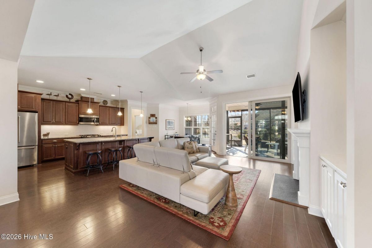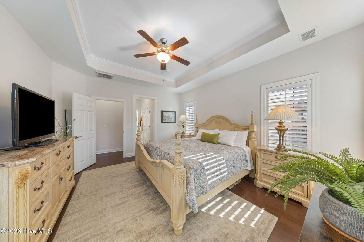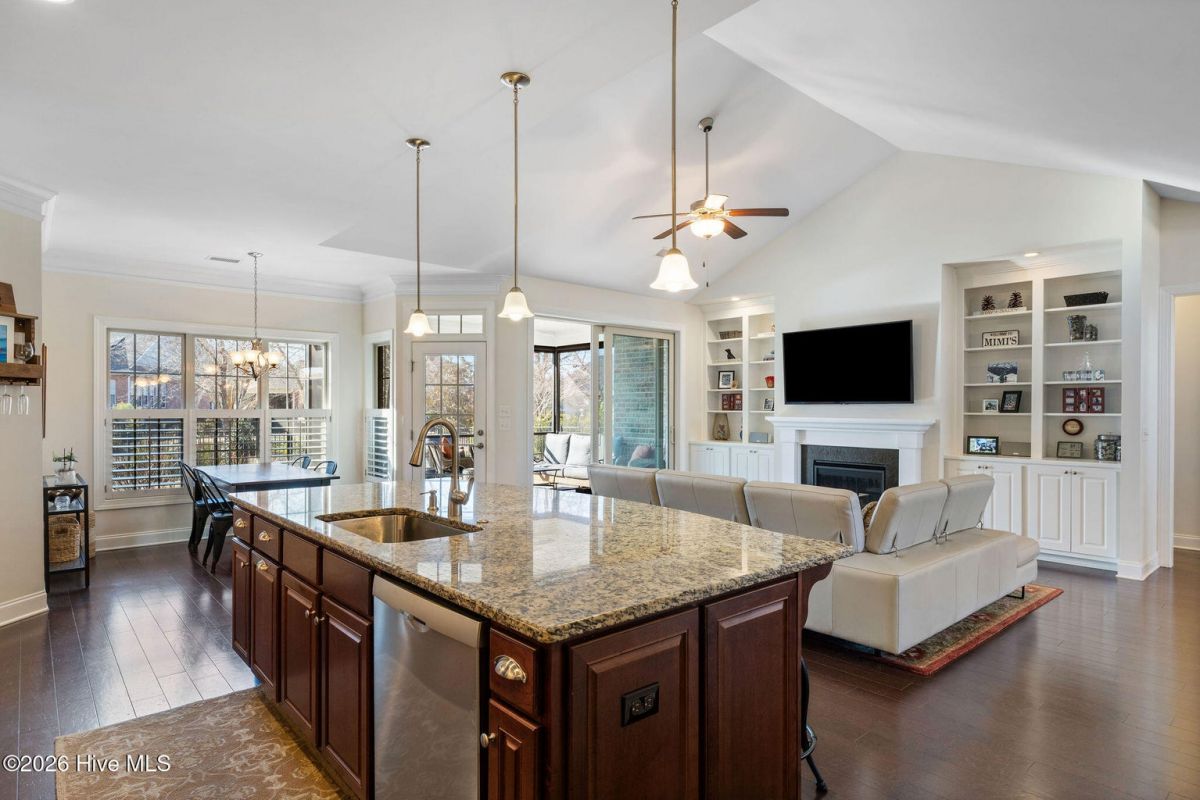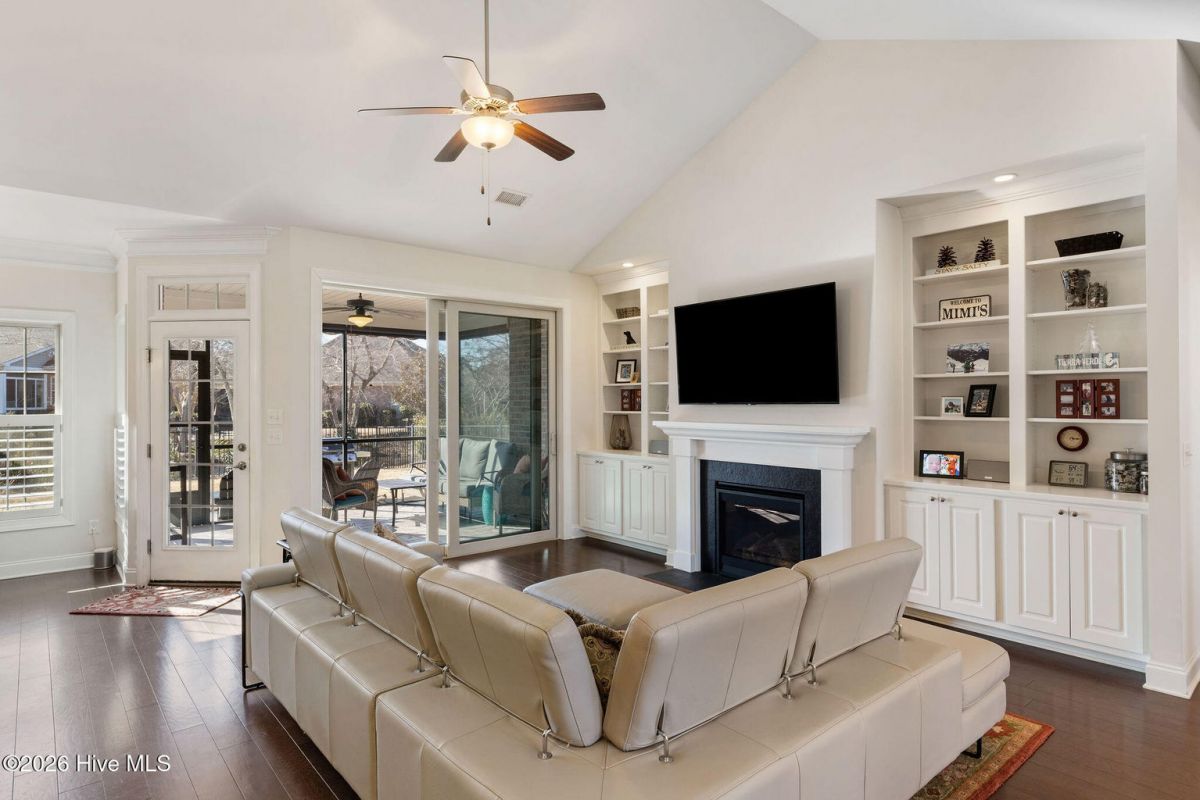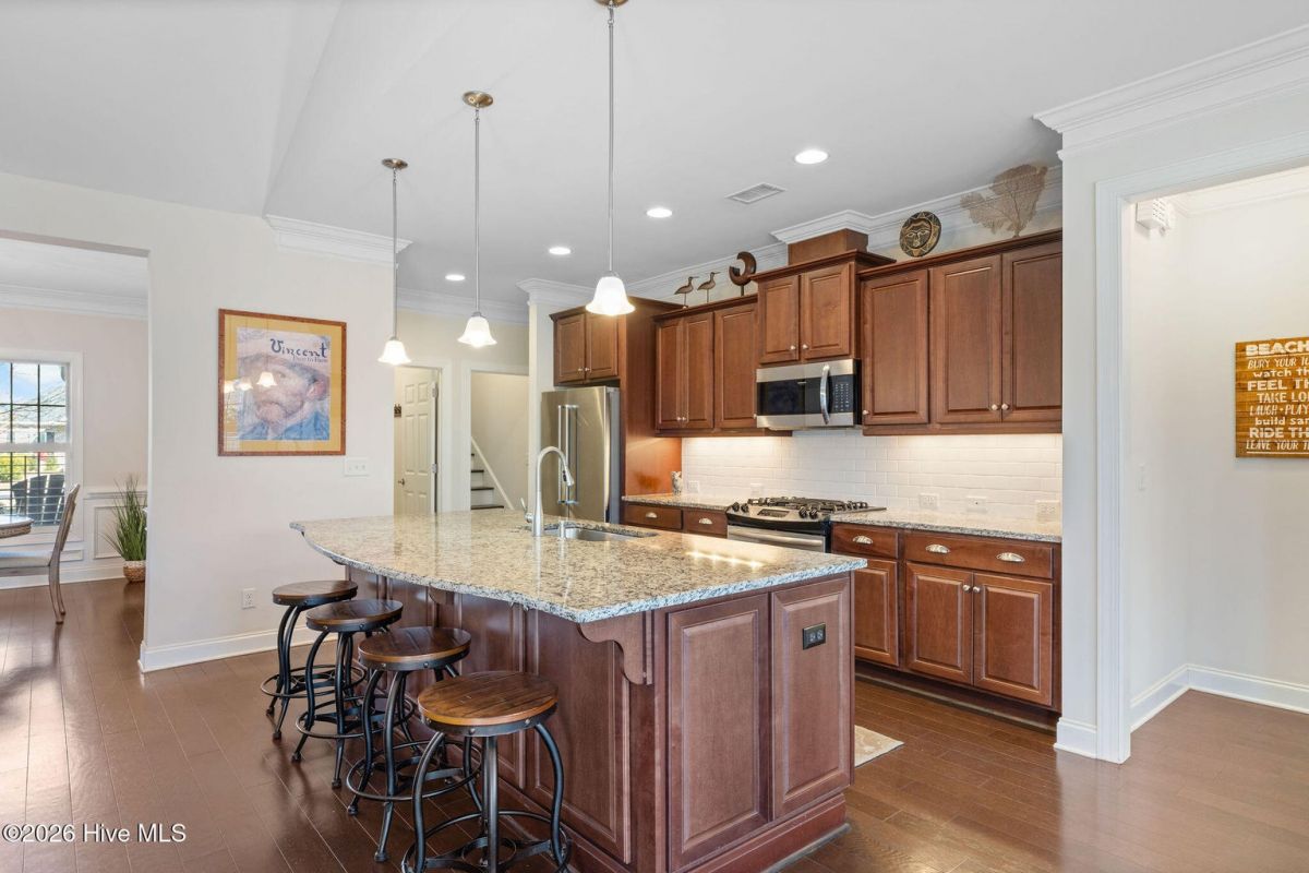 This all-brick home built in 2018 is in the highly desirable Regency Lakes neighborhood of St. James Plantation where yard maintenance is included. The setting is exceptional, overlooking a peaceful pond with a fenced backyard that allows you to enjoy both privacy and open water views. The outdoor living spaces are a highlight, with a screened porch featuring sunshades and a stamped concrete patio with motorized awning that extend the living area beyond the interior. Enjoying the mild Carolina weather and relaxed coastal feel is a breeze with long water views and a peaceful atmosphere. The welcoming front porch invites you into an open, easy living one story floor plan with durable engineered hardwood floors greeting you from the entrance that flow throughout the main living areas. As you enter to the left a formal dining room is the perfect space for entertaining family/friends, while the great room opens with a vaulted ceiling, crown molding, and the cozy fireplace is flanked by custom built-in cabinetry on either side. The room feels bright and connected to the outdoors, with natural light pulling your attention toward the backyard and pond. The kitchen has been designed with both function and detail in mind. It offers extensive soft close cabinetry, granite countertops, upgraded tile backsplash, under-cabinet lighting, and pull-out storage features. A gas cooktop, Bosch dishwasher, and properly vented hood complete the space, while the large pantry and generous counter area make it practical for daily use and entertaining alike. The breakfast area sits just off the kitchen and looks out over the backyard and pond beyond. The split bedroom floorplan offers privacy from guests with the primary bedroom located on one side of the home and guest bedrooms on the other. The primary suite is set up for comfort, featuring a tray ceiling with crown molding detail and two walk-in closets with wood shelving. The upscale bathroom offers a zero-entry tiled shower, comforting soaking tub, dual vanities with square sinks, framed mirrors, and a pocket door that adds separation and usability. The guest bedrooms are both spacious and sized with ample closet space and the front bedroom works well for an office or den. These rooms share a full bathroom with a granite top vanity and walk-in tiled shower surround. The laundry room has a sink, newer washer/dryer, and cabinet storage. Take the stairs up to the bonus room featuring hardwood flooring, a full bathroom, and a large closet, making it ideal for a hobby room, flex space, or additional guest quarters. Storage space is incredible! There is a walk-in attic, plenty of closets, and best of all a dedicated 9ft. by 7ft. closet in the garage for all sorts of gear and holiday storage. Additional features include plantation shutters, upgraded ceiling fans, the garage floor is finished with epoxy flooring and workbench area. The home also includes a whole house surge protector, radiant roof barrier for a cooler attic, zoned HVAC, and a whole house generator tied to a 500-gallon propane tank. Regency Lakes is a desirable neighborhood of St. James Plantation, offering a clean, maintained look with included yard care and access to the full range of community amenities and the convenience of an entry/exit just minutes away. If you are looking for a younger well-maintained home in St. James Plantation you have found it!