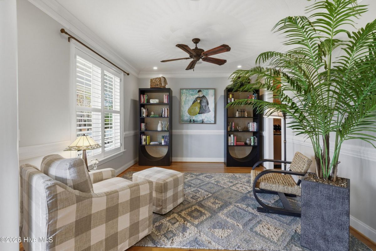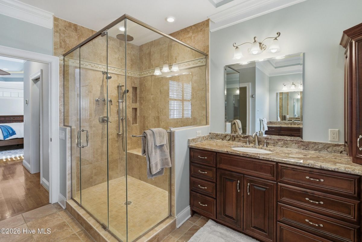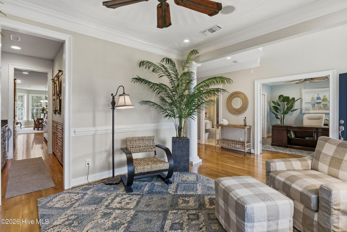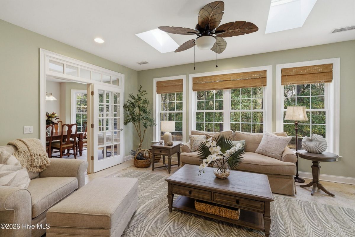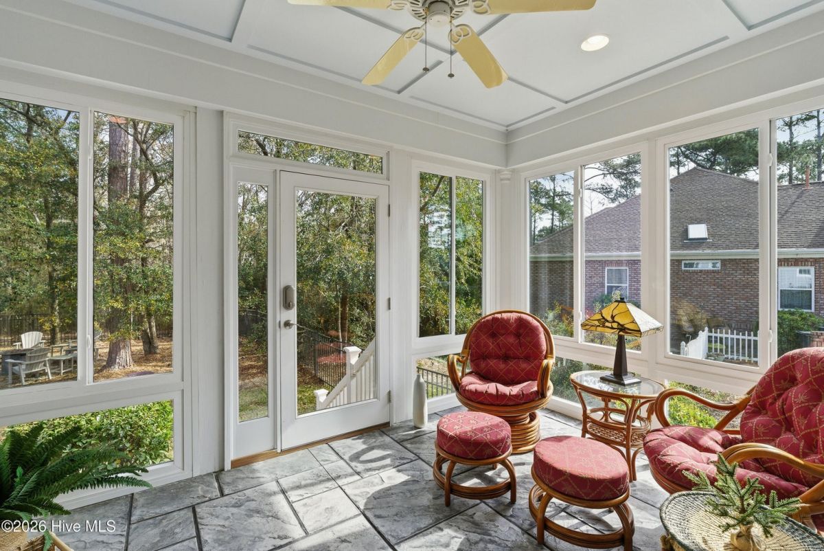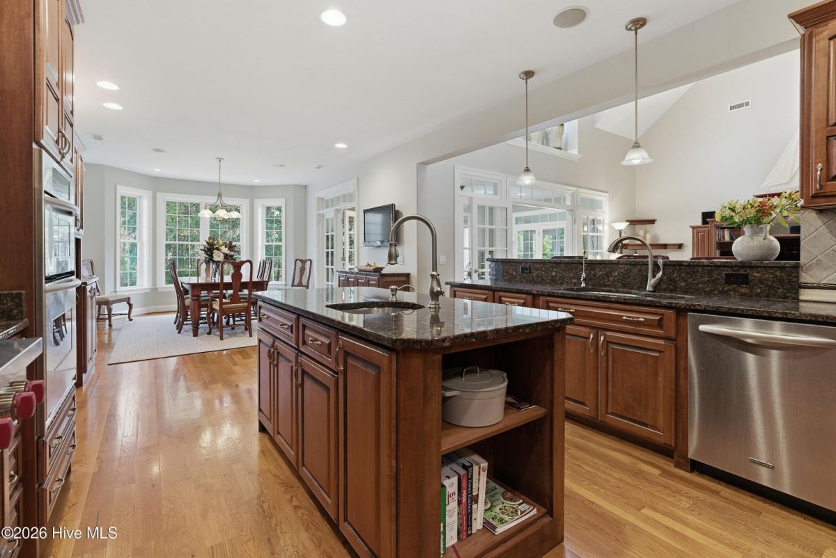 Discover refined, resort-inspired living in St. James Plantation, Southport NC, where every detail is chosen for comfort, ease, and gracious entertaining. This 5-bedroom, 5-bath home spans about 4,600 square feet and sits on a wooded lot with a private backyard and shed, offering tranquility just moments from the coast and the amenities that define this exceptional community. As you enter, you'll feel the effortless flow that makes daily life a pleasure and hosting a delight. The open floor plan centers on a generous great room and two sunlit Carolina rooms, with a dedicated library/office to accommodate quiet work or reading in style. Elegant hardwood floors run throughout, guiding you through spaces that blend timeless charm with modern practicality. The chef's kitchen is a true centerpiece, designed for both daily living and effortless entertaining. You'll find abundant counter space and a island with a sink, cherry cabinetry paired with granite countertops, stainless steel appliances including a six-burner Wolf cooktop, built-in Miele coffee station, wine cooler, and icemaker. A Butler's pantry and a breakfast bar that connects to the living areas complete the culinary hub. Two Carolina Rooms and one Sun Room brings in generous natural light, creating ideal spots for morning coffee, yoga, or winding down with a glass of wine as the day ends. Your primary suite is a true sanctuary that includes its own Carolina Room for private relaxation, a trey ceiling and transom windows that add architectural depth, and a spacious bath with a generous shower and a Jacuzzi tub. Hardwood floors preserve the warm, cohesive feel throughout. Upstairs, the layout continues to impress with a guest suite plus two additional bedrooms sharing a Jack-and-Jill bath, and a versatile bonus room with a full bath, perfect for guests, a media or hobby space. Thoughtful practicalities include a large laundry room with built-in storage, an oversized three-car garage, generator, and a Rinnai hot water heater for reliable comfort. The wooded lot offers a private backyard and a shed for extra storage or projects. Location and lifestyle advantages you'll appreciate: proximity to The Founders Club for golf, social events, and club amenities; nearby Waterway Park for peaceful walks, picnics, and outdoor enjoyment; and a marina nearby offering easy access to boating and waterfront leisure. This home blends luxury and livability in a quiet, private setting while keeping you connected to the refined vibrancy of St. James Plantation. With 5 bedrooms and 5 baths, plus two Carolina rooms, a library/office, and ample entertaining spaces, you have flexible options for work, hosting guests, and savoring downtime.