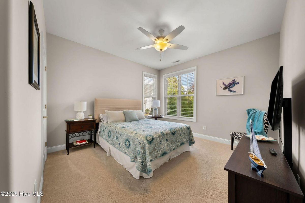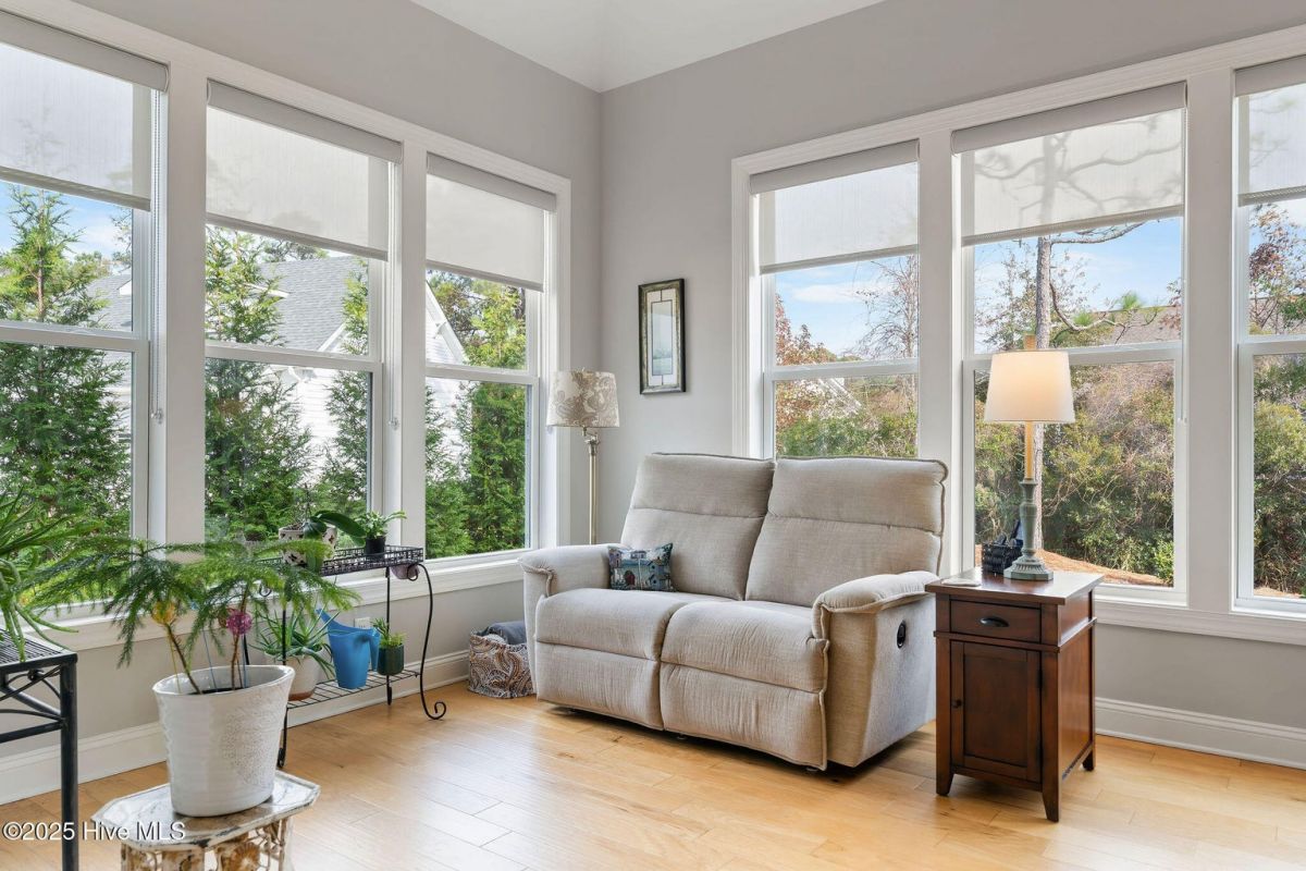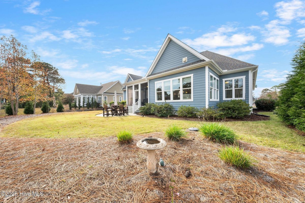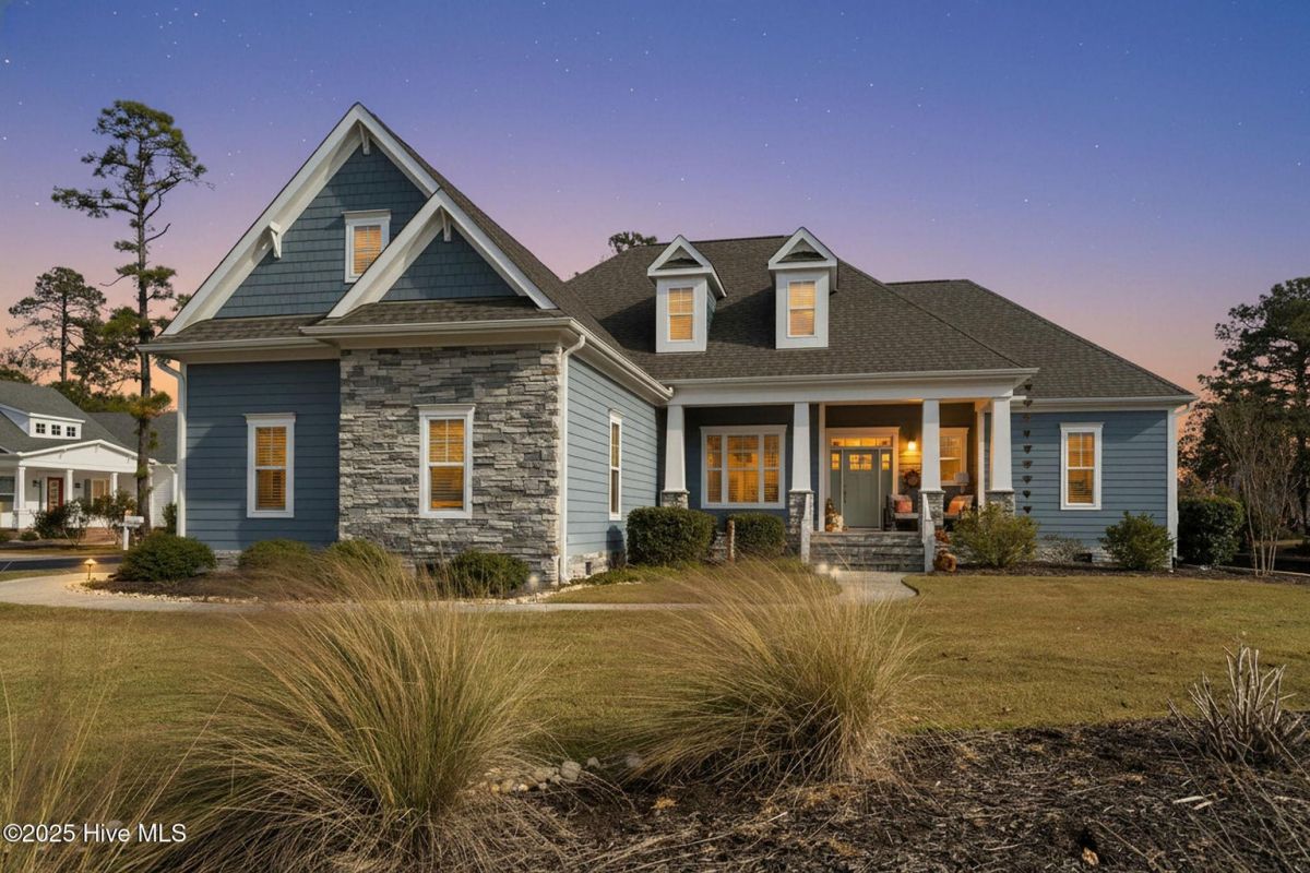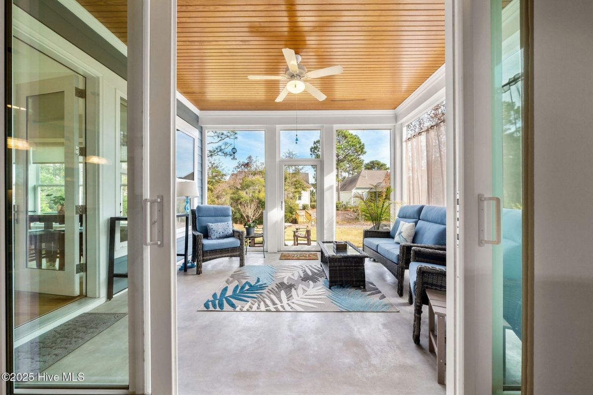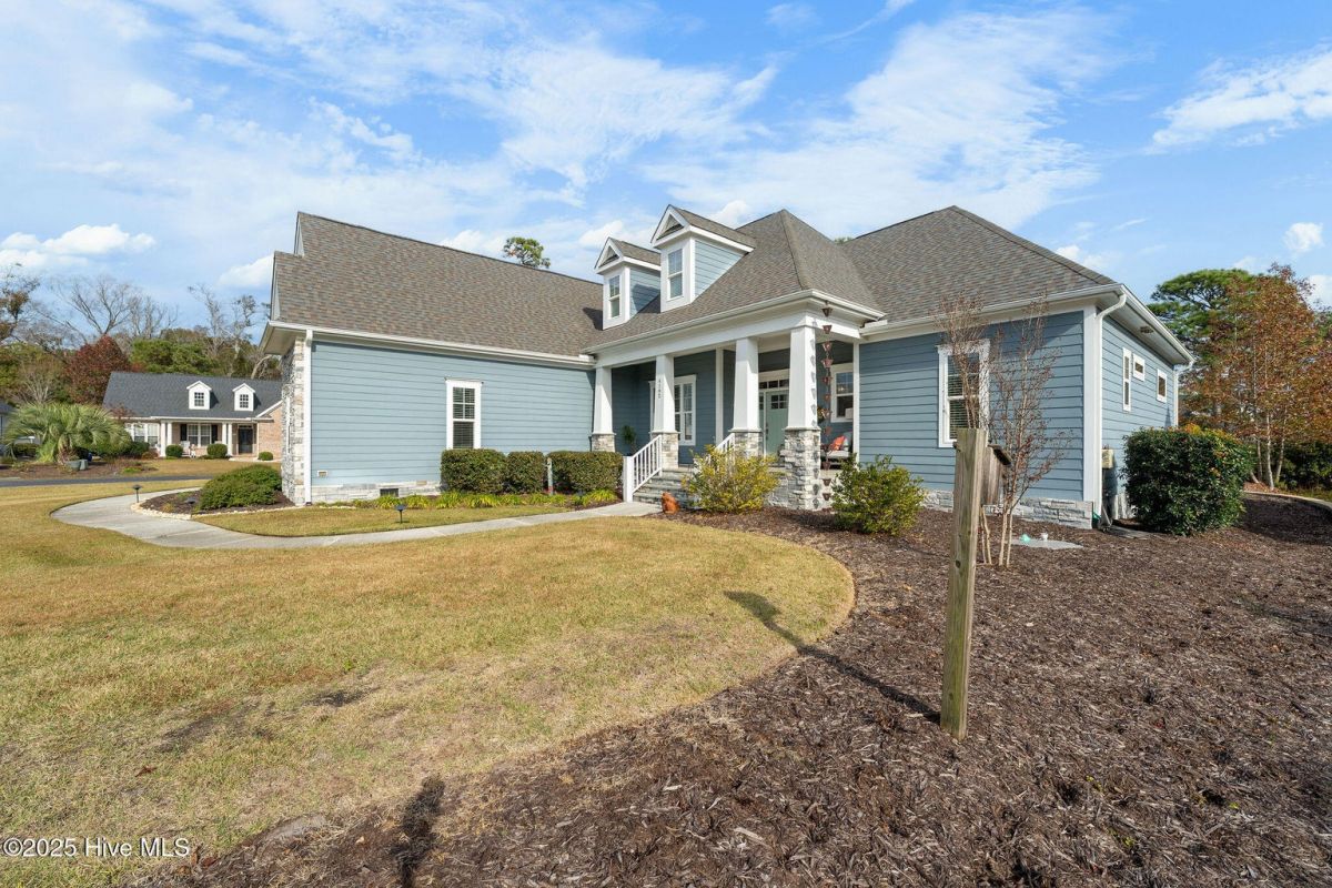 This beautiful coastal home located in St. James Plantation is within walking distance to the marina, water way park (a 10-acre outdoor fitness park located on the Intracoastal Waterway), and a great restaurant on the marina called Beacon 315. Impeccably maintained and newer built in 2018 by premier builder Barker & Canady, it offers the advantages of newer construction paired with refined craftsmanship and thoughtful design. The home features an open one-story living floor plan with a highly desirable split-bedroom design placing the primary suite on the opposite side of the guest bedrooms. Exceptional curb appeal sets the tone, highlighted by a welcoming rocking-chair front porch, manicured landscaping, and an attractive stone accent façade that adds warmth and architectural character. Inside, the open, light-filled living spaces feature hickory hardwood flooring, rounded corners, crown molding, and a tray ceiling dining room, creating a clean, timeless look. The kitchen is a true focal point, designed with both style and performance in mind. It features a white tile backsplash, sleek stainless steel hood and exhaust fan, gas cooktop, counter-depth refrigerator, beverage refrigerator, roll-out cabinetry, and a pantry with custom built-ins. The kitchen flows seamlessly into the great room, anchored by custom built-ins and enhanced by built-in speakers and custom shades ideal for both entertaining and everyday living. The primary suite, privately positioned on its own wing, offers a tray ceiling, generous walk-in closet, and a beautifully finished bathroom with a tiled walk-in shower. Two guest bedrooms are located on the opposite side of the home and share a well-appointed bathroom, complemented by a convenient half bath for guests. A standout feature of the home is the four-season sunroom, fully heated and cooled, providing year-round enjoyment and private views of the backyard. Just beyond, the screened porch features a stained beadboard wood ceiling, creating a warm and inviting outdoor living space perfect for enjoying the mild Carolina weather. A gas grill hookup and accent exterior lighting further enhance the outdoor experience. Additional features include a buried propane tank, central vacuum system, pull-down attic storage, and a utility closet designed for organization. The garage offers an epoxy floor, conditioned storage area, and an enclosed cabinet workbench complete with grinder and vise ideal for hobbies or projects. A laundry room sink and drop zone add to everyday convenience. The 3 wall mounted televisions will convey with the sale. Residents of St. James Plantation enjoy access to world-class amenities including golf, marina, private beach club, fitness facilities, walking trails, and dining, all just minutes from the charm of historic Southport. If you are searching for a nearly new home in St. James Plantation you have found it!