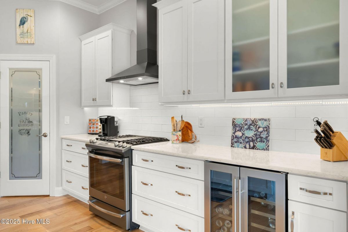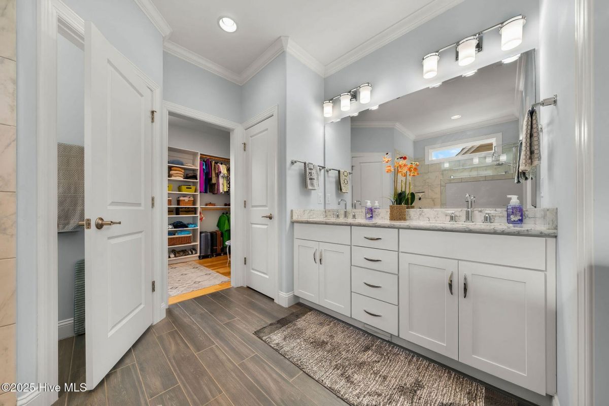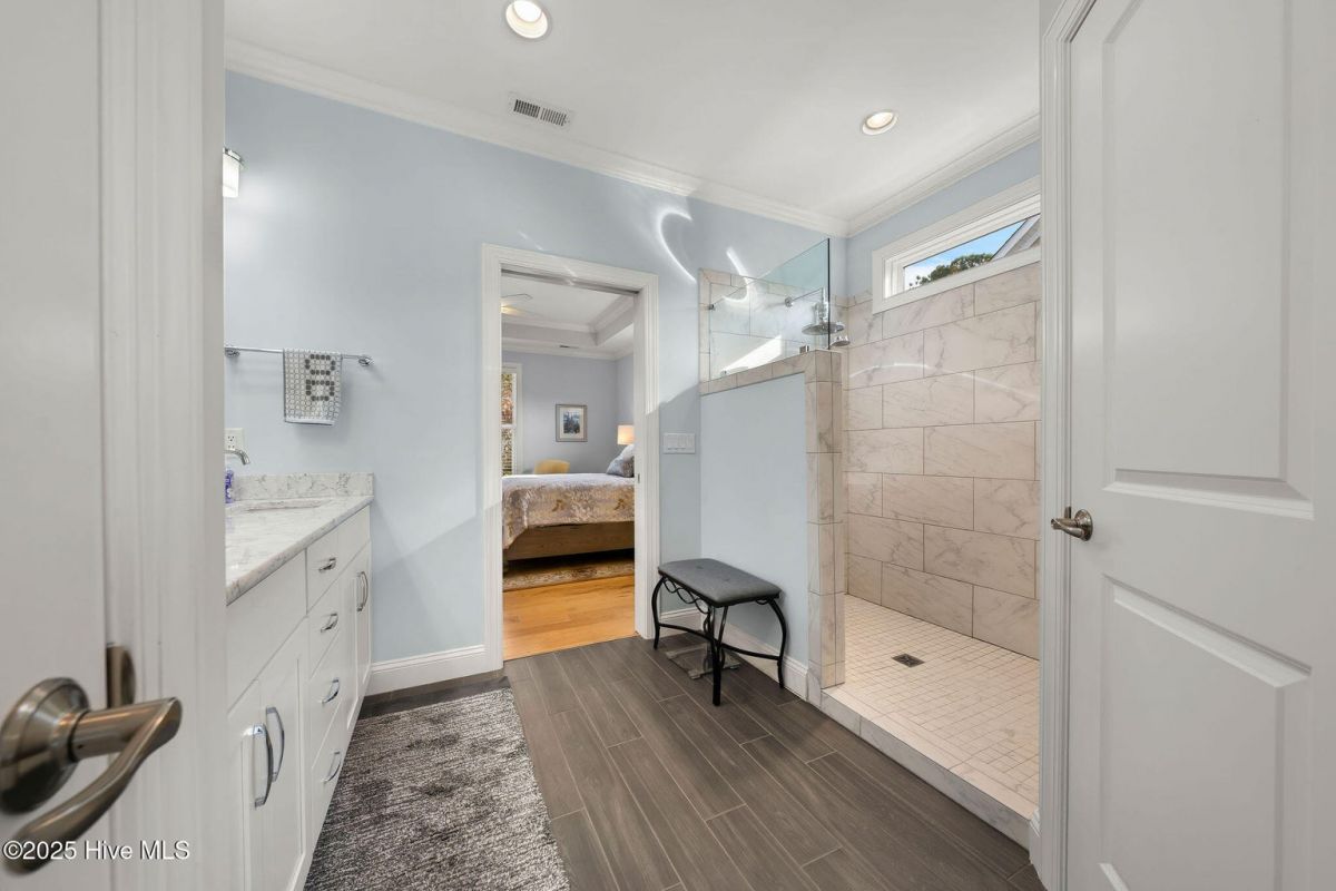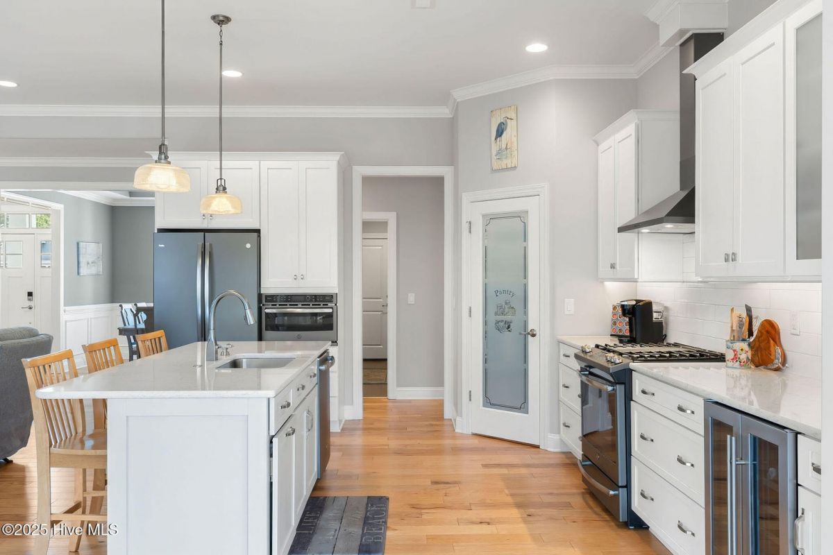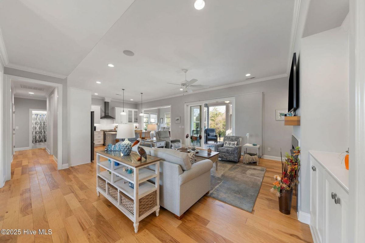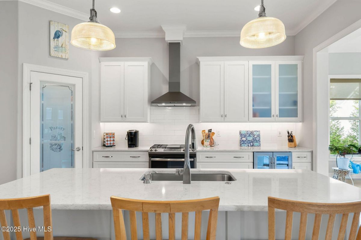 This beautiful coastal home located in St. James Plantation is within walking distance to the marina, water way park (a 10-acre outdoor fitness park located on the Intracoastal Waterway), and a great restaurant on the marina called Beacon 315. Impeccably maintained and newer built in 2018 by premier builder Barker & Canady, it offers the advantages of newer construction paired with refined craftsmanship and thoughtful design. The home features an open one-story living floor plan with a highly desirable split-bedroom design placing the primary suite on the opposite side of the guest bedrooms. Exceptional curb appeal sets the tone, highlighted by a welcoming rocking-chair front porch, manicured landscaping, and an attractive stone accent façade that adds warmth and architectural character. Inside, the open, light-filled living spaces feature hickory hardwood flooring, rounded corners, crown molding, and a tray ceiling dining room, creating a clean, timeless look. The kitchen is a true focal point, designed with both style and performance in mind. It features a white tile backsplash, sleek stainless steel hood and exhaust fan, gas cooktop, counter-depth refrigerator, beverage refrigerator, roll-out cabinetry, and a pantry with custom built-ins. The kitchen flows seamlessly into the great room, anchored by custom built-ins and enhanced by built-in speakers and custom shades ideal for both entertaining and everyday living. The primary suite, privately positioned on its own wing, offers a tray ceiling, generous walk-in closet, and a beautifully finished bathroom with a tiled walk-in shower. Two guest bedrooms are located on the opposite side of the home and share a well-appointed bathroom, complemented by a convenient half bath for guests. A standout feature of the home is the four-season sunroom, fully heated and cooled, providing year-round enjoyment and private views of the backyard. Just beyond, the screened porch features a stained beadboard wood ceiling, creating a warm and inviting outdoor living space perfect for enjoying the mild Carolina weather. A gas grill hookup and accent exterior lighting further enhance the outdoor experience. Additional features include a buried propane tank, central vacuum system, pull-down attic storage, and a utility closet designed for organization. The garage offers an epoxy floor, conditioned storage area, and an enclosed cabinet workbench complete with grinder and vise ideal for hobbies or projects. A laundry room sink and drop zone add to everyday convenience. The 3 wall mounted televisions will convey with the sale. Residents of St. James Plantation enjoy access to world-class amenities including golf, marina, private beach club, fitness facilities, walking trails, and dining, all just minutes from the charm of historic Southport. If you are searching for a nearly new home in St. James Plantation you have found it!