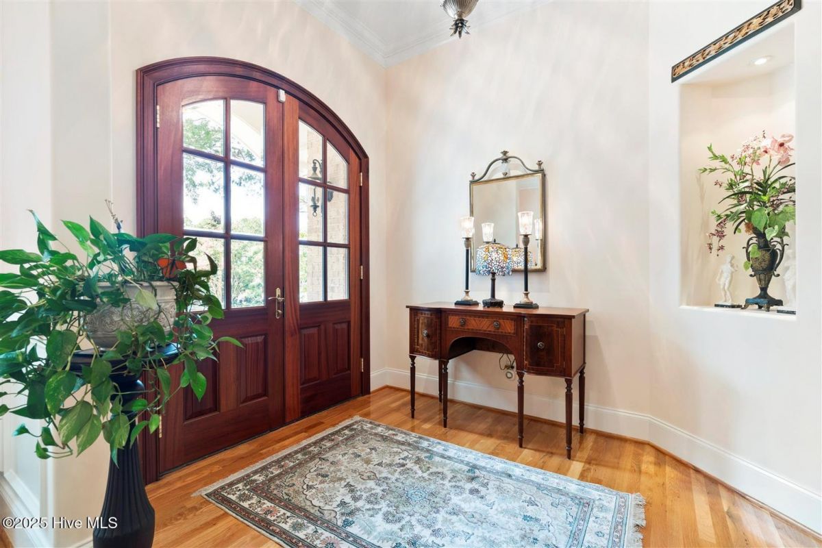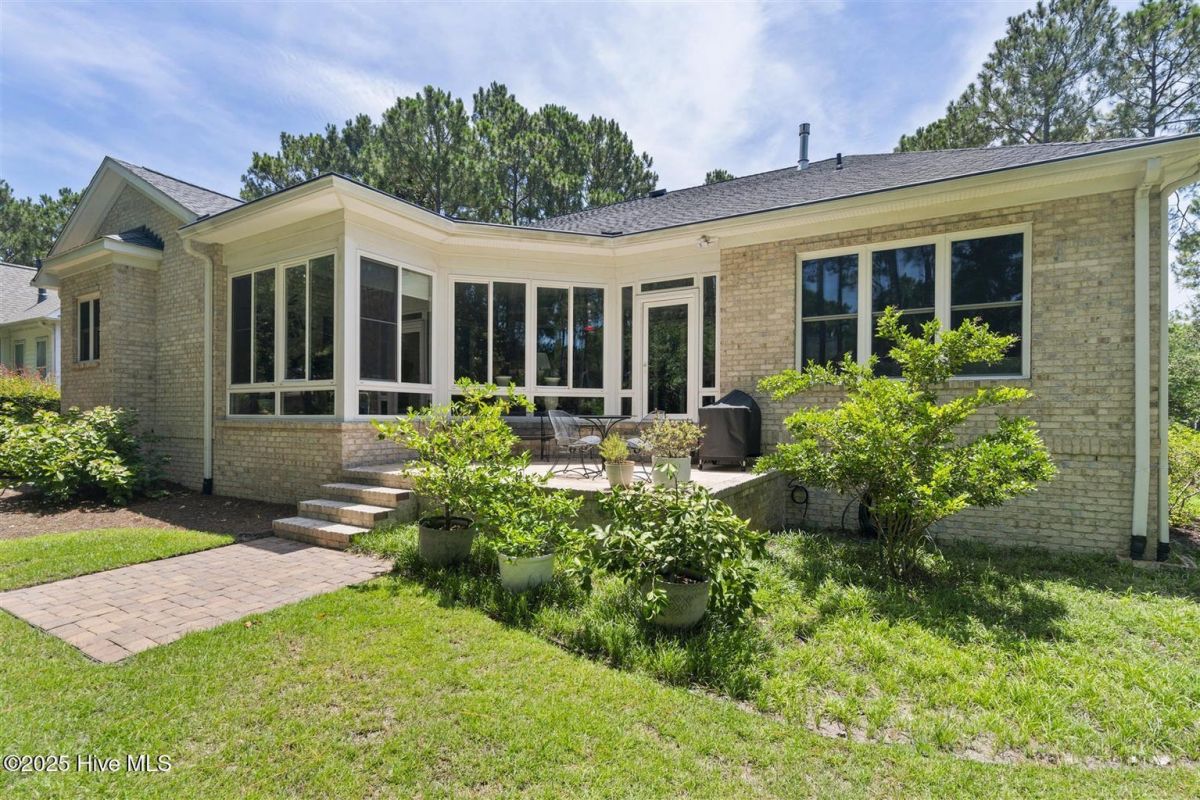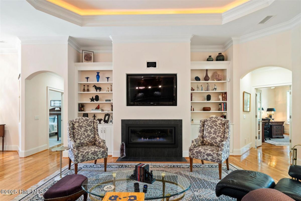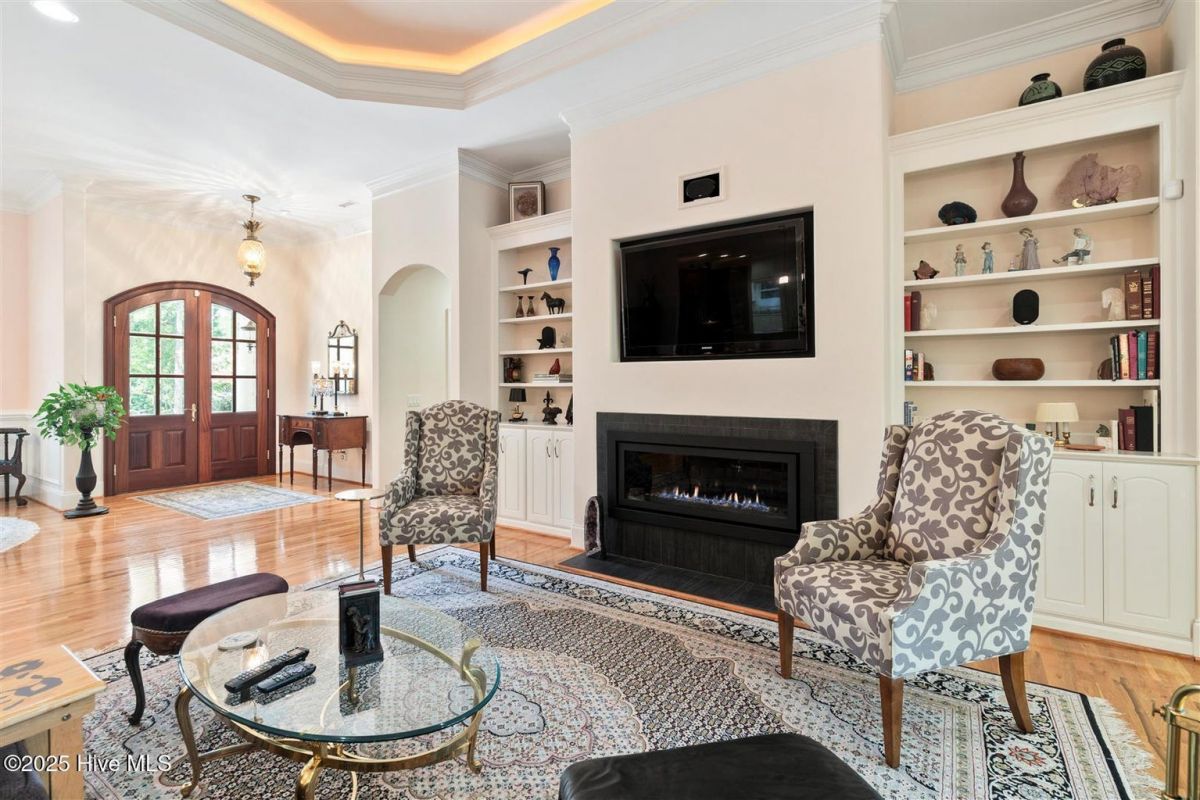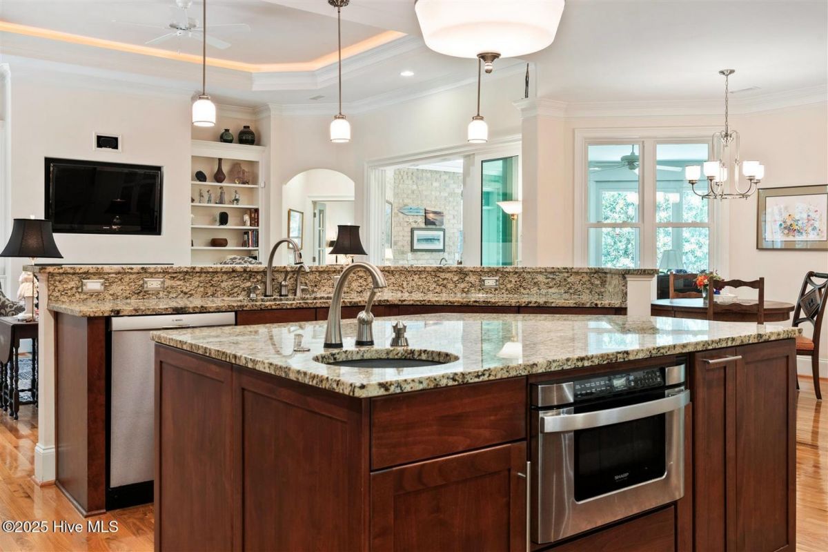 Enter through the gorgeous front door and discover elegance at its best! Gleaming Hardwood floors, a popular Open Floor Plan and large Sunlit rooms in over 4,000 square feet. The formal Dining room with a large beautiful window, wainscoting, trey ceiling with accent lighting opens to a spacious Great room. A very attractive Linear Gas Fireplace surrounded by built-ins and another trey ceiling with accent lighting makes this the perfect entertainment space. The Kitchen seamlessly blends functionality and style. Stainless steel appliances, two pantries, pull-out drawers, Thermador gas cooktop, KitchenAid double ovens, granite countertops and Food Prep Island are a chef's dream. You will love the Breakfast area with a beautiful built-in Display cabinet. The Carolina Room with telescoping glass doors opens to a large space that is inviting, light-filled and comfortable with backyard Nature views. Wet bar with beverage cooler and ice maker add to easy living! The Owners Suite is serene and spacious with a large closet. The spa-like Bath is generous with a heated floor, two vanities, granite countertops and a large tile shower. A large Laundry is conveniently located outside the Owners Suite. The split floor plan has two Guest Bedrooms and a full Bath affording privacy for you and your guests. A home Office and Powder room are also located on the main level. The outdoor Patio is located off the Carolina Room. Upstairs is a Flex Space with a full Bath and walk-in Closet that can be used as an additional bedroom or whatever you prefer. Garage is oversized and includes a conditioned storage room. A new Roof was installed in 2024. Please see upgrade list in Documents. Welcome Home to Coastal North Carolina!