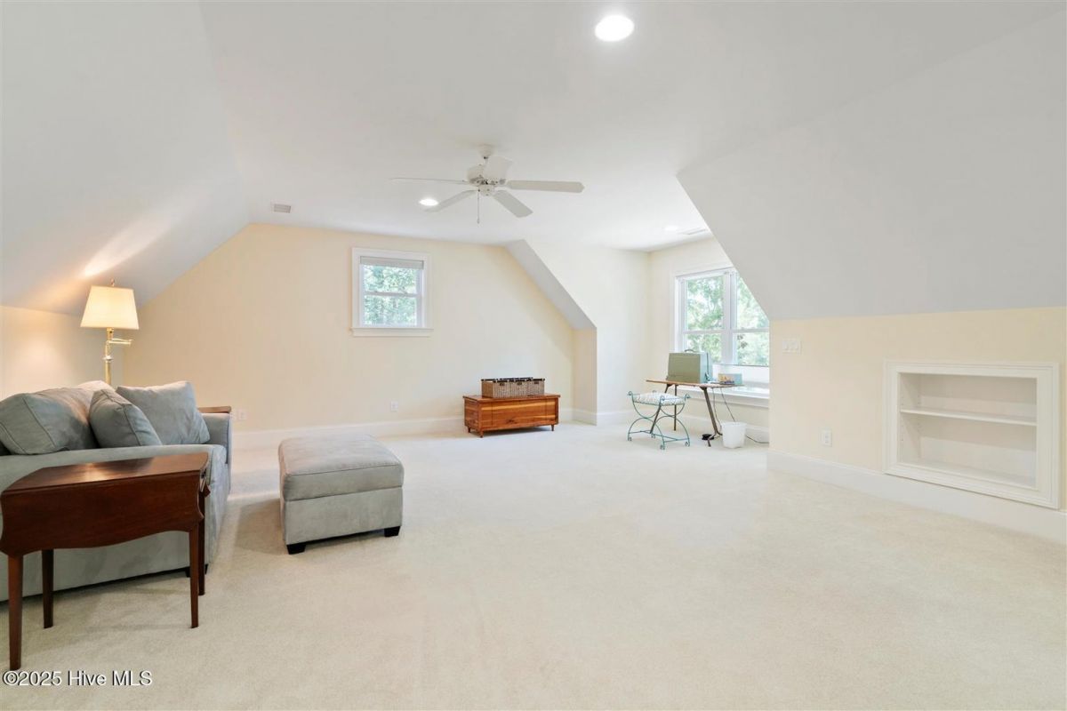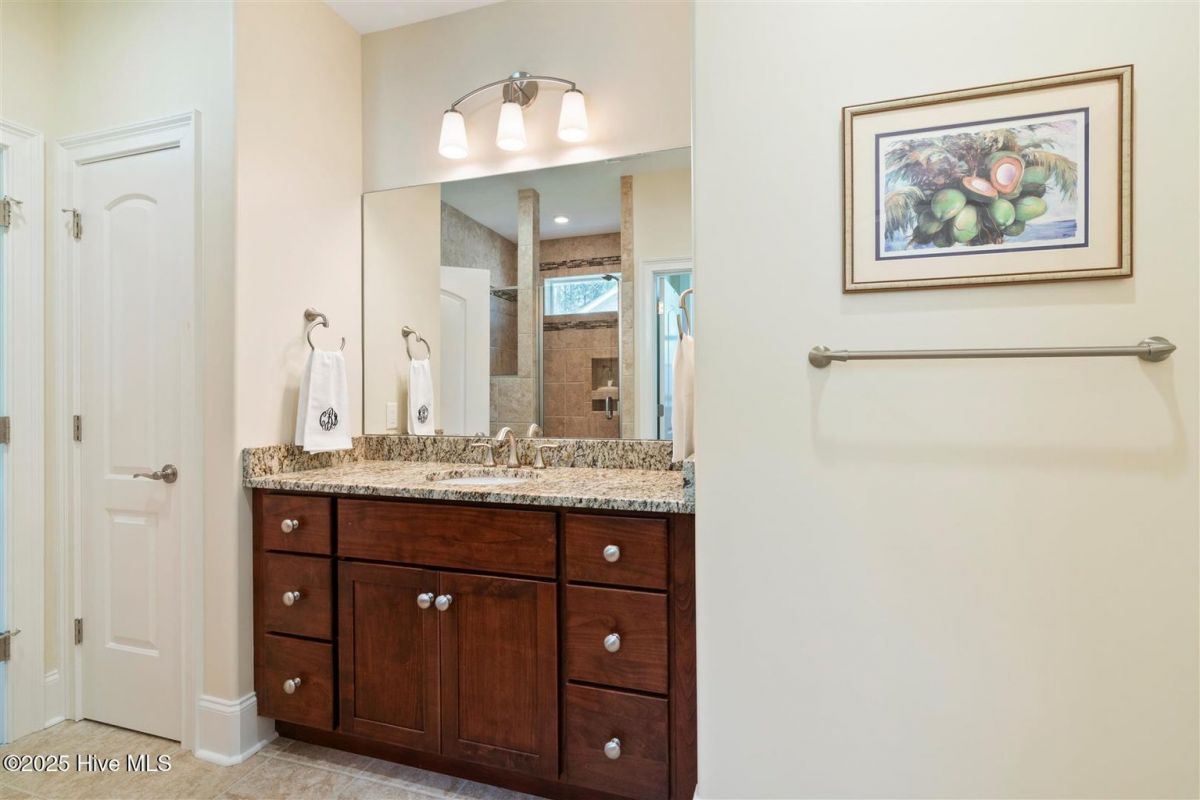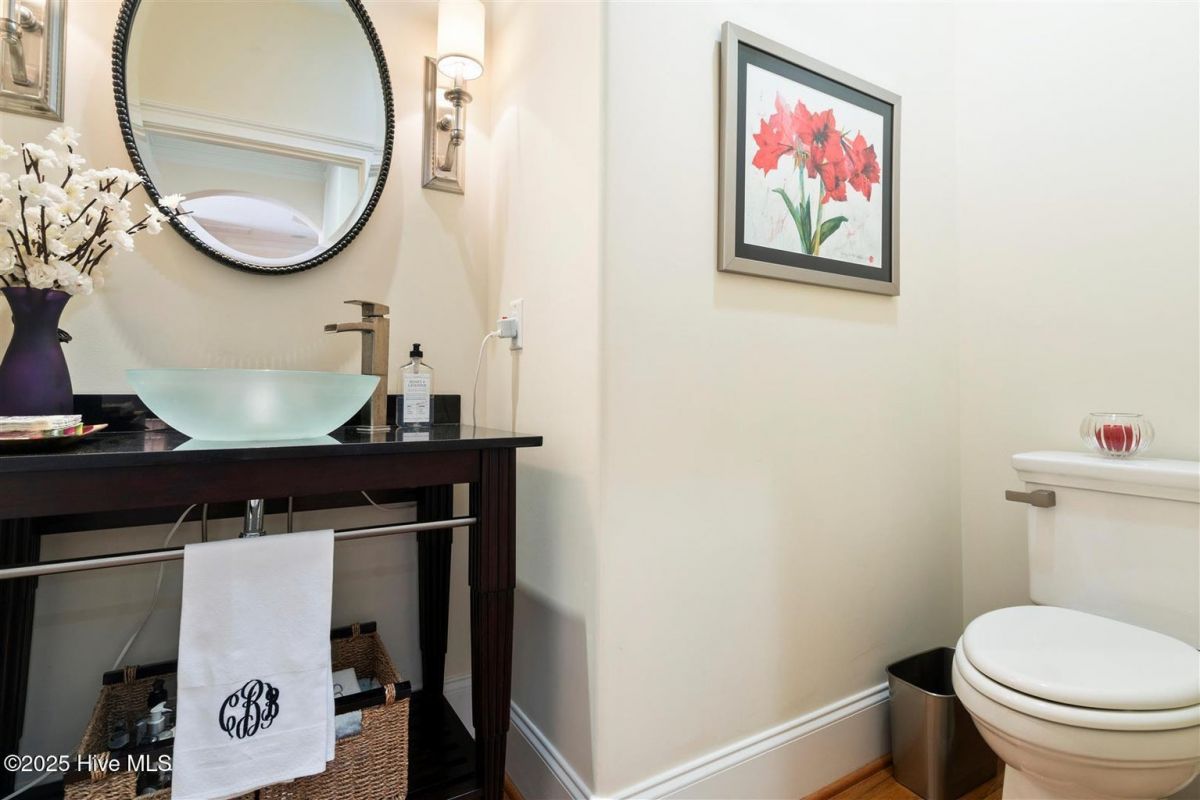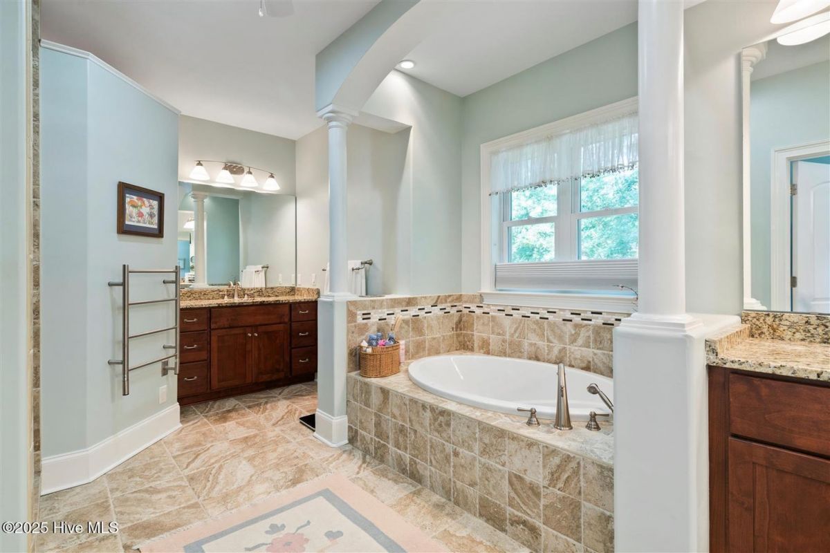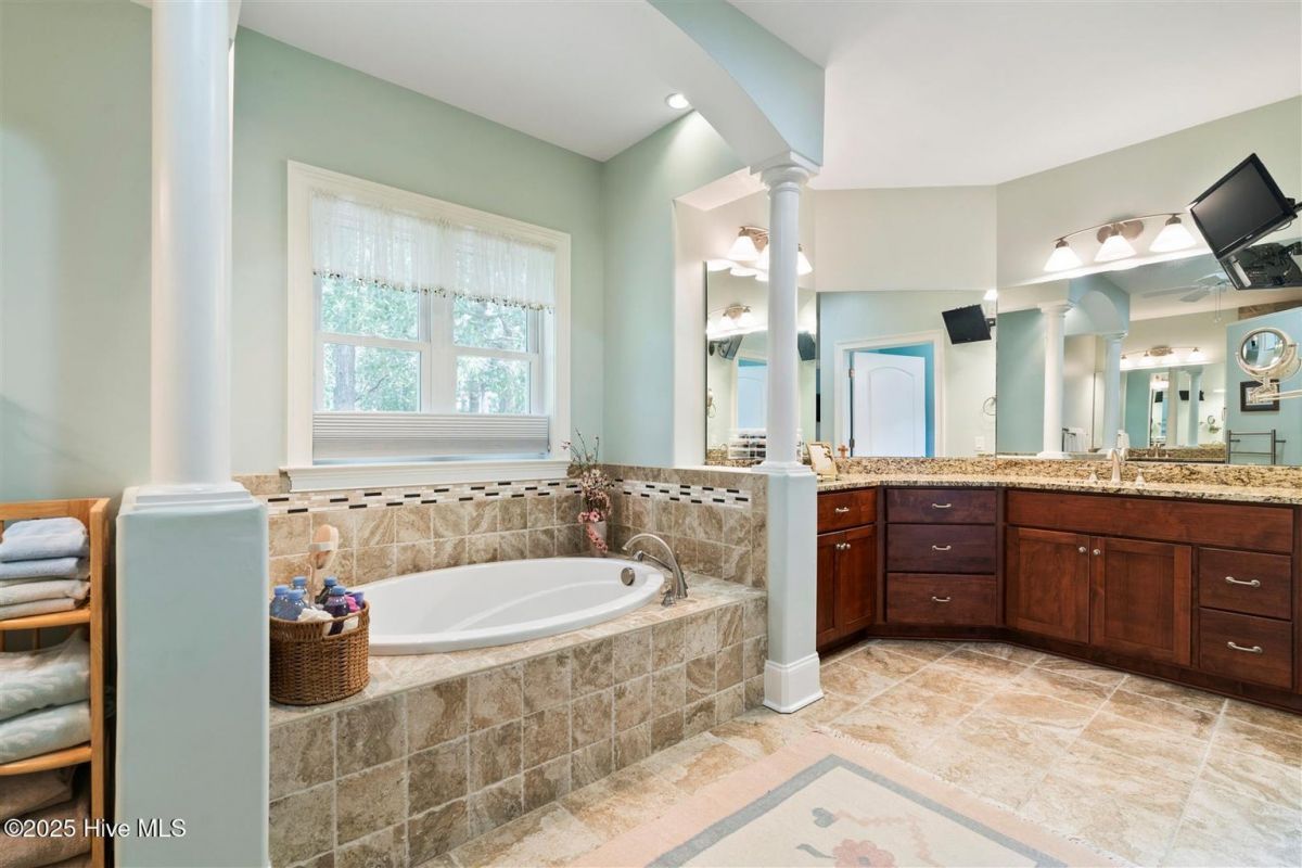 Enter through the gorgeous front door and discover elegance at its best! Gleaming Hardwood floors, a popular Open Floor Plan and large Sunlit rooms in over 4,000 square feet. The formal Dining room with a large beautiful window, wainscoting, trey ceiling with accent lighting opens to a spacious Great room. A very attractive Linear Gas Fireplace surrounded by built-ins and another trey ceiling with accent lighting makes this the perfect entertainment space. The Kitchen seamlessly blends functionality and style. Stainless steel appliances, two pantries, pull-out drawers, Thermador gas cooktop, KitchenAid double ovens, granite countertops and Food Prep Island are a chef's dream. You will love the Breakfast area with a beautiful built-in Display cabinet. The Carolina Room with telescoping glass doors opens to a large space that is inviting, light-filled and comfortable with backyard Nature views. Wet bar with beverage cooler and ice maker add to easy living! The Owners Suite is serene and spacious with a large closet. The spa-like Bath is generous with a heated floor, two vanities, granite countertops and a large tile shower. A large Laundry is conveniently located outside the Owners Suite. The split floor plan has two Guest Bedrooms and a full Bath affording privacy for you and your guests. A home Office and Powder room are also located on the main level. The outdoor Patio is located off the Carolina Room. Upstairs is a Flex Space with a full Bath and walk-in Closet that can be used as an additional bedroom or whatever you prefer. Garage is oversized and includes a conditioned storage room. A new Roof was installed in 2024. Please see upgrade list in Documents. Welcome Home to Coastal North Carolina!