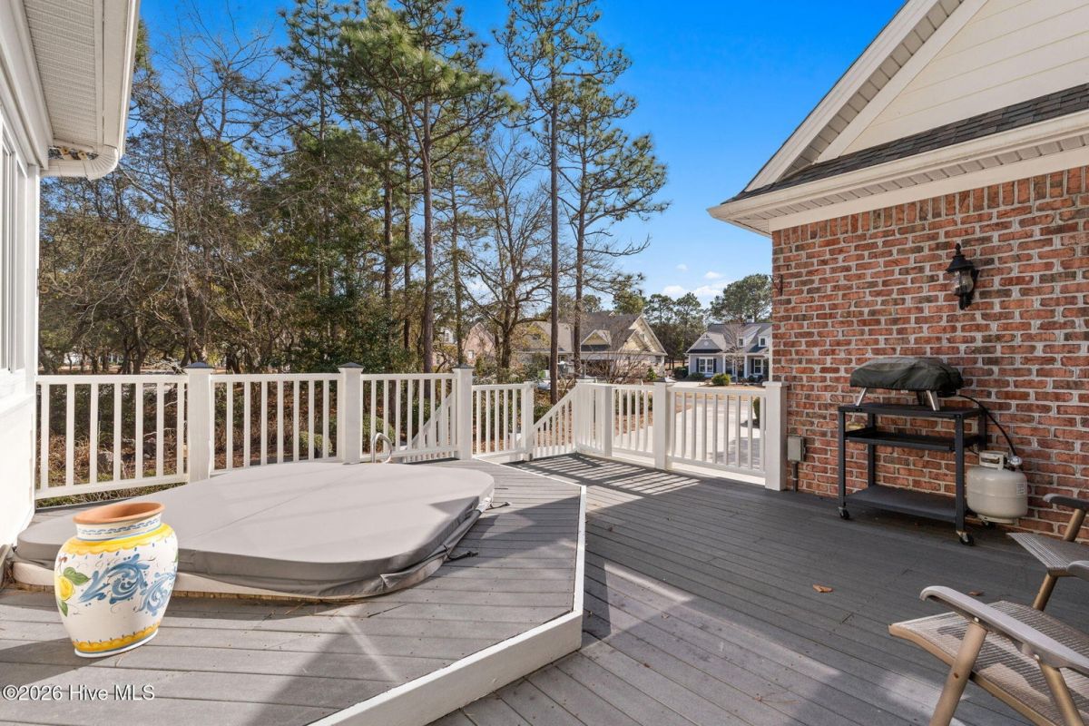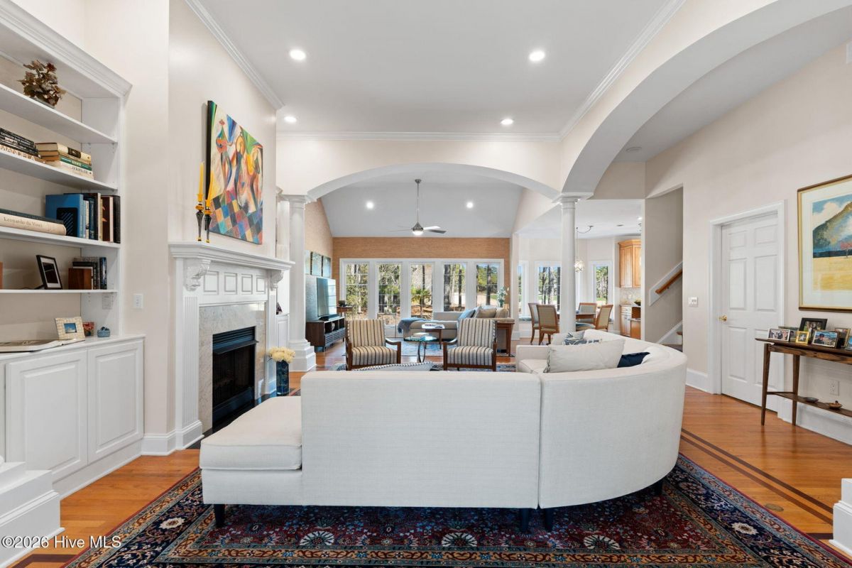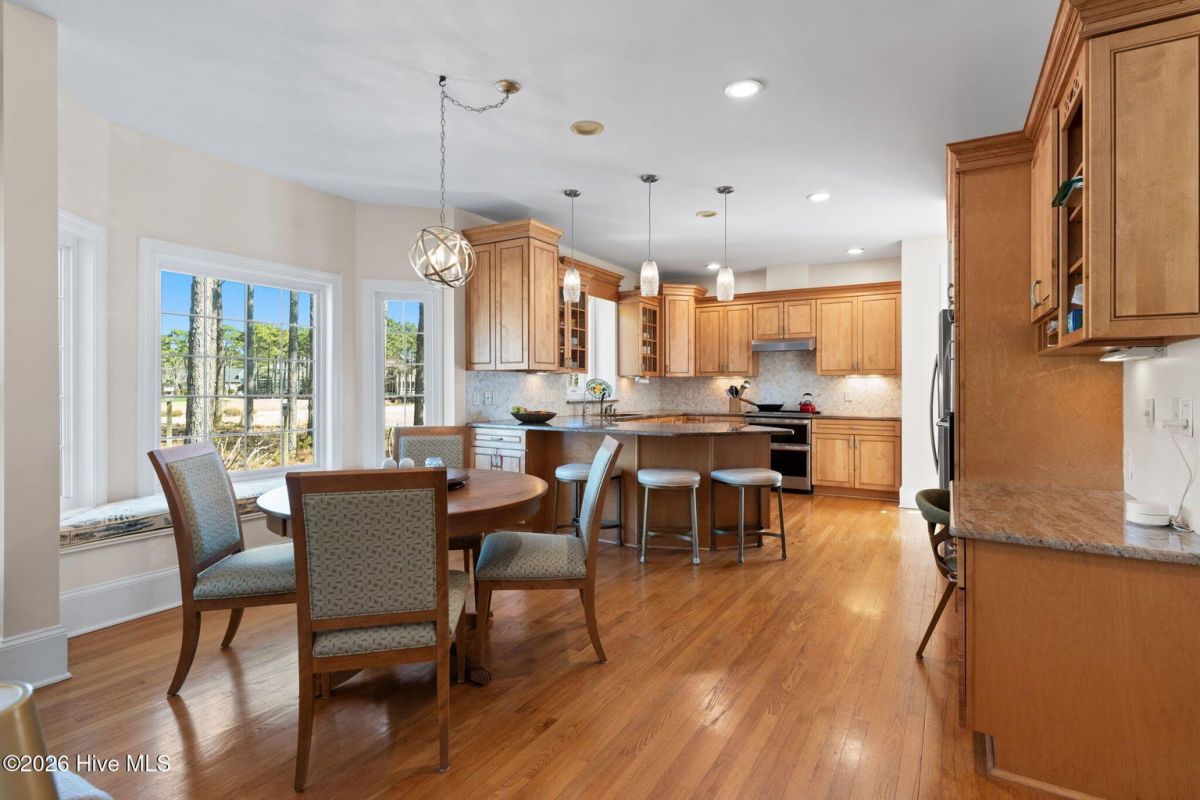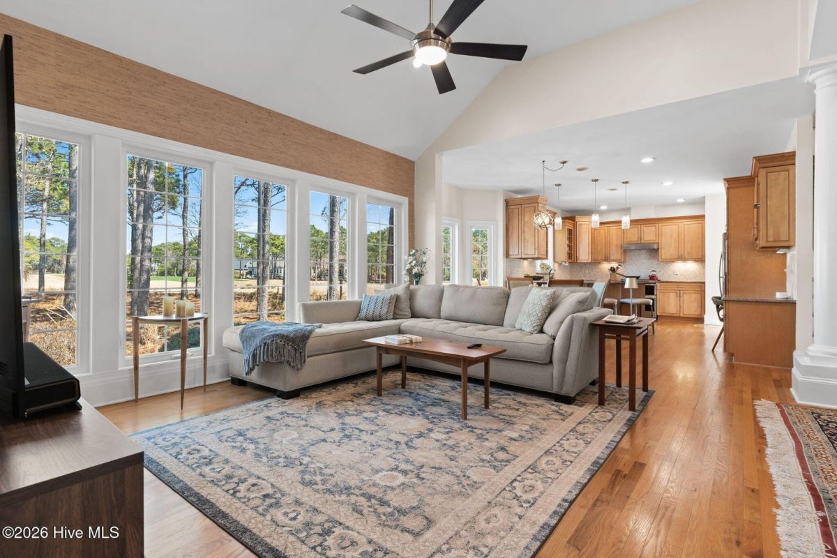 Perfectly poised along the 4th green of The Players Club, this distinguished executive residence captures sweeping, unobstructed golf course views and timeless elegance. Designed for the discerning buyer, the home blends refined craftsmanship with gracious indoor-outdoor living. Upon entry, expansive windows frame breathtaking fairway vistas, flooding the open floor plan with natural light. Soaring ceilings, curated architectural accents, and solid oak hardwood floors defined by a striking double maple inlay create a warm yet sophisticated aesthetic. Living area is anchored by a custom fireplace with inlaid Carrara marble, flanked by bespoke cabinetry. Library offers tranquil garden views filtered through a Japanese maple, while the formal dining room impresses with glass-front custom cabinetry, illuminated shelving, a granite sideboard. The butler's pantry elegantly appointed with granite countertops, glass cabinetry, under-cabinet lighting, and a wine fridge connecting to the chef's kitchen. Kitchen features abundant custom storage, pull-out cabinetry, double ovens, built-in wall oven and microwave, GE Profile silent dishwasher, reverse osmosis system, breakfast nook with built-in window seating overlooking a master gardener-designed English garden. The main-level primary suite is a private sanctuary with a bay window, expansive custom walk-in closet, and a spa-inspired bath adorned with chandelier lighting, leaded glass window, soaking tub, and multi-head walk-in shower. A discreetly enclosed laundry area enhances convenience. Upstairs, flexible living spaces include an office/project room, spacious guest bedroom, and an additional large suite w/ 2 built in bunks, room for seating and an additional king bed. Huge sunroom surrounded by windows and incredible views of the golf course and wooded area. Large deck is perfect for entertaining with hot tub. Garage with new mini split, high ceilings, work bench and room for 2 large cars. Recently reduced. One of the best deals in St James.