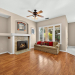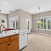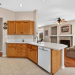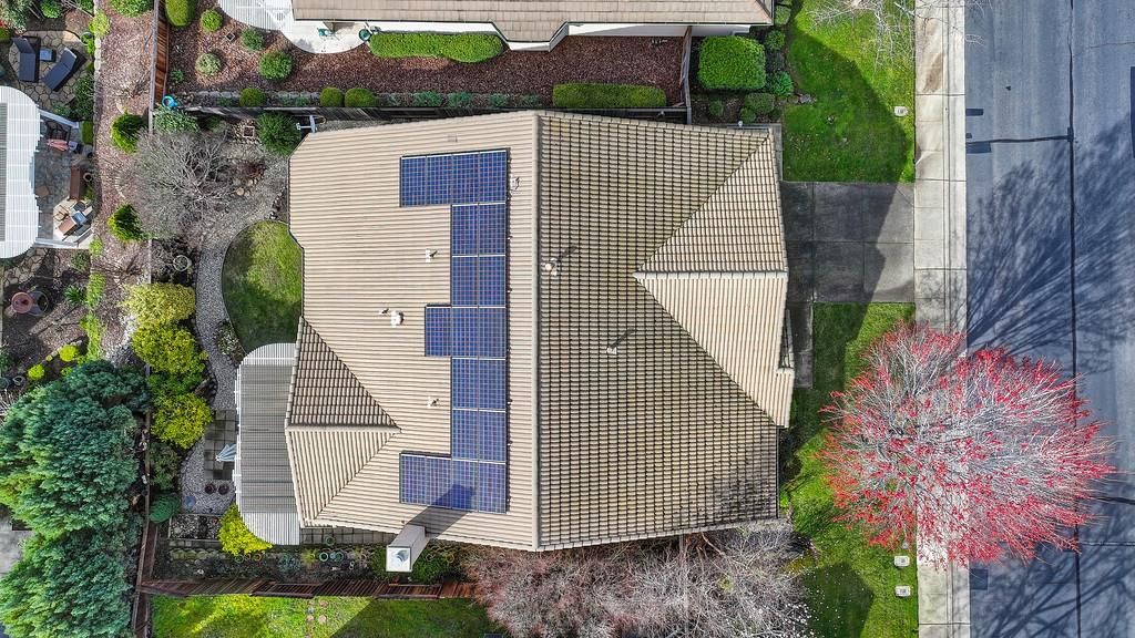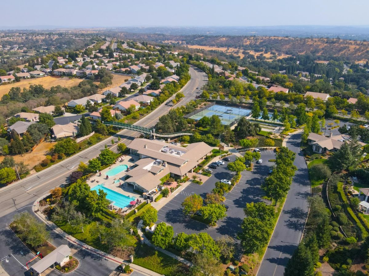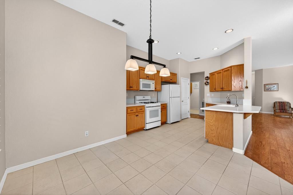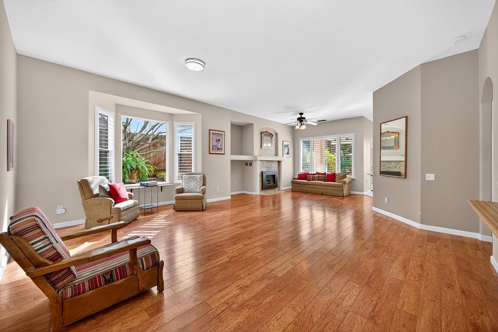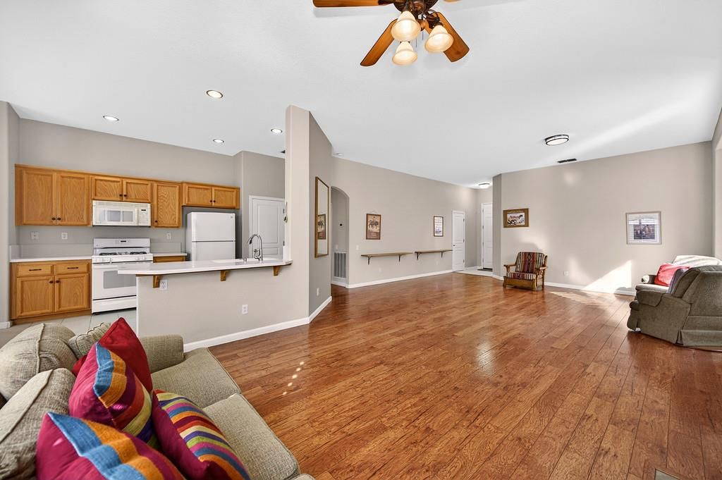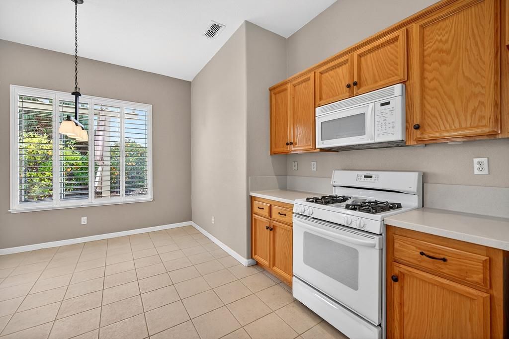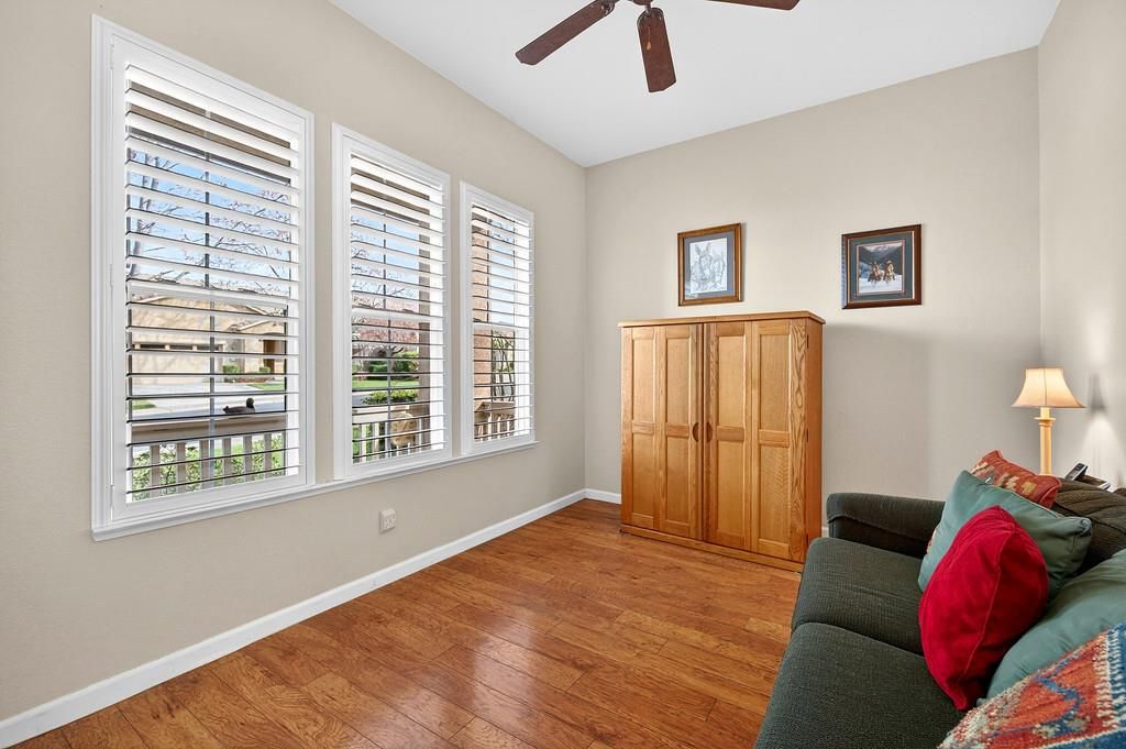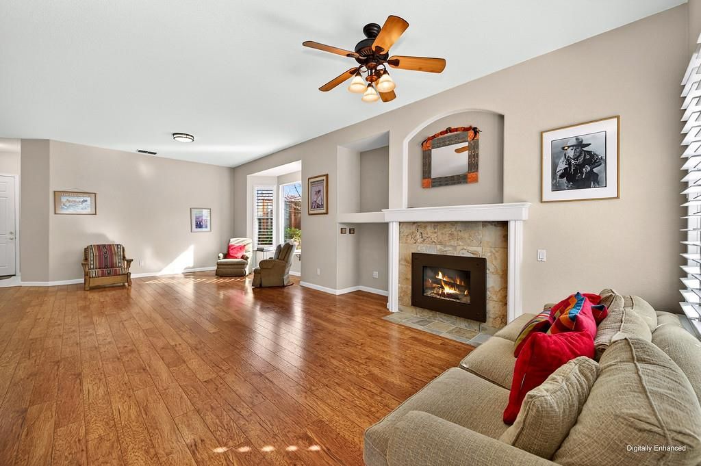 Welcome to Springfield a gated 55+ active adult community known for its exceptional lifestyle amenities and front-yard maintenance. This beautifully cared-for Perkins plan (1,699 sq ft) offers a desirable great-room design with 2 bedrooms + den and 2 full baths. It is truly move-in ready with no carpeting (laminate wood + tile flooring throughout). The open kitchen features Corian countertops, cabinetry with pull-out drawers, a newer Bosch dishwasher. Great room concept with a cozy gas fireplace w/remote. The spacious primary suite includes a huge walk-in closet plus a second closet for extra storage. You'll also appreciate the finished garage with pull-down ladder attic access and impressive added storage, including a large built-in wood shelf. Step outside to a charming backyard with a covered patio, lemon and orange trees, and a small grassy area perfect for relaxing or entertaining. Additional highlights include solar and a newer (2021) HVAC system. Ideally located near the clubhouse and amenities: two pools, spa, library, two tennis courts, eight pickleball courts, and two bocce ball courts, plus clubs, activities, and more. Nearby, enjoy the Johnny Miller-designed golf course with restaurant/bar and pro shop. Wonderful location just two blocks to clubhouse! A few of the photos are digitally altered. Only the fireplace flame was added by photographer.
