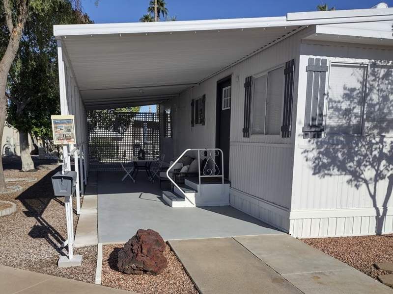 Absolutely charming and move-in ready! This immaculate 1-bedroom, 1-bath home is thoughtfully updated for modern comfort. Step into the bright kitchen featuring a brand-new refrigerator and microwave, plus a custom kitchen island with a stunning, durable quartz countertop and convenient breakfast bar—perfect for casual dining. The living room offers new carpeting, complemented by newer laminate flooring throughout the rest of the home. New cellular shades on every window enhance energy efficiency and add a stylish touch. Enjoy relaxing or entertaining on the patio, where new latticework and mature shade trees keep the area cool, even on the hottest days. The separate laundry/workshop area has been renovated and includes a brand-new washer and dryer, along with plenty of storage space. The exterior boasts fresh paint, including awnings, a recently re-coated foam roof with a 12-year APCO product applied twice, and new vinyl skirting professionally installed by Mesa Awnings. Custom décor by the owner adds a personal, welcoming feel throughout. Located in the vibrant 55+ community of Citrus Gardens in Mesa, AZ, residents can take advantage of beautifully landscaped grounds, two sparkling swimming pools, and a clubhouse perfect for social events and activities. With nearby shopping, dining, and entertainment, Citrus Gardens offers the ideal blend of relaxation and convenience. Call today to schedule your private tour!