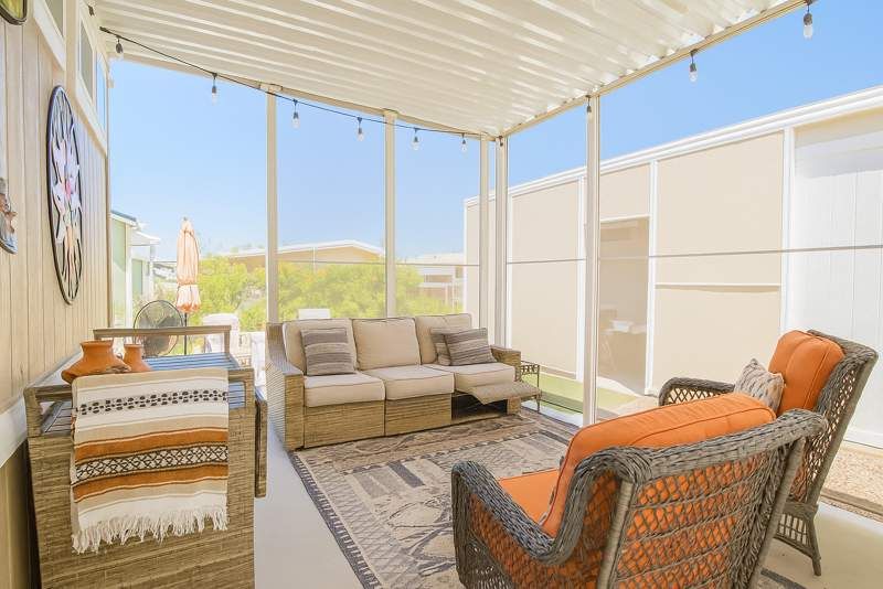 Welcome to this impeccably maintained 3-bedroom, 2-bathroom Cavco home, built in 2020 and located in the sought-after Dorado Canyon community of Mesa, AZ. Spanning 1,456 square feet, this residence offers a perfect blend of style, functionality, and comfort. Step inside to an open-concept layout featuring a sleek, modern kitchen with stainless steel appliances, ample cabinetry, and a spacious island that’s perfect for meal prep and casual dining. The bright and airy living room showcases large windows, recessed lighting, and plenty of space to relax or entertain. Just off the kitchen, a separate dining area is surrounded by floor-to-ceiling windows, flooding the space with natural light. The primary suite is a true retreat with an oversized bedroom, walk-in closet, and en-suite bathroom complete with dual sinks and a walk-in shower. Two additional bedrooms offer flexibility for guests, hobbies, or a home office, and both bathrooms include stylish finishes and modern fixtures. Additional features include a dedicated laundry room with built-in shelving, a cozy screened-in patio ideal for lounging or watching TV outdoors, a custom paver patio with seating and mature landscaping, and a fully enclosed shed for extra storage. Located in the vibrant 55+ Dorado Canyon community, residents enjoy amenities such as a clubhouse, pool, fitness center, and a variety of social activities. With convenient access to shopping, dining, and entertainment in Mesa, this move-in-ready home offers an exceptional lifestyle in a friendly, well-kept neighborhood. Come experience the comfort, quality, and charm this beautifully appointed home has to offer!