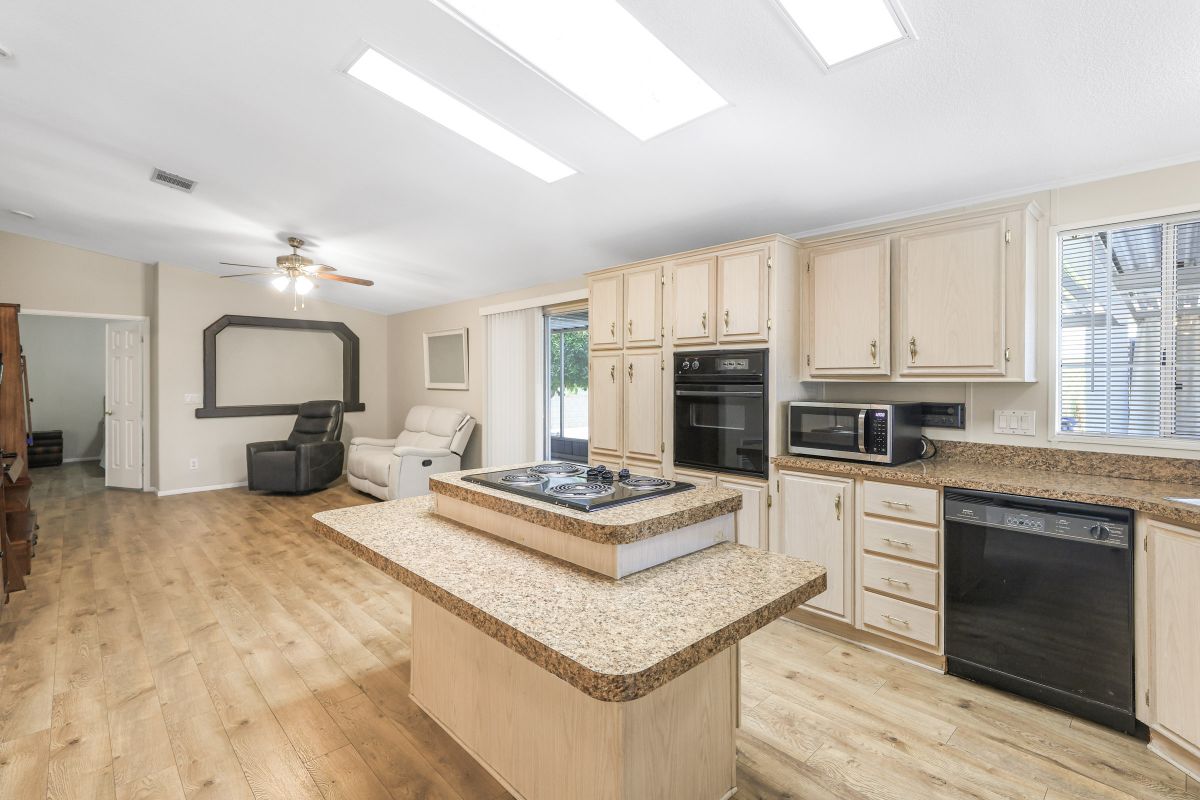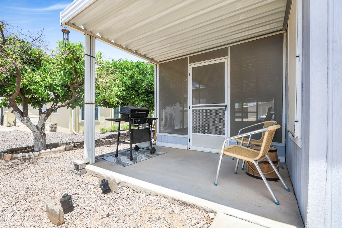 Spacious 1,708 sq. ft. Cavco with 2 beds, 2 baths, small office/den, and screened AZ room. Features laminate flooring, open great room, island kitchen with cooktop, breakfast bar, and extra cabinets. Master bath has tiled, handicap-accessible shower and dual sinks. Updates: New roof (2023), new A/C & heat (2025), new plumbing (2024), new awning (2023). Dual pane windows, ceiling fans, and tape/textured walls throughout. Shed includes washer/dryer and golf cart door. Side-by-side parking—don’t miss this move-in ready gem! Call to schedule your personal tour today! (480) 325-1161
