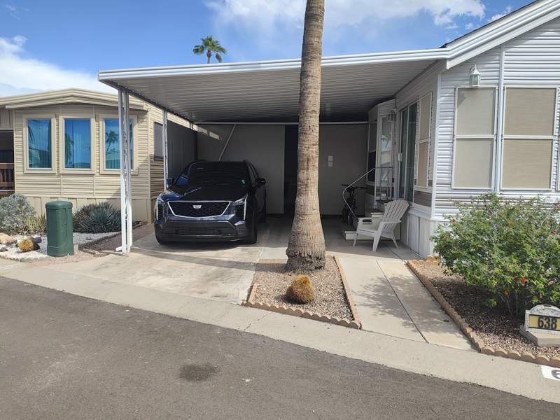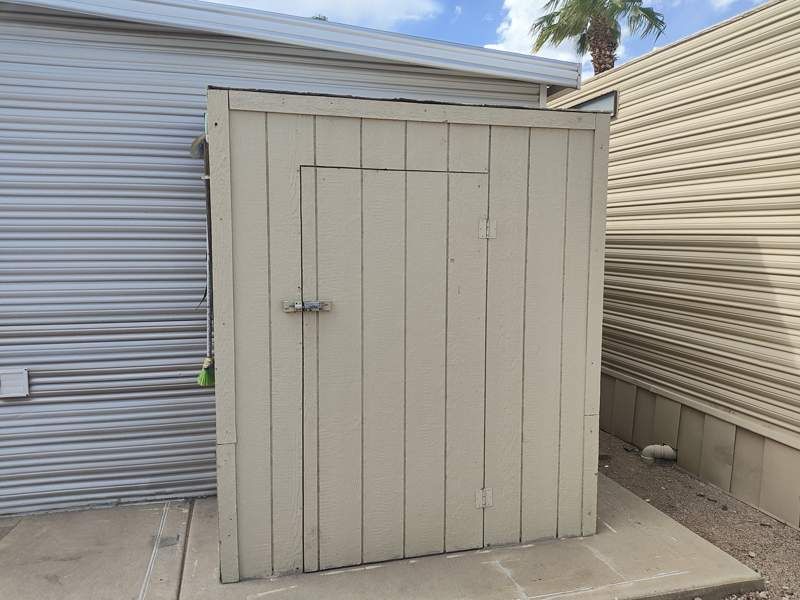 This charming 385 square foot Park Model home in the Rock Shadows community of Apache Junction, AZ, offers cozy living with 1 bedroom and 1 bathroom. Built in 1998 by Cavco, this well-maintained home features a spacious living room, dining area, master bedroom, and a fully-equipped kitchen with modern appliances. The Arizona room provides additional living space and offers a serene spot to relax and enjoy the beautiful desert surroundings. With a carport, shed, patio, aluminum siding, and a flat roof, this home offers both convenience and durability. Rock Shadows in Apache Junction, AZ, is a welcoming community for those seeking an active lifestyle in a picturesque setting. Residents can enjoy amenities such as a clubhouse, swimming pool, and organized activities and events. The community is conveniently located near shopping, dining, and outdoor recreation opportunities, making it a perfect choice for those looking to experience the beauty of the Arizona desert. With friendly neighbors and a peaceful atmosphere, Rock Shadows provides a comfortable and enjoyable living environment for residents to call home.