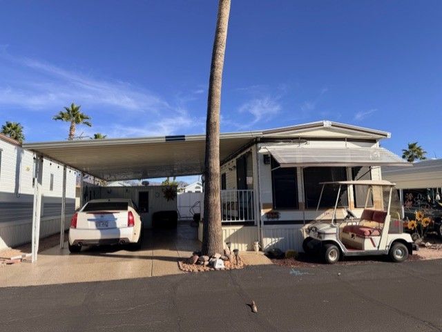 This beautifully maintained park model offers comfort, space, and thoughtful upgrades throughout. The home features an exceptionally large bathroom and is kept comfortable year-round with efficient mini-split systems. Outside, you’ll find a spacious driveway with a seating area perfect for relaxing or entertaining, plus a private backyard space ideal for soaking up the sunshine with a good book. A storage shed includes a full-size washer and dryer, along with an extra full-size refrigerator/freezer for added convenience. As an added bonus, the home comes fully equipped with a car and a golf cart, making this a truly turnkey opportunity. This is a well-cared-for property that’s ready to enjoy immediately.