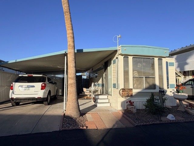 Charming 1983 Park Model with Spacious Tip-Out & Outdoor Entertaining This inviting 1983 park model features a full tip-out, adding extra square footage for a spacious yet cozy feel. Fully furnished inside and out, the living room includes a comfortable sofa with pullout for guests and two plush recliners. The dining area features a full table and chairs, and the kitchen is equipped with a new refrigerator, stove, and countertop microwave. Adjacent to the dining area, a countertop bar flows into a hallway desk area, perfect for a cute home office area. The bedroom offers a queen bed and a stackable washer and dryer tucked neatly into a closet. Comfort is ensured with baseboard heaters and a new portable air conditioner. Outside, two sheds provide ample storage or workspace for projects, while the large patio is perfectly set up for entertaining with seating, tables, a TV, ice maker, grill area, and decorative lighting for evening enjoyment. Conveniently located near the community center and swimming pools, this home combines comfort, functionality, and an ideal location for active community living. The Reserve at Lost Dutchman is a vibrant community offering a range of amenities for its residents to enjoy. Community members have access to a clubhouse, swimming pool, and fitness center, providing the perfect setting for social gatherings and staying active. The community is conveniently located near shops, restaurants, and outdoor recreational opportunities, making it a desirable place to call home in the beautiful Arizona landscape.