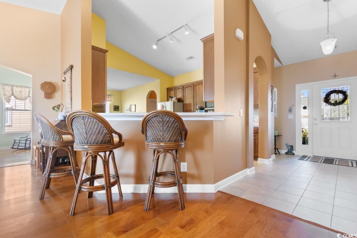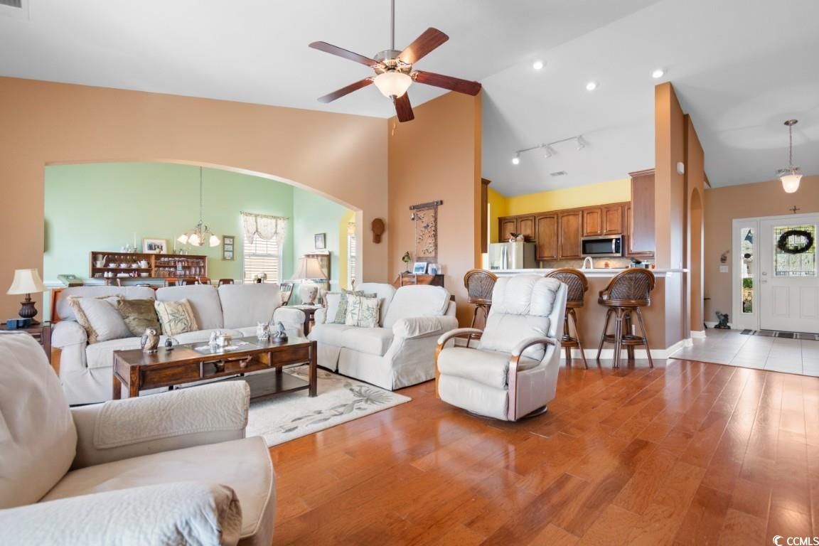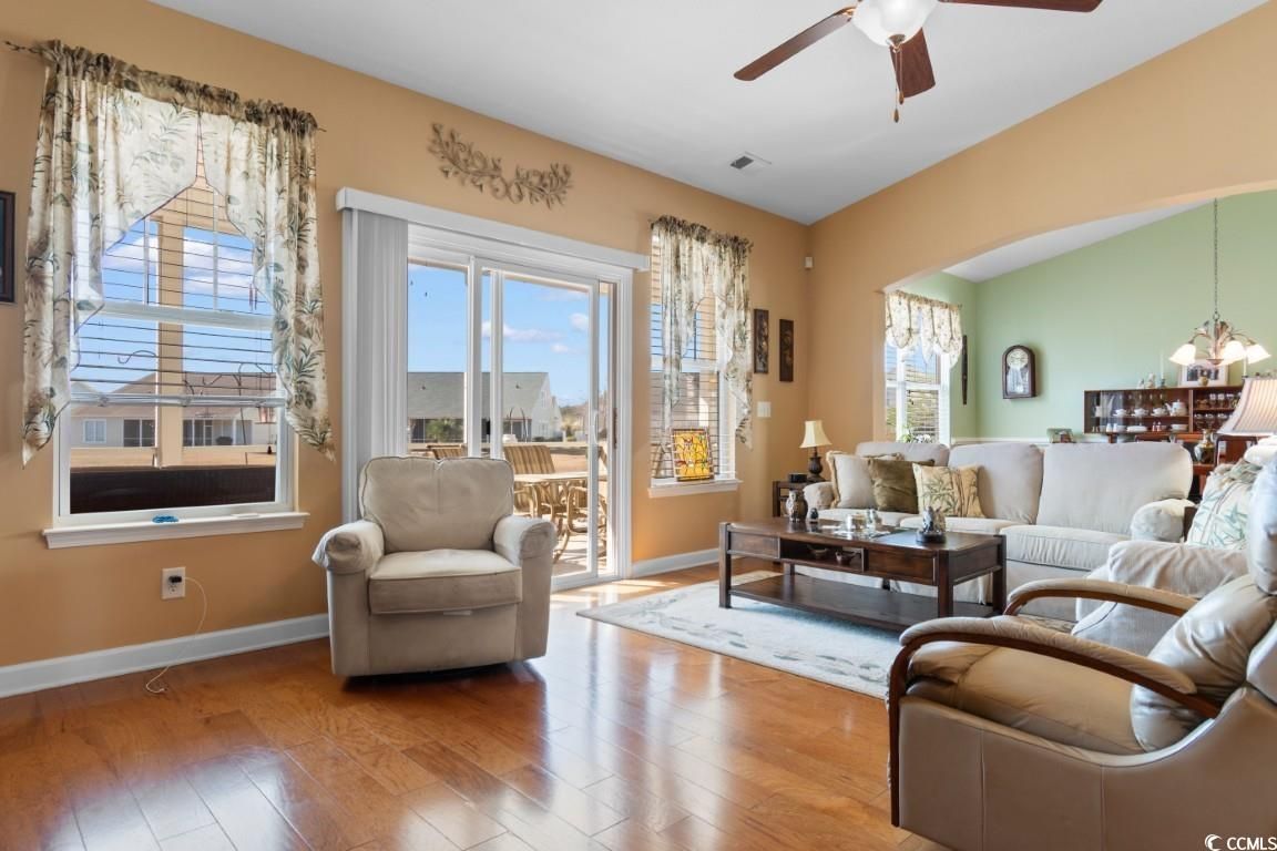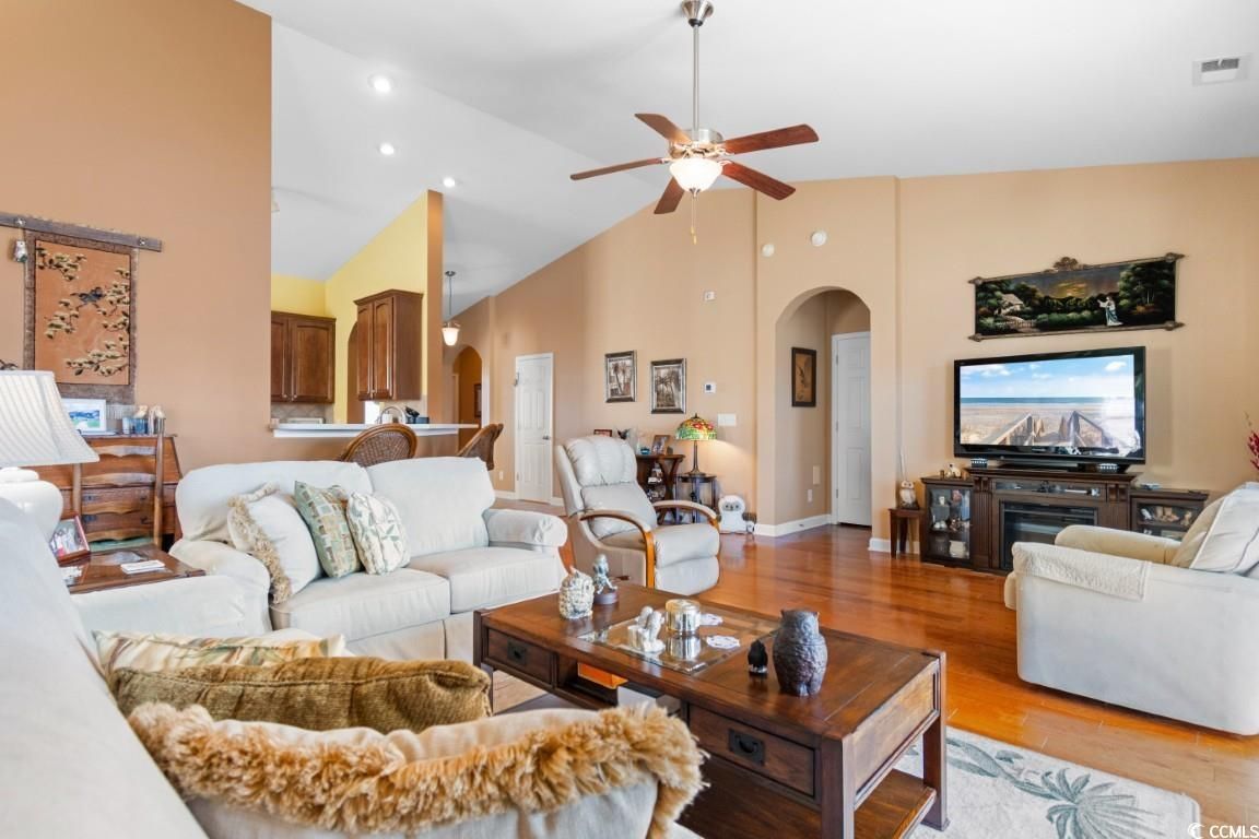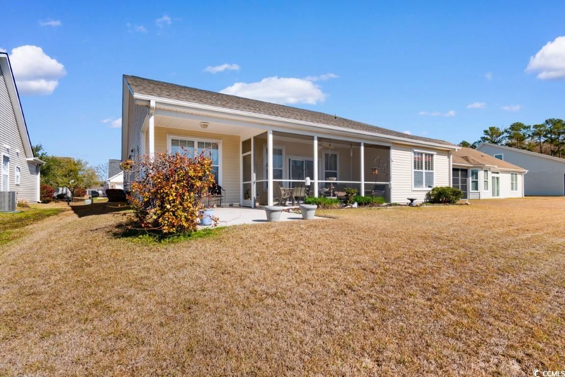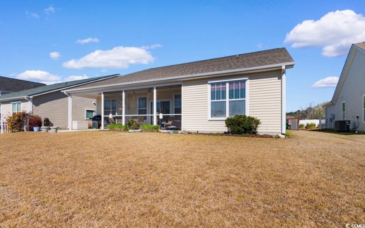 Welcome to 616 Sabel Springs Way, a charming single-family home in the desirable Cameron Village community of Myrtle Beach, SC. This well-maintained 3 bedroom 2.5 bathroom residence offers an open floor plan with tall vaulted ceilings and luxurious hardwood floors, providing ample space for relaxation and entertainment. Equipped with modern fixtures and appliances, the home ensures a comfortable living experience. The property features a beautifully manicured lawn, screened in porch with an extended concrete patio, and a backyard overlooking the pond, perfect for outdoor activities and enjoying the Myrtle Beach climate. Other features include a central vacuum, washer/dryer included with sale, several closets throughout the home for added storage, along with an attic space above the garage for even more added convenience as well as hurricane shutters. Residents of Cameron Village enjoy access to top-tier amenities, including community pools, a clubhouse, a playground, basketball and tennis courts, sidewalks, and pet stations. Conveniently located, this home is just minutes from grocery stores, shopping centers, restaurants, award-winning schools, medical centers, and the stunning beaches of Surfside Beach, only six miles away. Don't miss the opportunity to experience the best of Myrtle Beach living?schedule your showing today!