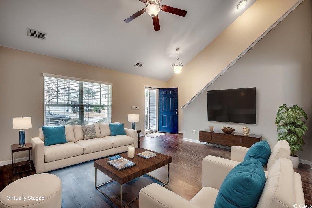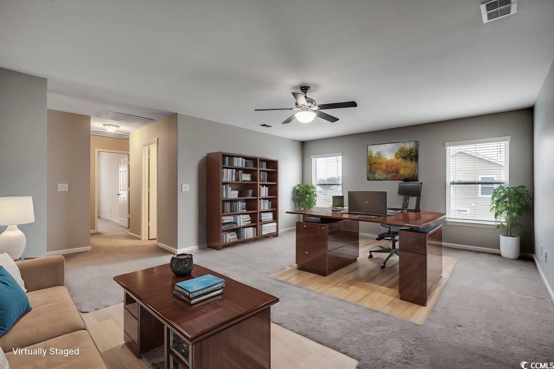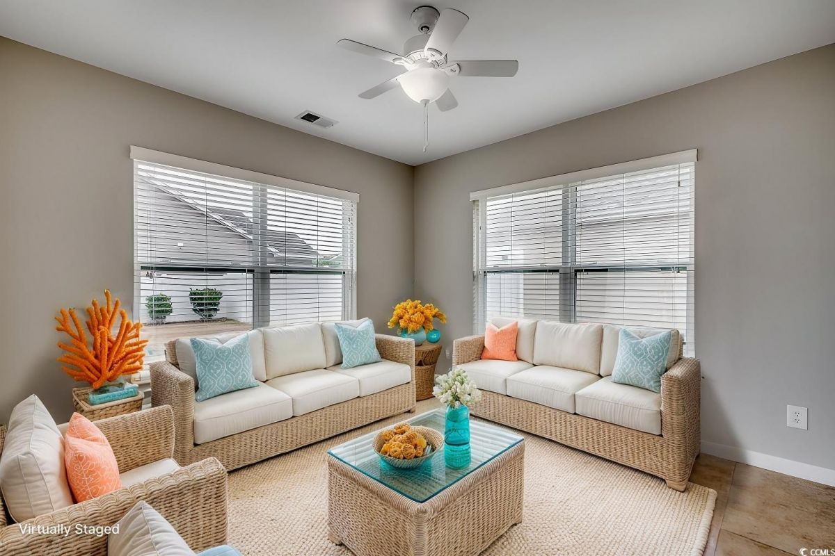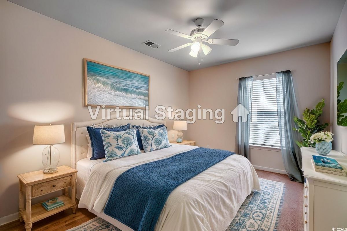 *** OPEN HOUSE SATURDAY 1/4/25 11-2 *** This freshly painted one and half-story residence is located in the desirable Community of Cameron Village. Upon arrival, you are greeted with a welcoming front porch. When you enter the house, you will find an open concept design, the living room features a cathedral ceiling with a ceiling fan. The kitchen features stainless steel appliances with lots of counter space, an abundance of cabinets plus a pantry. Kitchen leads to a cozy Carolina Room to start your mornings or end your day. The first-floor primary bedroom includes a bay window sitting area and a spacious walk-in closet, along with an en-suite master bath complete with a garden tub and separate shower. The Carolina room has patio doors opening to a large, fenced backyard with an extra-wide patio ideal for entertaining, relaxation, and ample space for you to have a private pool installed or a play yard for kids and/or pups! Upstairs, you will find two additional bedrooms, a full bath, and a spacious loft area perfect for a family media room. Roof was replaced in 2022, HVAC replaced in 2018.This home also has easy mount aluminum hurricane shutters. Cameron Village community offers excellent amenities including pickleball, tennis, and basketball courts, a clubhouse, swimming pool, and playground. Its location is just 5.4 miles to the beach, 1.5 miles to Enterprise public boat launch on the Intercoastal and just one mile to Highway 31, providing easy access to all that Myrtle Beach has to offer. Virtual staged photos are included in this listing to show the possibilities.