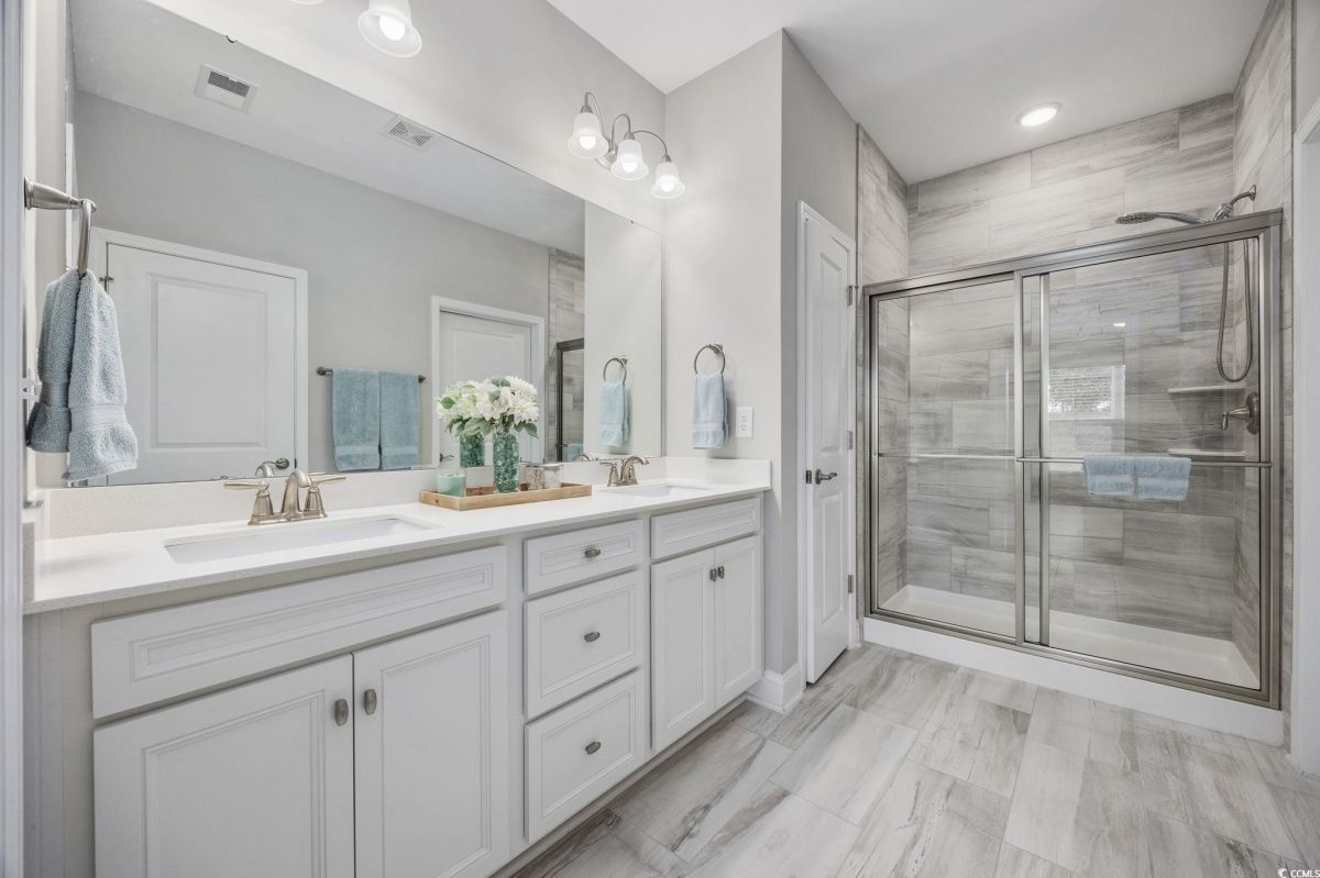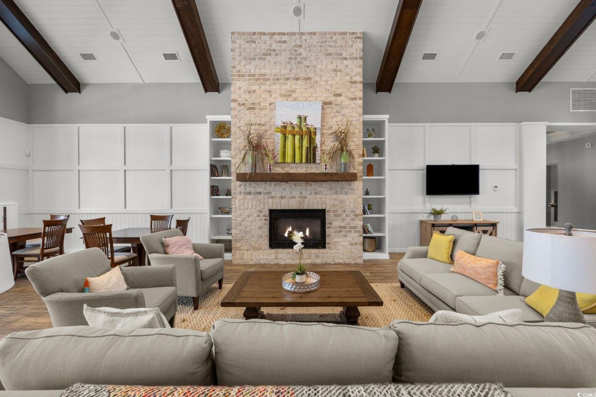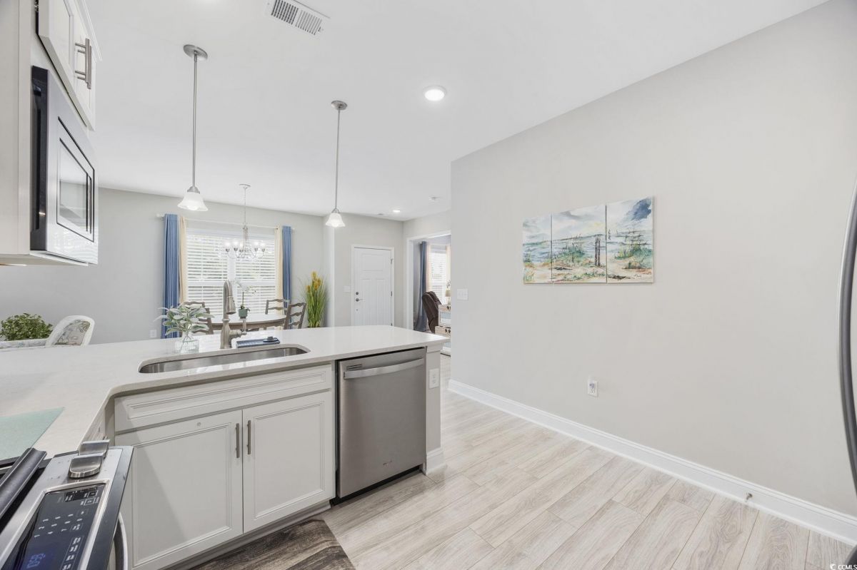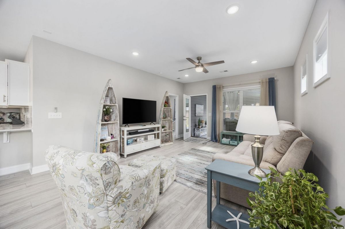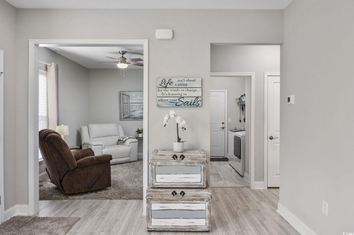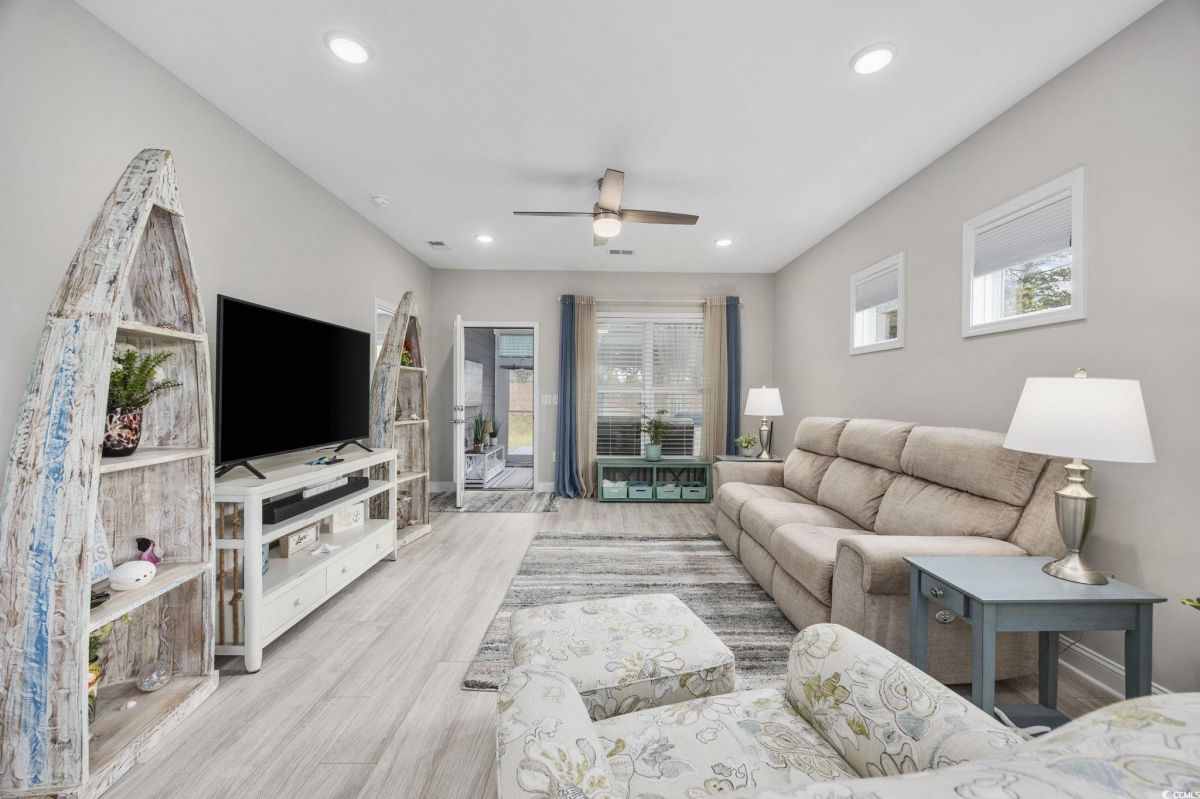 Like NEW!!! Enjoy your new home in the Grande Dunes 55+ Del Webb community located along the Intracoastal Waterway. This spacious & sunny move-in-ready 2 bedroom/2 full bath plus Flex-room property is just a short golf cart ride to the very popular Grande Dunes Ocean Club. Enjoy quartz countertops, stainless steel appliances, upgraded staggered shaker-style cabinets featuring soft-close drawers and doors, and no carpet in this end-unit Serenity model. Sellers have dramatically upgraded the screened-in back porch with the addition of an EZ-Breeze porch enclosure system, ceiling fan, epoxied floor, with blinds & shades rounding out the porch improvements. The garage also has many upgrades: a SeaBreeze mini-split HVAC system, epoxied floor, extra insulation to keep things cool in the summer and warm in the winter, and painted walls & trim creating the perfect mancave. Inside, sellers have added window treatments & blinds throughout, ceiling fans in all rooms, and whole-house surge protection. Upgraded gas range has convection and air-fryer capabilities along with standard baking. Outside, sellers added motion-sensor lights, patio pavers, additional landscaping, and a 10' x 10' retractable awning to create the perfect outdoor relaxation space. Tucked away at the back of the community with no through-traffic, this cozy property is quiet and private. Stay active by enjoying all the included Del Webb amenities and benefits - large indoor and outdoor pools, tennis courts, dedicated pickleball courts, biking & walking paths, fitness center and much more including on an onsite event coordinator. The resort-style amenity center also has an outdoor hot tub/jacuzzi, kitchen area and firepit by the ICW, perfect for watching the sunset!!! Grande Dunes has restaurants and a marina in the community, and is located close to great shopping and convenient medical. Listing information is deemed reliable, but not guaranteed. All measurements are approximate. Buyer is responsible for verification of all measurements and HOA info prior to closing.