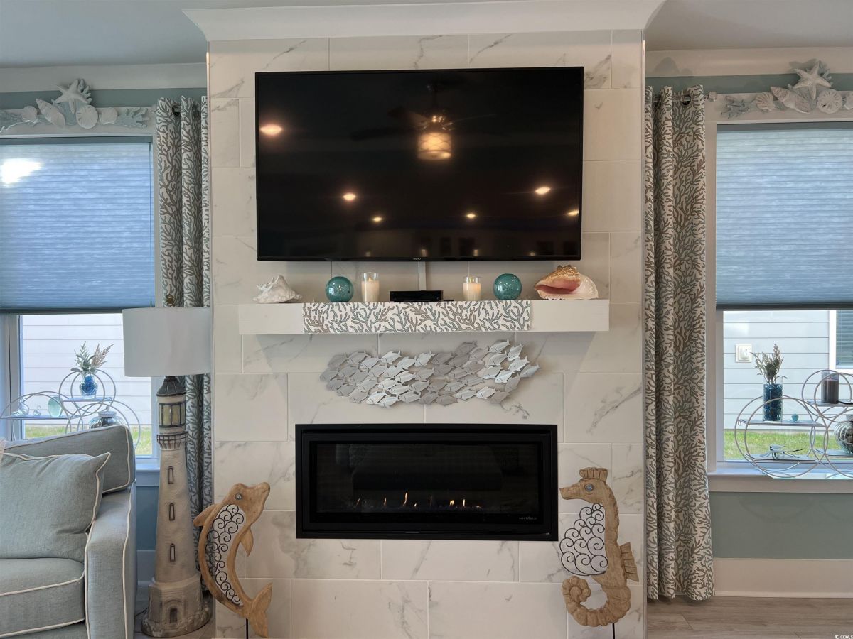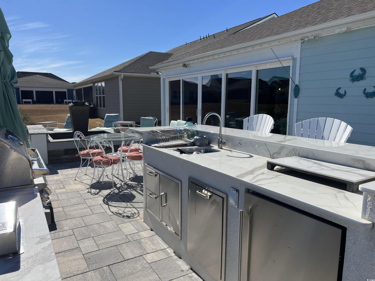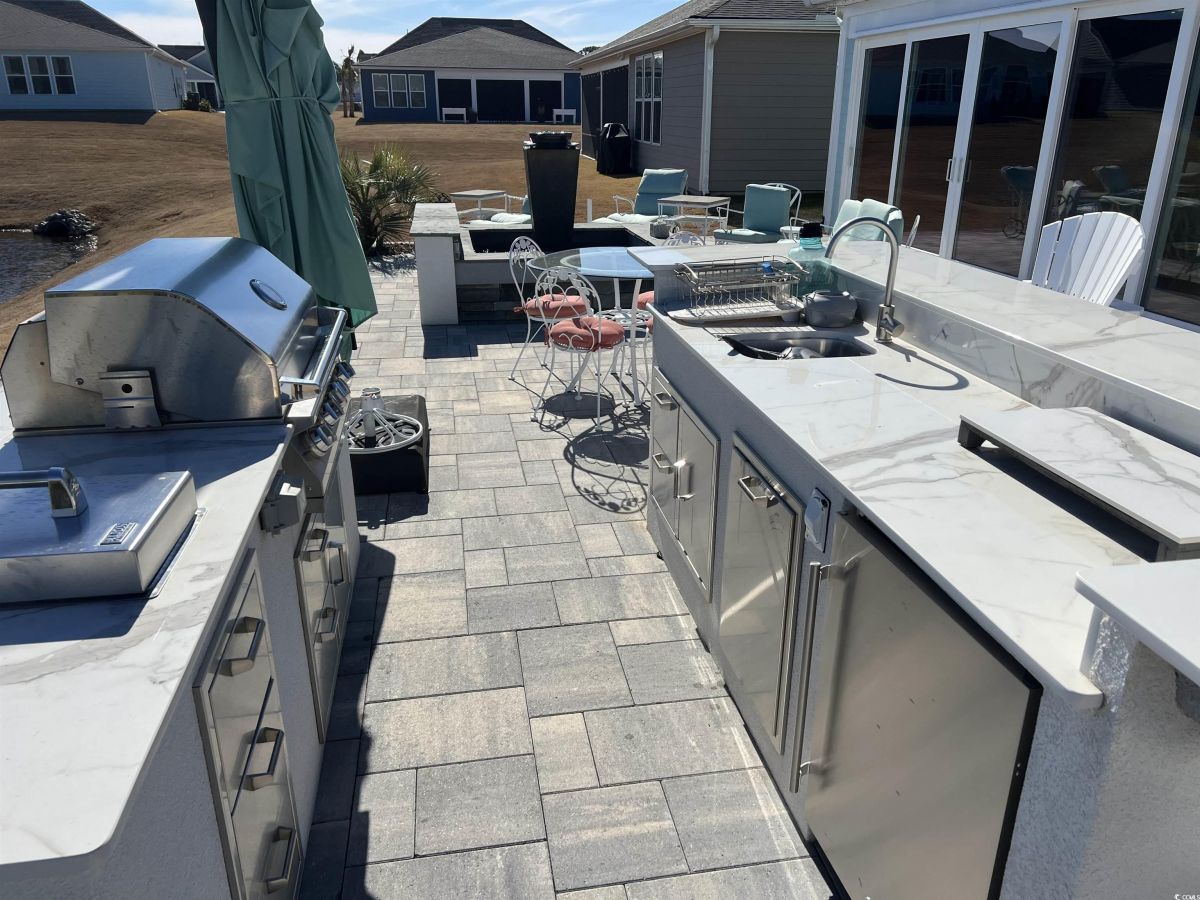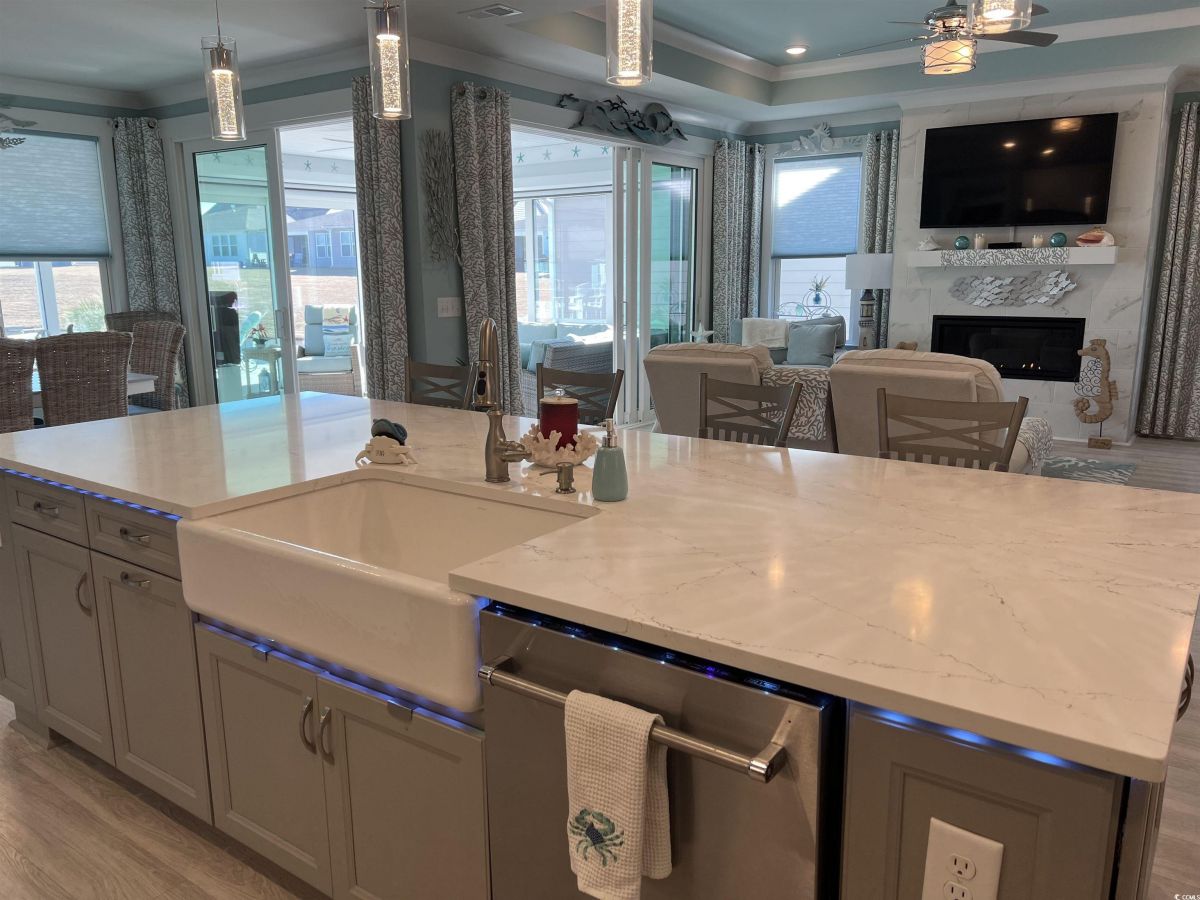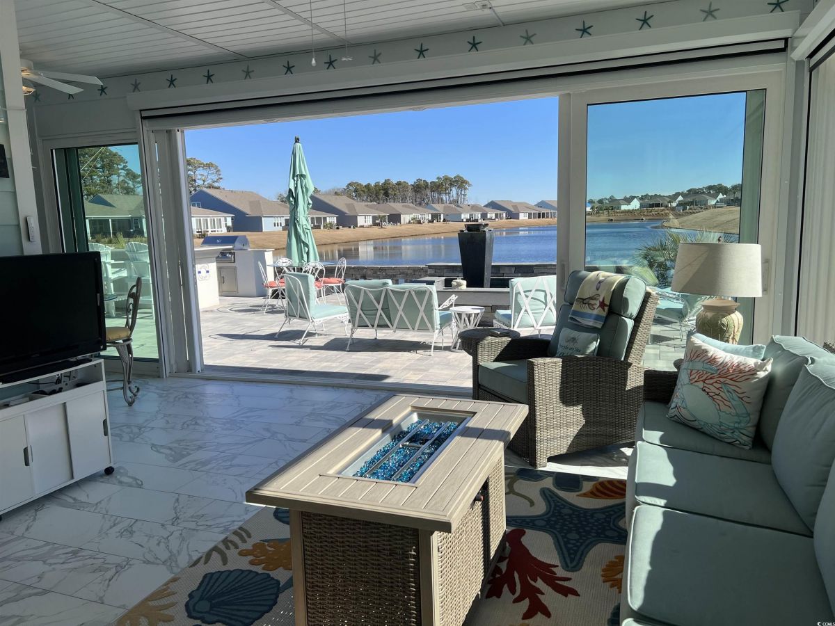Welcome to your dreamhome! The Sellers have spared nothing in this fabulous property. Updates Sellers added after construction include an incredible 1290 sq. ft. back patio overlooking the largest lake in the community with a fully equipped outdoor kitchen with porcelain countertops, high end natural gas grill, fridge and a sink with hot and cold running water. There is a stunning custom fire and water feature with lots of space for lounging and dining. You will find a fully enclosed heated and cooled Carolina Room over looking those incredible lake views and this room features two entire walls of stackable glass patio doors that open all the way up and it also has retractable screens that can provide sun relief. You must see it to believe it! The open floor plan has beautiful views from the kitchen, great room and kitchen dining area. The kitchen cabinets have been updated with glass decorative doors, shelving and paint. Custom accent lighting thoughout the home can be personalized to suit your mood and the home also has special lighting on the exterior with optional color choices. There is a formal dining area with glass french doors that would also make a great office. The master bedroom also has those great views of the water with his and hers giant custom closets. The master bath features dual vanities and a separate walk in shower and soaking tub. There is an additional bedroom downstairs as well as another private living area and one more bedroom upstairs. This home will function beautifully as a multigenerational property. Every bedroom features a private bath and they all have automatic custom window shades and walk in closets. And there are two half baths for your guests. The laundry room (high end washer and dryer included) features a crafting closet and there are lots of storage closets throughout the home. This new 55+ community offers everything you could hope for. You will enjoy the beautiful resort style amenities/clubhouse area which includes an outdoor and indoor pool, hots tubs, Pickleball Courts, fitness center, Bocce courts, putting green and the location is just a short golf cart ride to the beach and convenient to shopping, restaurants, medical facilities, dog park, marinas and golf courses. To take a tour of the 5 star amenities go to “Del Webb North Myrtle Beach” and open the interactive map. This home has it all...the Sellers thought of everything all you have to do is move in!