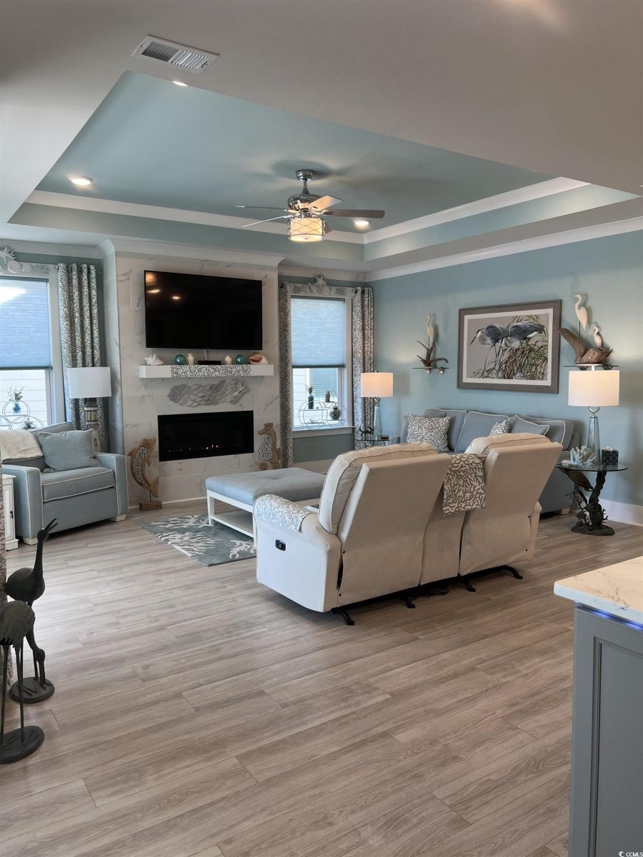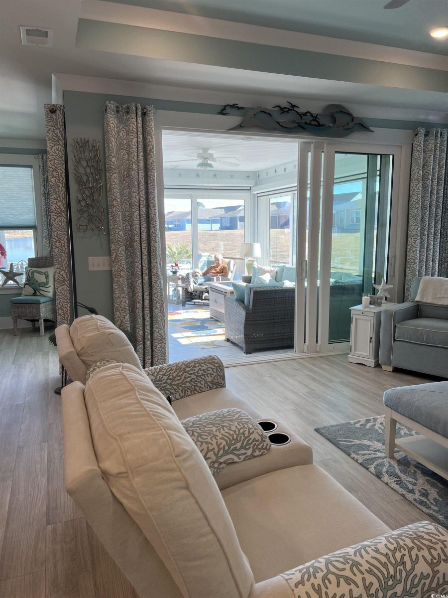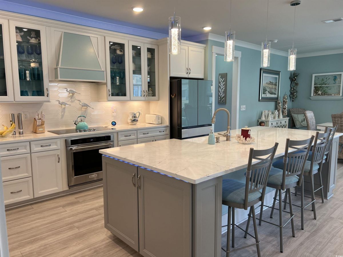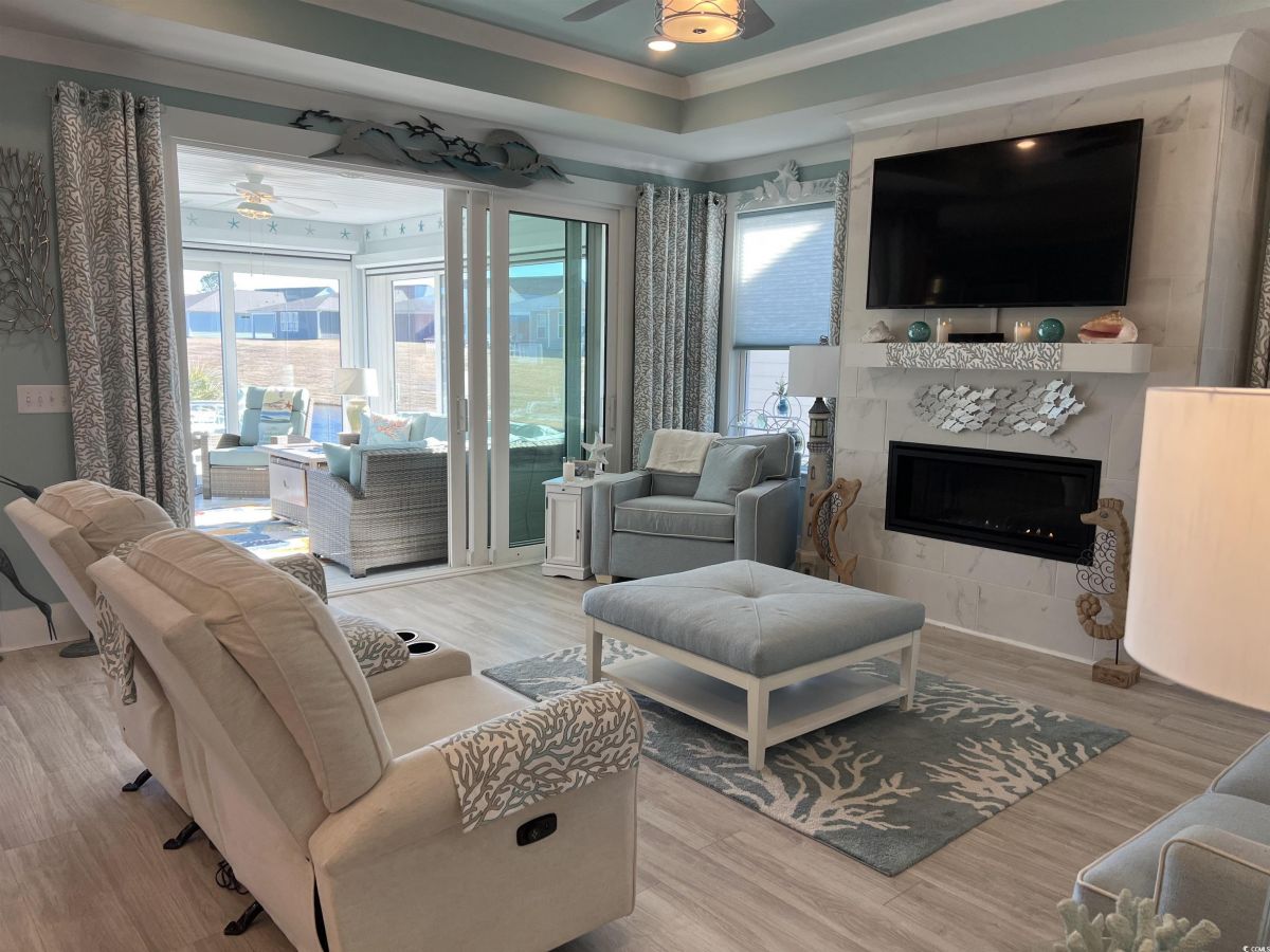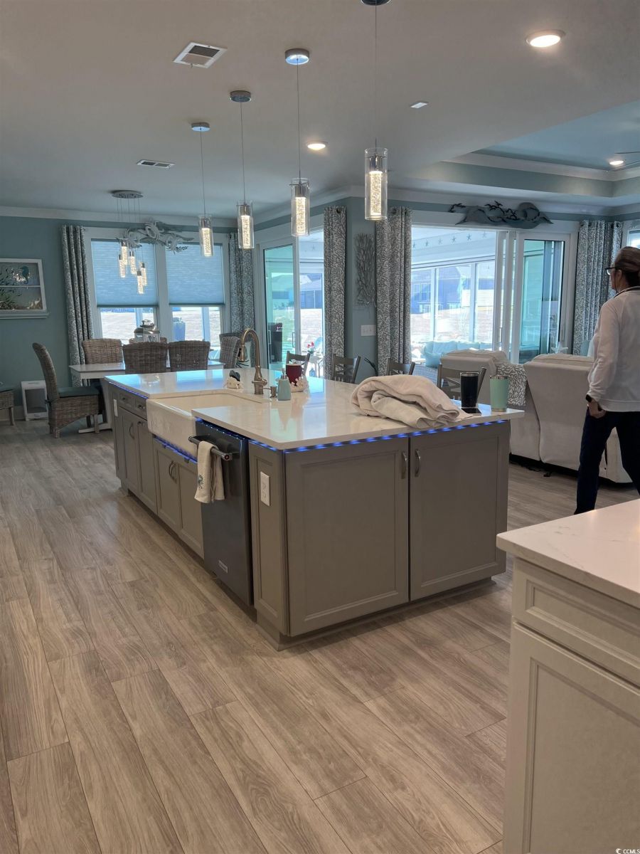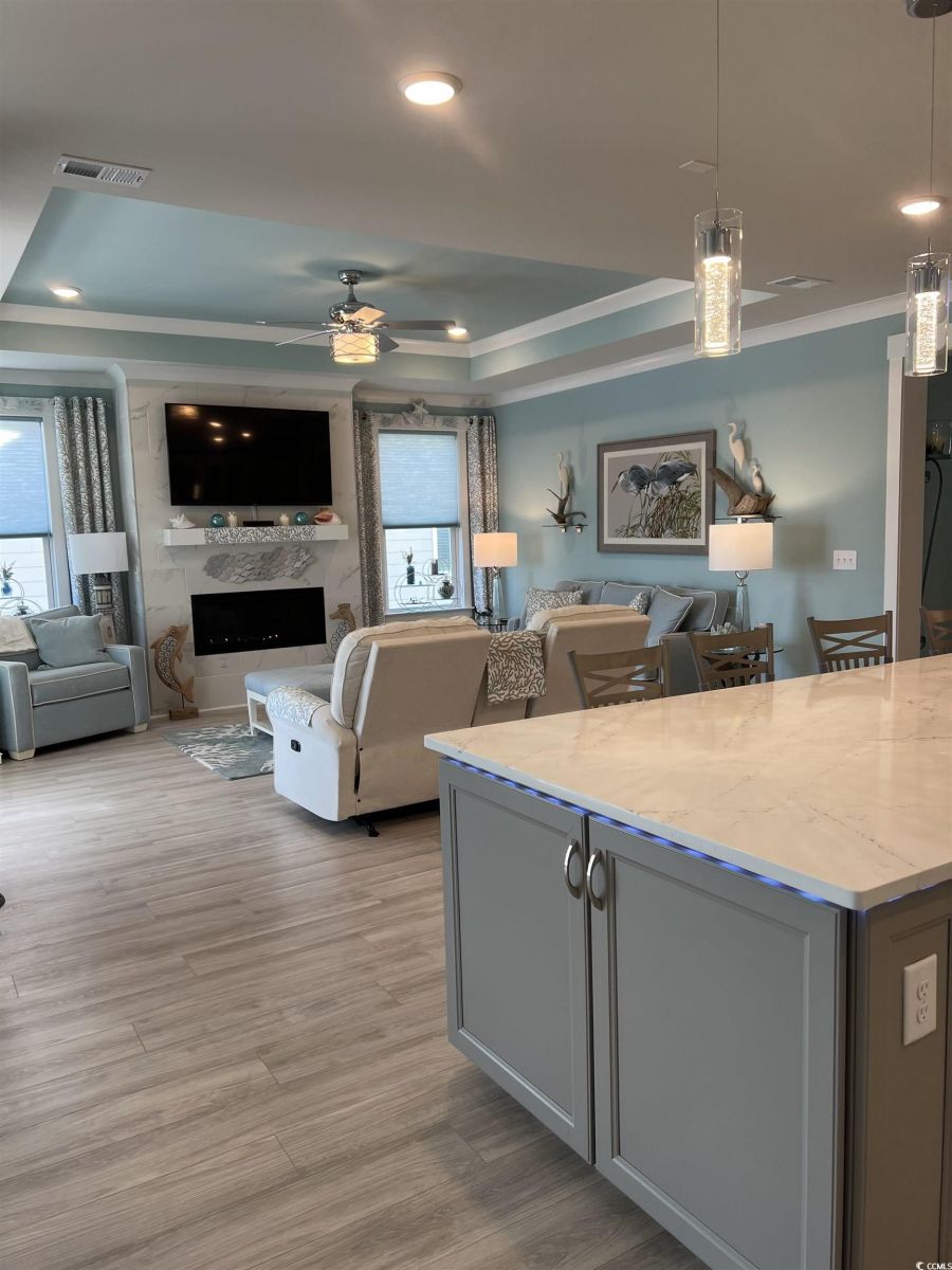 Welcome to your dreamhome! The Sellers have spared nothing in this fabulous property. Updates Sellers added after construction include an incredible 1290 sq. ft. back patio overlooking the largest lake in the community with a fully equipped outdoor kitchen with porcelain countertops, high end natural gas grill, fridge and a sink with hot and cold running water. There is a stunning custom fire and water feature with lots of space for lounging and dining. You will find a fully enclosed heated and cooled Carolina Room over looking those incredible lake views and this room features two entire walls of stackable glass patio doors that open all the way up and it also has retractable screens that can provide sun relief. You must see it to believe it! The open floor plan has beautiful views from the kitchen, great room and kitchen dining area. The kitchen cabinets have been updated with glass decorative doors, shelving and paint. Custom accent lighting thoughout the home can be personalized to suit your mood and the home also has special lighting on the exterior with optional color choices. There is a formal dining area with glass french doors that would also make a great office. The master bedroom also has those great views of the water with his and hers giant custom closets. The master bath features dual vanities and a separate walk in shower and soaking tub. There is an additional bedroom downstairs as well as another private living area and one more bedroom upstairs. This home will function beautifully as a multigenerational property. Every bedroom features a private bath and they all have automatic custom window shades and walk in closets. And there are two half baths for your guests. The laundry room (high end washer and dryer included) features a crafting closet and there are lots of storage closets throughout the home. This new 55+ community offers everything you could hope for. You will enjoy the beautiful resort style amenities/clubhouse area which includes an outdoor and indoor pool, hots tubs, Pickleball Courts, fitness center, Bocce courts, putting green and the location is just a short golf cart ride to the beach and convenient to shopping, restaurants, medical facilities, dog park, marinas and golf courses. To take a tour of the 5 star amenities go to “Del Webb North Myrtle Beach” and open the interactive map. This home has it all...the Sellers thought of everything all you have to do is move in!