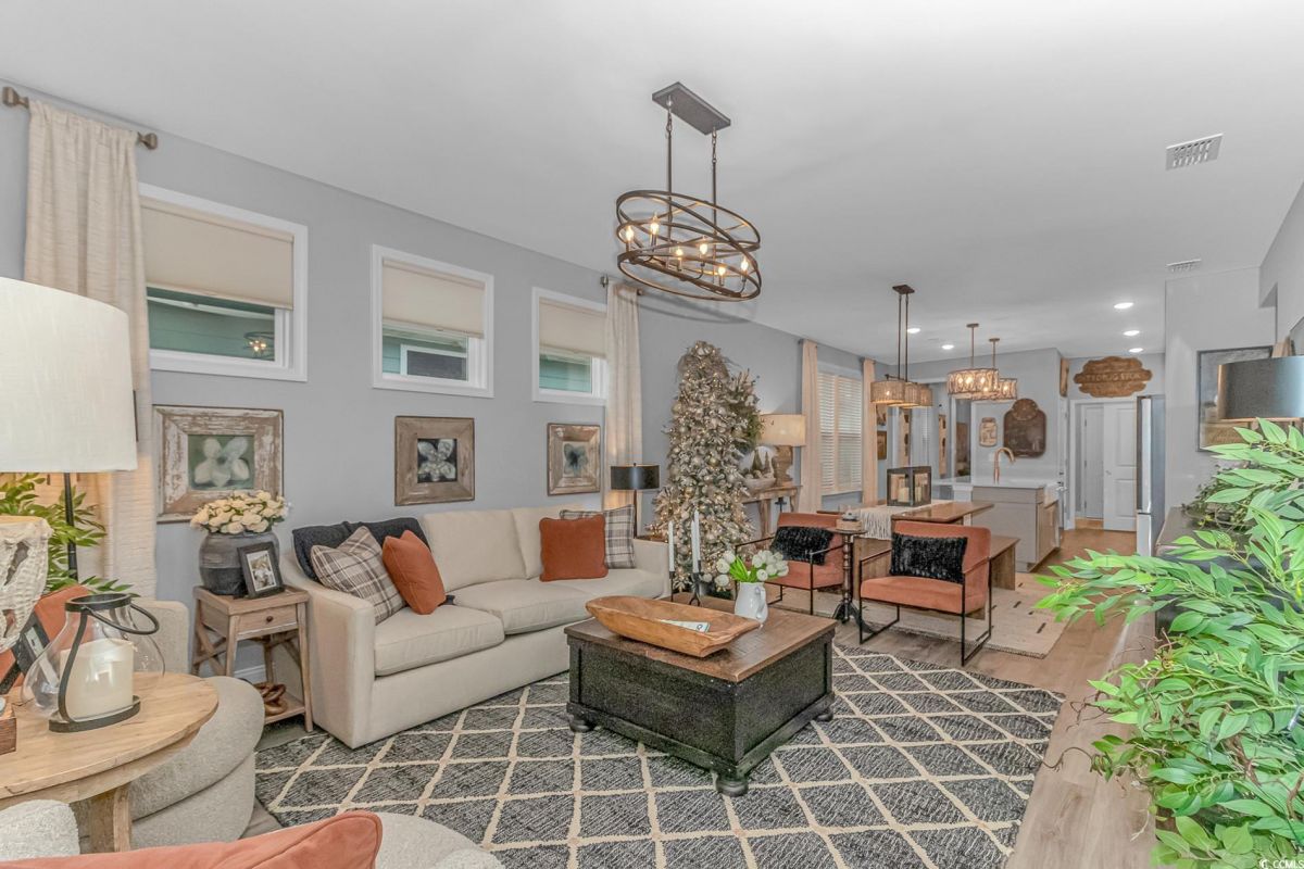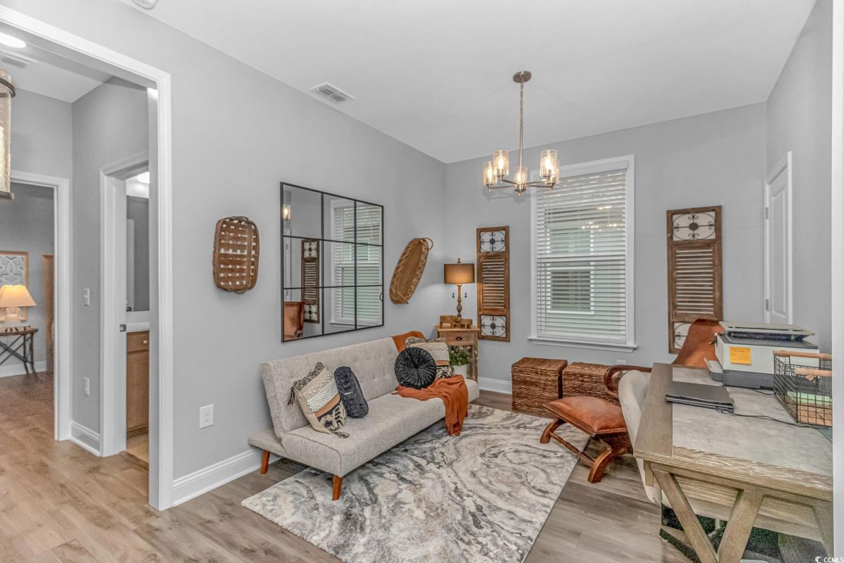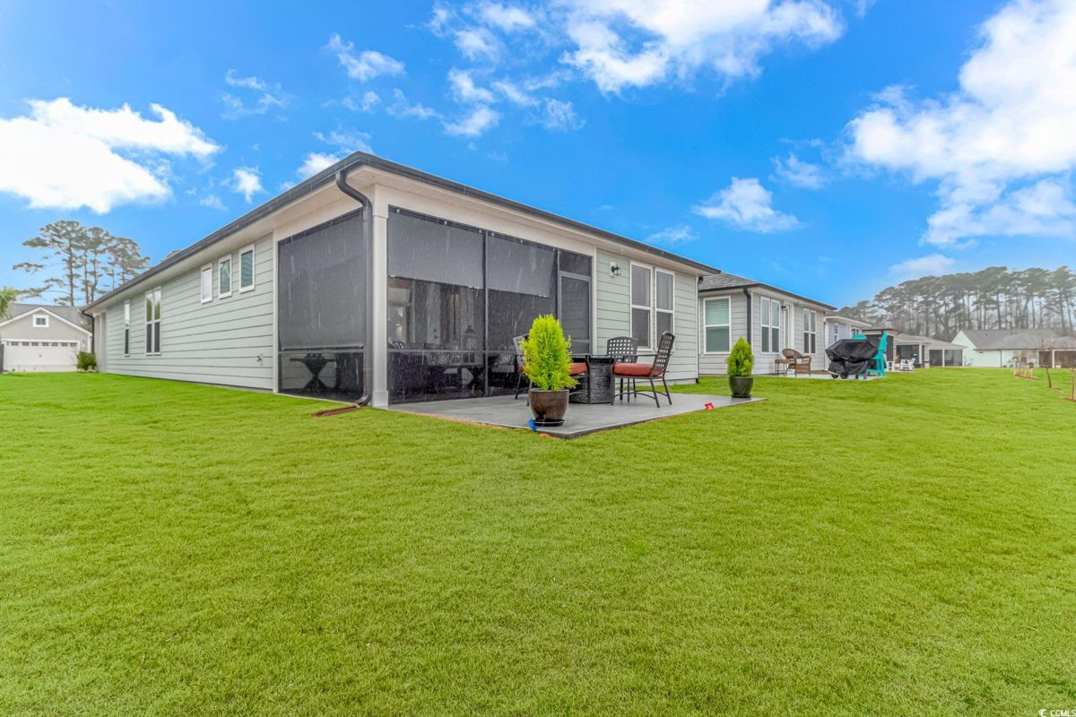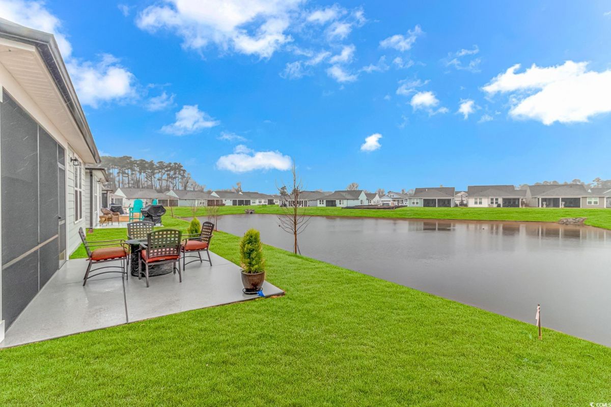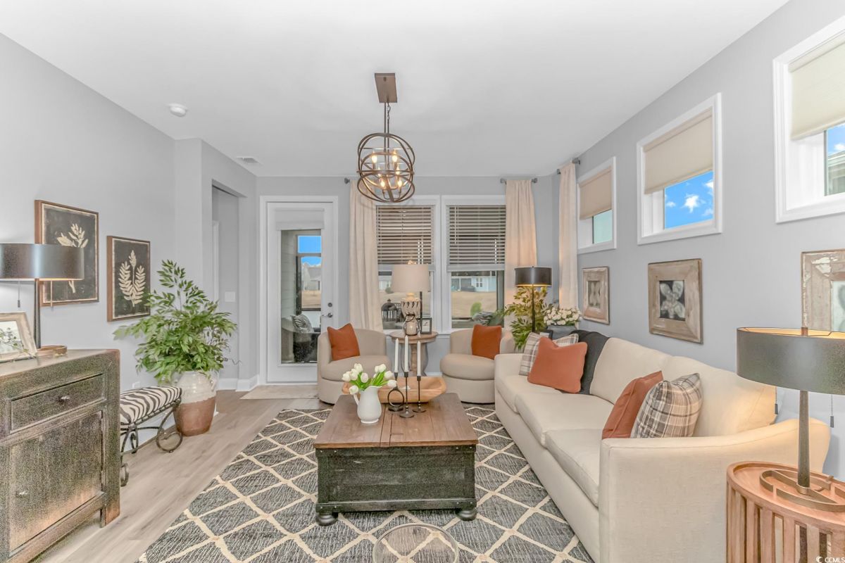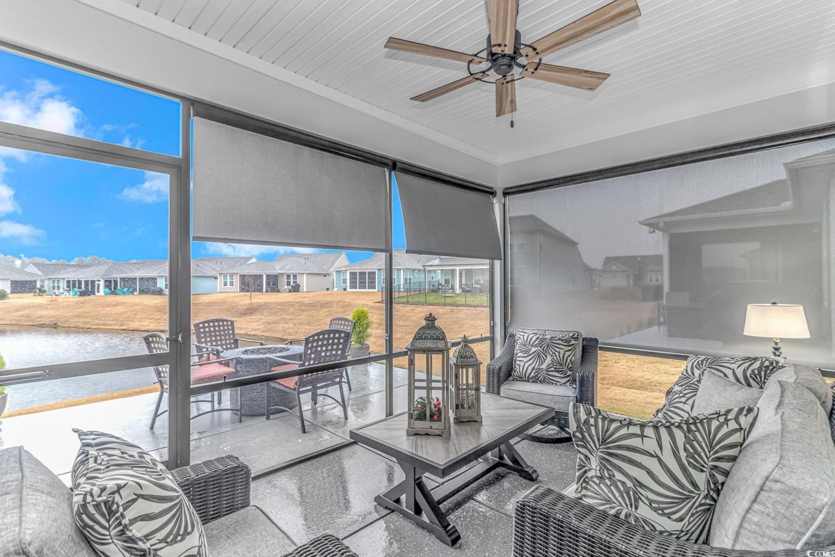 Nestled in the heart of Del Webb North Myrtle Beach, the ultimate retirement destination, this stunning single-story home showcases exceptional upgrades and embodies the sought-after lifestyle of a vibrant 55+ active adult community. Situated on a premium pond lot, this home combines luxury, functionality, and picturesque views, making it the perfect retreat for relaxed yet active living. Step inside and be greeted by an inviting, open-concept living space painted throughout in the versatile Agreeable Gray. The upgraded gourmet kitchen is a chef’s dream, featuring a gas range, double wall ovens by KitchenAid, a wood hood, quartz countertops, a single-basin farmhouse sink, a tile backsplash, under-cabinet lighting, and soft-close cabinets, including a built-in trash can cabinet. Designer pendant lighting illuminates the two-toned kitchen island, creating a perfect focal point for entertaining. The spacious master suite offers serene pond views, a luxurious chandelier, and a beautifully appointed en-suite bathroom with upgraded tile flooring, a glass-enclosed walk-in shower, double vanities, a walk-in closet, and a linen closet for added storage. A guest bedroom and guest bathroom with tile flooring and a tub-shower combo provide comfort and privacy for visitors, while a flex room with a closet adds versatile space for an office, hobby room, or additional guest accommodations. The home’s thoughtful details continue with a laundry room featuring cabinets and included washer and dryer, upgraded flooring throughout, and a Lennox HVAC system with a filtration system for added comfort and efficiency. Outside, the screened porch with privacy shades and an epoxy floor offers a tranquil space to enjoy the pond views, while the grilling patio is perfect for outdoor dining. The epoxy-coated front porch and freshly painted front door add to the home’s curb appeal. The oversized two-car garage features epoxy flooring, painted walls, granite-topped cabinets, and pull-down attic stairs for abundant storage space. Del Webb North Myrtle Beach enhances your lifestyle with resort-style amenities, including a 12,000-square-foot clubhouse, state-of-the-art fitness center, indoor lap pool, outdoor zero-entry pool, tennis, pickleball, bocce ball courts, and scenic walking trails. A full-time lifestyle director ensures there’s always something exciting happening, from social clubs to cultural events. Located in the heart of North Myrtle Beach, this home places you just minutes from pristine beaches, vibrant local events, boutique shopping, and fine dining. With a mild climate, retiree-friendly tax policies, and proximity to excellent healthcare, North Myrtle Beach is the perfect place to call home. Don’t miss the opportunity to own this exceptional property in one of the most sought-after communities on the Grand Strand. Schedule your private tour today and start living the retirement of your dreams!
