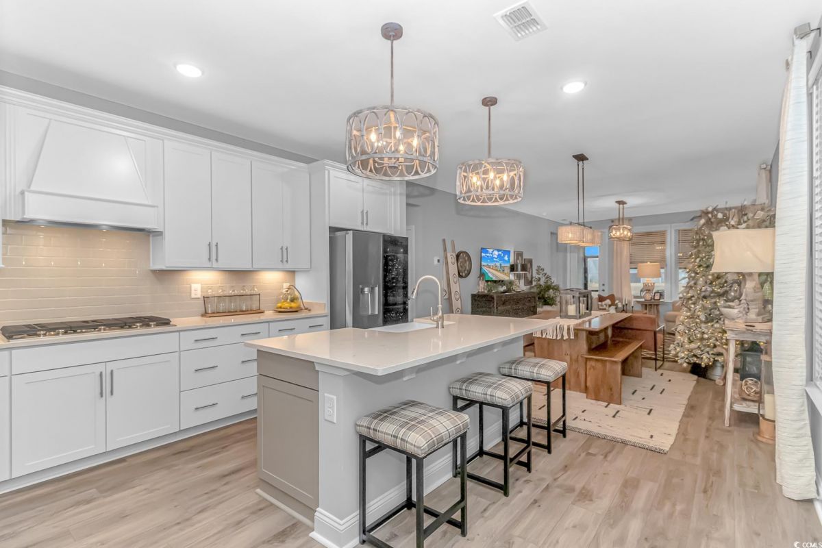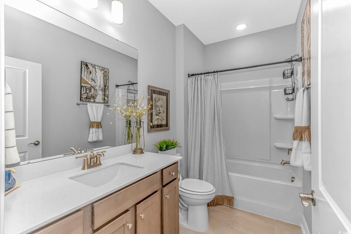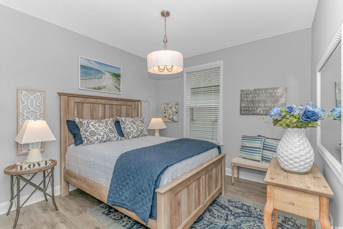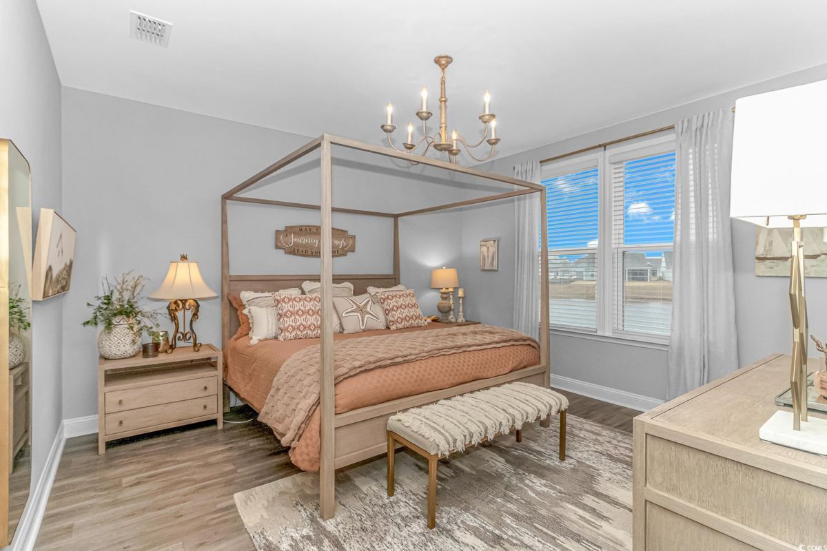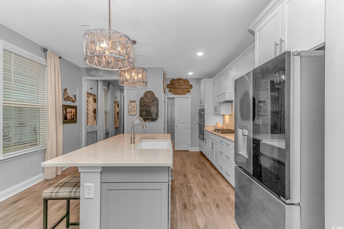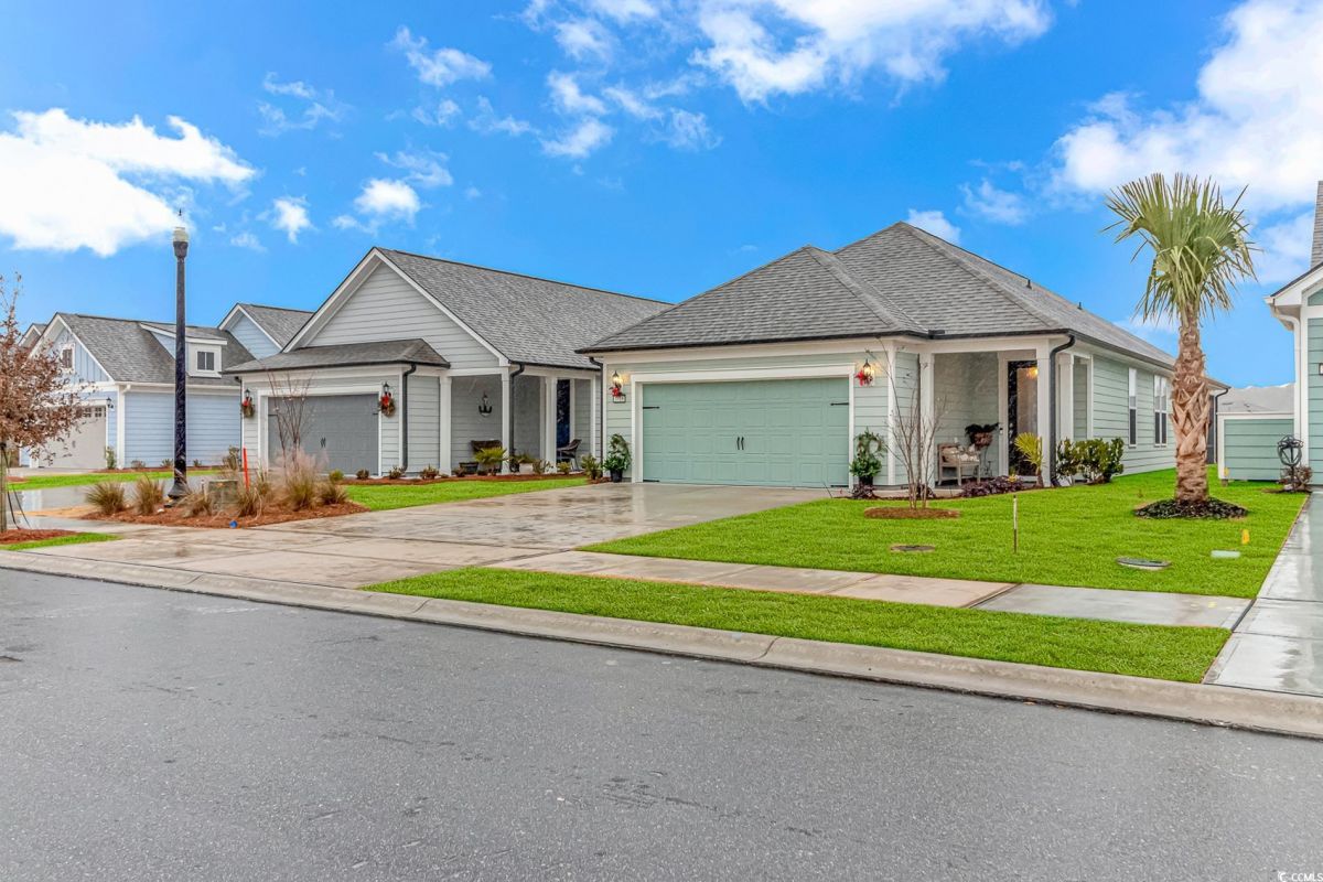 Nestled in the heart of Del Webb North Myrtle Beach, the ultimate retirement destination, this stunning single-story home showcases exceptional upgrades and embodies the sought-after lifestyle of a vibrant 55+ active adult community. Situated on a premium pond lot, this home combines luxury, functionality, and picturesque views, making it the perfect retreat for relaxed yet active living. Step inside and be greeted by an inviting, open-concept living space painted throughout in the versatile Agreeable Gray. The upgraded gourmet kitchen is a chef’s dream, featuring a gas range, double wall ovens by KitchenAid, a wood hood, quartz countertops, a single-basin farmhouse sink, a tile backsplash, under-cabinet lighting, and soft-close cabinets, including a built-in trash can cabinet. Designer pendant lighting illuminates the two-toned kitchen island, creating a perfect focal point for entertaining. The spacious master suite offers serene pond views, a luxurious chandelier, and a beautifully appointed en-suite bathroom with upgraded tile flooring, a glass-enclosed walk-in shower, double vanities, a walk-in closet, and a linen closet for added storage. A guest bedroom and guest bathroom with tile flooring and a tub-shower combo provide comfort and privacy for visitors, while a flex room with a closet adds versatile space for an office, hobby room, or additional guest accommodations. The home’s thoughtful details continue with a laundry room featuring cabinets and included washer and dryer, upgraded flooring throughout, and a Lennox HVAC system with a filtration system for added comfort and efficiency. Outside, the screened porch with privacy shades and an epoxy floor offers a tranquil space to enjoy the pond views, while the grilling patio is perfect for outdoor dining. The epoxy-coated front porch and freshly painted front door add to the home’s curb appeal. The oversized two-car garage features epoxy flooring, painted walls, granite-topped cabinets, and pull-down attic stairs for abundant storage space. Del Webb North Myrtle Beach enhances your lifestyle with resort-style amenities, including a 12,000-square-foot clubhouse, state-of-the-art fitness center, indoor lap pool, outdoor zero-entry pool, tennis, pickleball, bocce ball courts, and scenic walking trails. A full-time lifestyle director ensures there’s always something exciting happening, from social clubs to cultural events. Located in the heart of North Myrtle Beach, this home places you just minutes from pristine beaches, vibrant local events, boutique shopping, and fine dining. With a mild climate, retiree-friendly tax policies, and proximity to excellent healthcare, North Myrtle Beach is the perfect place to call home. Don’t miss the opportunity to own this exceptional property in one of the most sought-after communities on the Grand Strand. Schedule your private tour today and start living the retirement of your dreams!