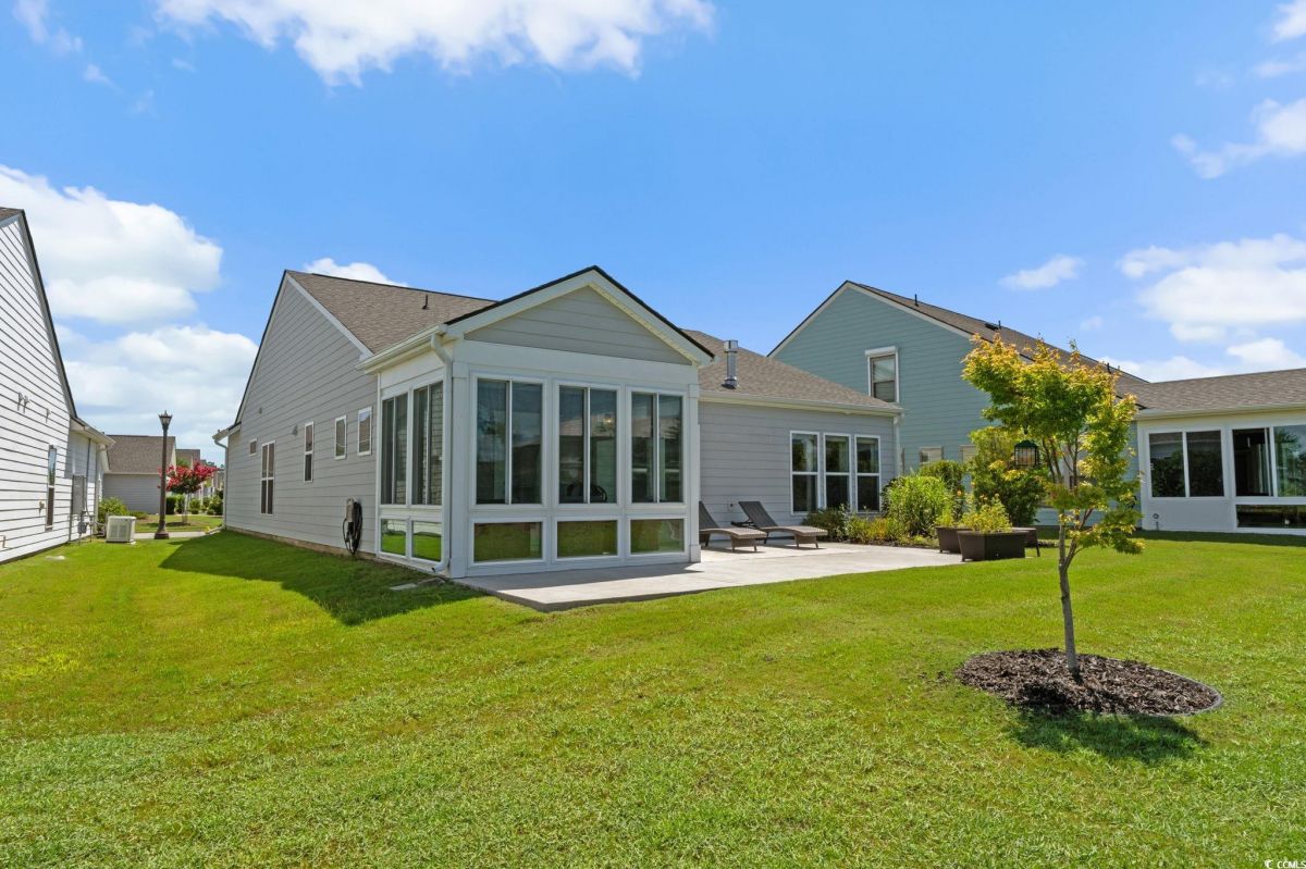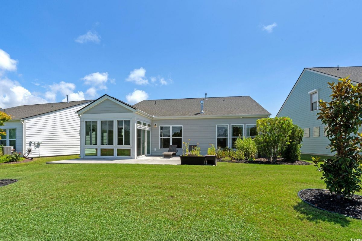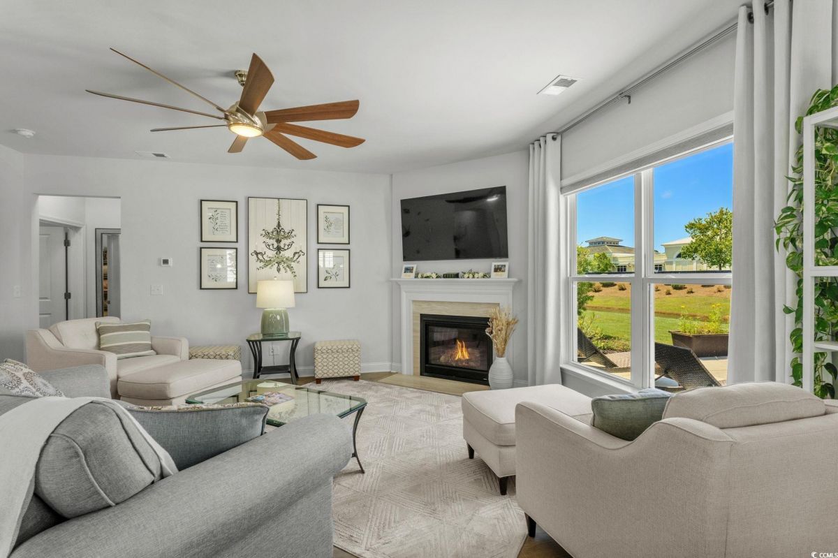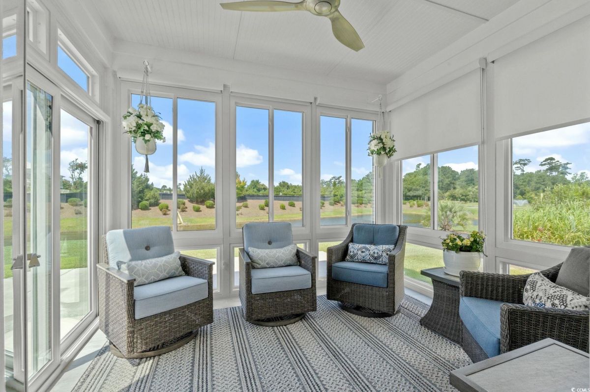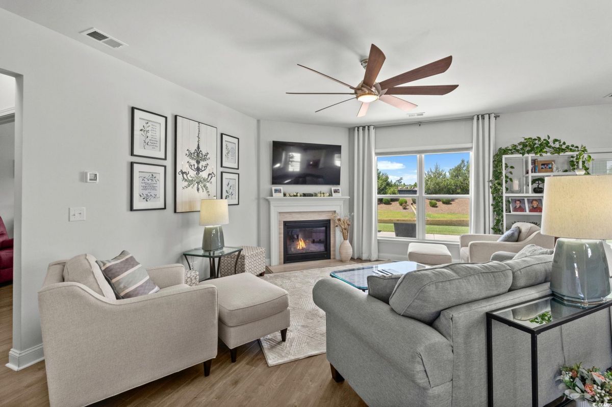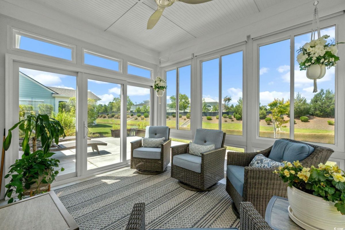 Welcome to your new home in the highly desirable Del Webb at Grande Dunes community, an exclusive 55+ neighborhood. This beautiful 3-bedroom, 2-bathroom property, which shows like a model, features the popular Abbeyville floor plan. It offers a spacious open-concept kitchen, dining, and living area, highlighted by a cozy fireplace in the great room. The kitchen is a chef’s dream, with marble countertops, a large island, stainless steel appliances, and a pantry. Situated on an exceptional homesite, this home provides stunning views from multiple rooms, including a cozy 3-season glass-enclosed sunroom. The private backyard offers peaceful pond views and no homes directly behind it, ensuring tranquility and privacy. The upgraded landscaping enhances the outdoor space, providing a beautifully maintained environment to enjoy year-round. The primary bedroom is filled with natural light, creating a serene retreat. The owner’s bath features a double vanity with a gorgeous granite countertop, a tastefully tiled shower, and a spacious walk-in closet. Built with modern standards, this home includes energy-efficient features, such as radiant barrier sheeting in the attic to help reduce energy costs, irrigation, a Sentricon and Taexx termite system, and gutters. The garage is finished with a durable epoxy floor, providing both functionality and style. The extra-wide driveway ensures plenty of space for two vehicles. Additionally, this home is equipped with a natural gas whole-home generator, ensuring peace of mind during power outages, so you can continue to enjoy the comfort and convenience of modern living no matter the weather. Del Webb amenities are unparalleled, offering a vibrant active community experience. Meet new friends at the monthly events and daily activities hosted at the Amenity Center, take a refreshing dip in the indoor or outdoor pool, or stay active with facilities like the gym, bocce ball, pickleball, and tennis courts. Enjoy leisurely strolls or bike rides along the countless sidewalks and the paved path running alongside the beautiful intracoastal waterfront. Running errands or heading to the beach is a breeze with your golf cart—the ultimate beach life necessity! And speaking of the beach, easy access is granted via the Grande Dunes Beach Club, a delightful amenity included in the HOA amenities.