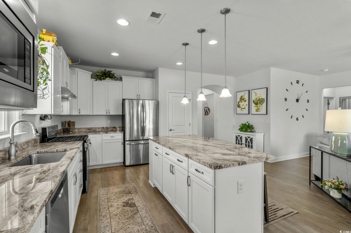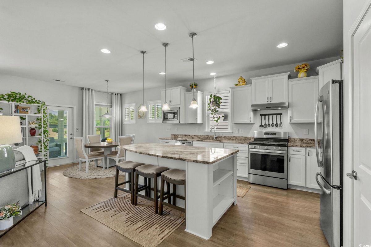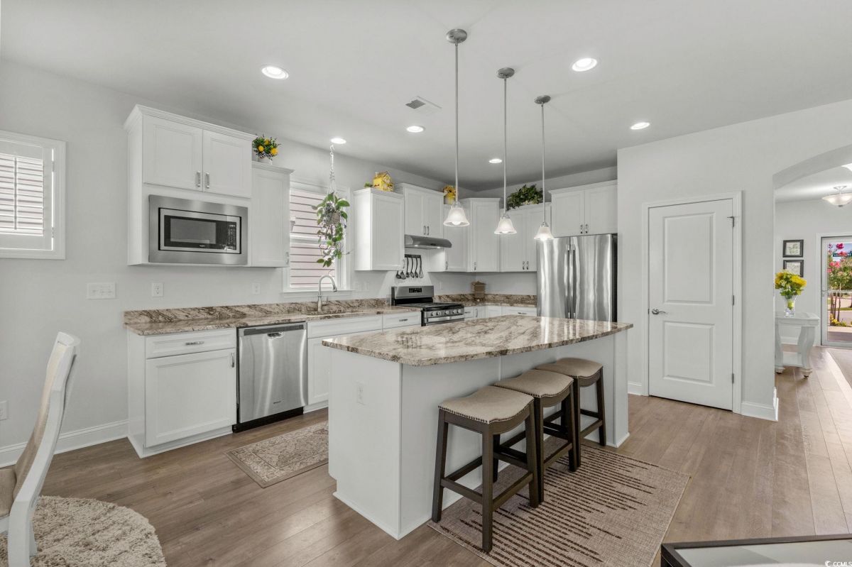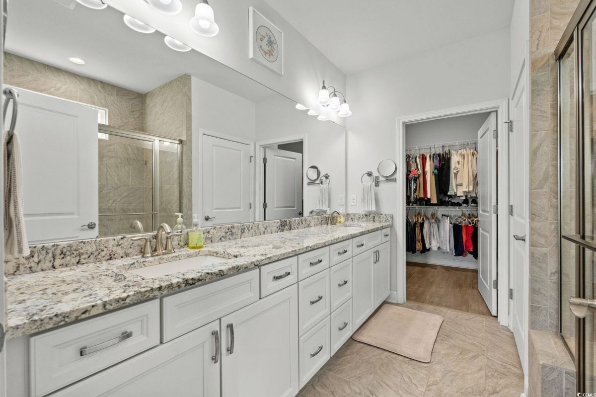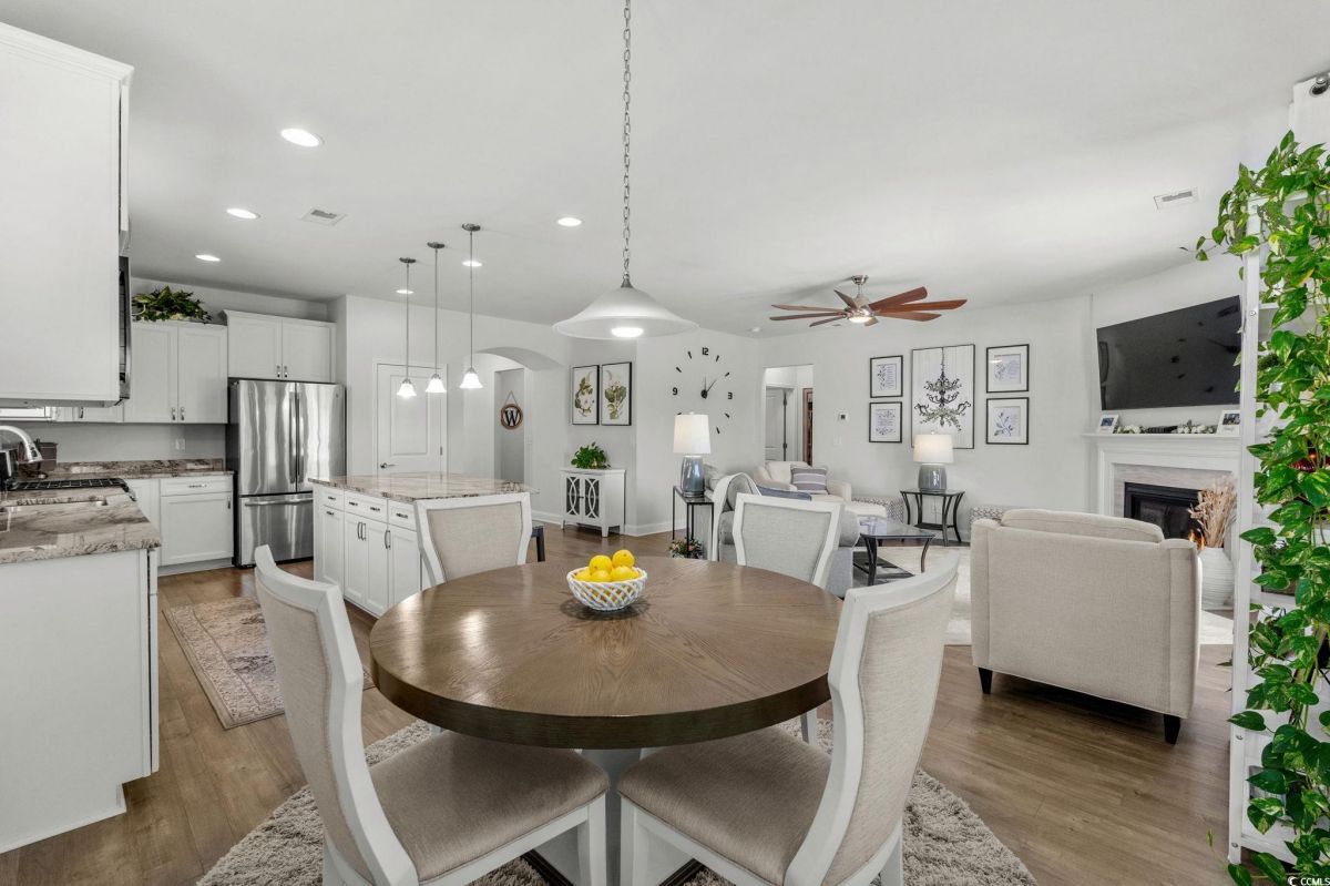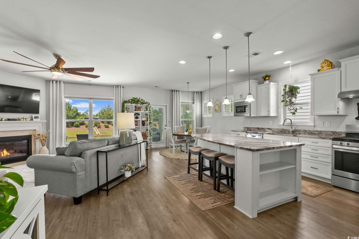 Welcome to your new home in the highly desirable Del Webb at Grande Dunes community, an exclusive 55+ neighborhood. This beautiful 3-bedroom, 2-bathroom property, which shows like a model, features the popular Abbeyville floor plan. It offers a spacious open-concept kitchen, dining, and living area, highlighted by a cozy fireplace in the great room. The kitchen is a chef’s dream, with marble countertops, a large island, stainless steel appliances, and a pantry. Situated on an exceptional homesite, this home provides stunning views from multiple rooms, including a cozy 3-season glass-enclosed sunroom. The private backyard offers peaceful pond views and no homes directly behind it, ensuring tranquility and privacy. The upgraded landscaping enhances the outdoor space, providing a beautifully maintained environment to enjoy year-round. The primary bedroom is filled with natural light, creating a serene retreat. The owner’s bath features a double vanity with a gorgeous granite countertop, a tastefully tiled shower, and a spacious walk-in closet. Built with modern standards, this home includes energy-efficient features, such as radiant barrier sheeting in the attic to help reduce energy costs, irrigation, a Sentricon and Taexx termite system, and gutters. The garage is finished with a durable epoxy floor, providing both functionality and style. The extra-wide driveway ensures plenty of space for two vehicles. Additionally, this home is equipped with a natural gas whole-home generator, ensuring peace of mind during power outages, so you can continue to enjoy the comfort and convenience of modern living no matter the weather. Del Webb amenities are unparalleled, offering a vibrant active community experience. Meet new friends at the monthly events and daily activities hosted at the Amenity Center, take a refreshing dip in the indoor or outdoor pool, or stay active with facilities like the gym, bocce ball, pickleball, and tennis courts. Enjoy leisurely strolls or bike rides along the countless sidewalks and the paved path running alongside the beautiful intracoastal waterfront. Running errands or heading to the beach is a breeze with your golf cart—the ultimate beach life necessity! And speaking of the beach, easy access is granted via the Grande Dunes Beach Club, a delightful amenity included in the HOA amenities.