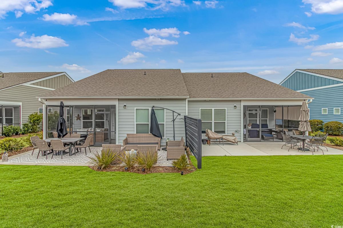 Come and check out this beautifully designed one of a kind villa located in the Del Webb Grande Dunes 55+, natural gas community. The villa is the Cressida model offering a split bedroom plan. Home has 2 spacious Bedrooms and 2 Baths which also includes a bonus room that can be used as office and/or 3rd bedroom. Open concept living offers a large entertainment area including a living room, dining and kitchen. Kitchen has stainless steel appliances, large island with custom pendant lighting, granite countertops & pantry for extra storage. Home includes: Smart Home features, LVP flooring throughout, wet areas have tile, granite countertops in baths and kitchen area, tankless hot water, outdoor space includes extra palm trees and flowers for landscaping, a screened in lanai, open back patio is perfect for grilling & dining outside. Lots of Owner upgrades: kitchen under cabinet lighting, replaced cabinet hardware with black hardware, also installed new black faucet, new pendant lighting over the island, dining room light, added extra patio slab, in flex room added built in twin beds, shiplap on the walls and 9” crown molding. In the master bathroom, upgraded to heavy glass shower doors trimmed in black with black handle, new black Moen spa shower faucet. In the garage, shelves are built in for extra storage. This Del Webb neighborhood features on-site resort style amenities such as outdoor & indoor pools, fitness center, pickle ball, tennis, & bocce ball courts, walking and biking trails, a fire pit overlooking the beautiful intercoastal waterway, a day dock & a full-time lifestyle director that plans events &activities monthly. In addition to the on-site amenities, you will also have access to the Grande Dunes Ocean Club. Drive your golf cart there and enjoy the ocean front pool, on-site restaurant & beach access. Don't wait and miss the chance to own your piece of paradise…schedule a showing today!!