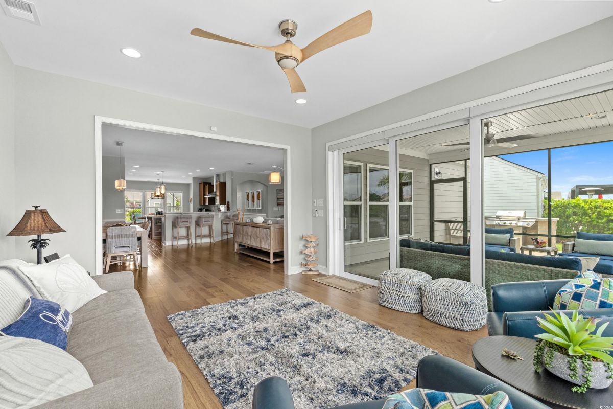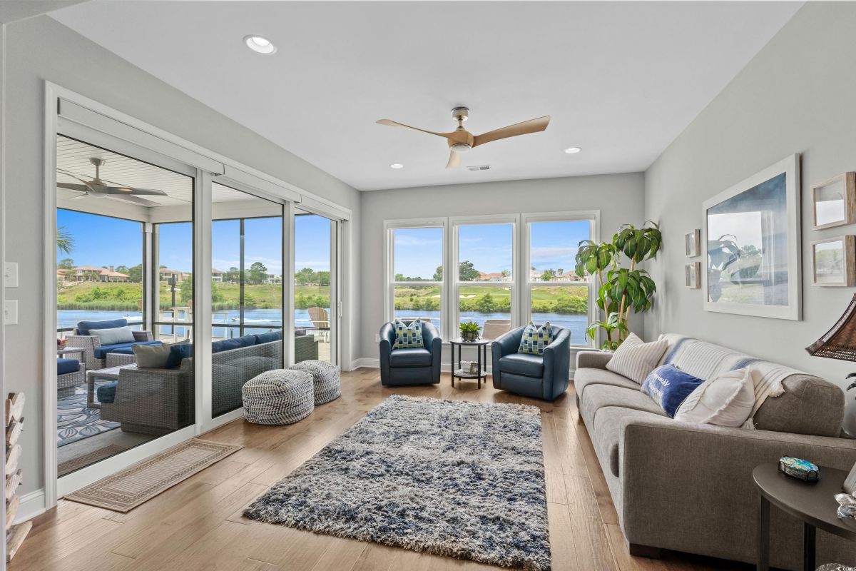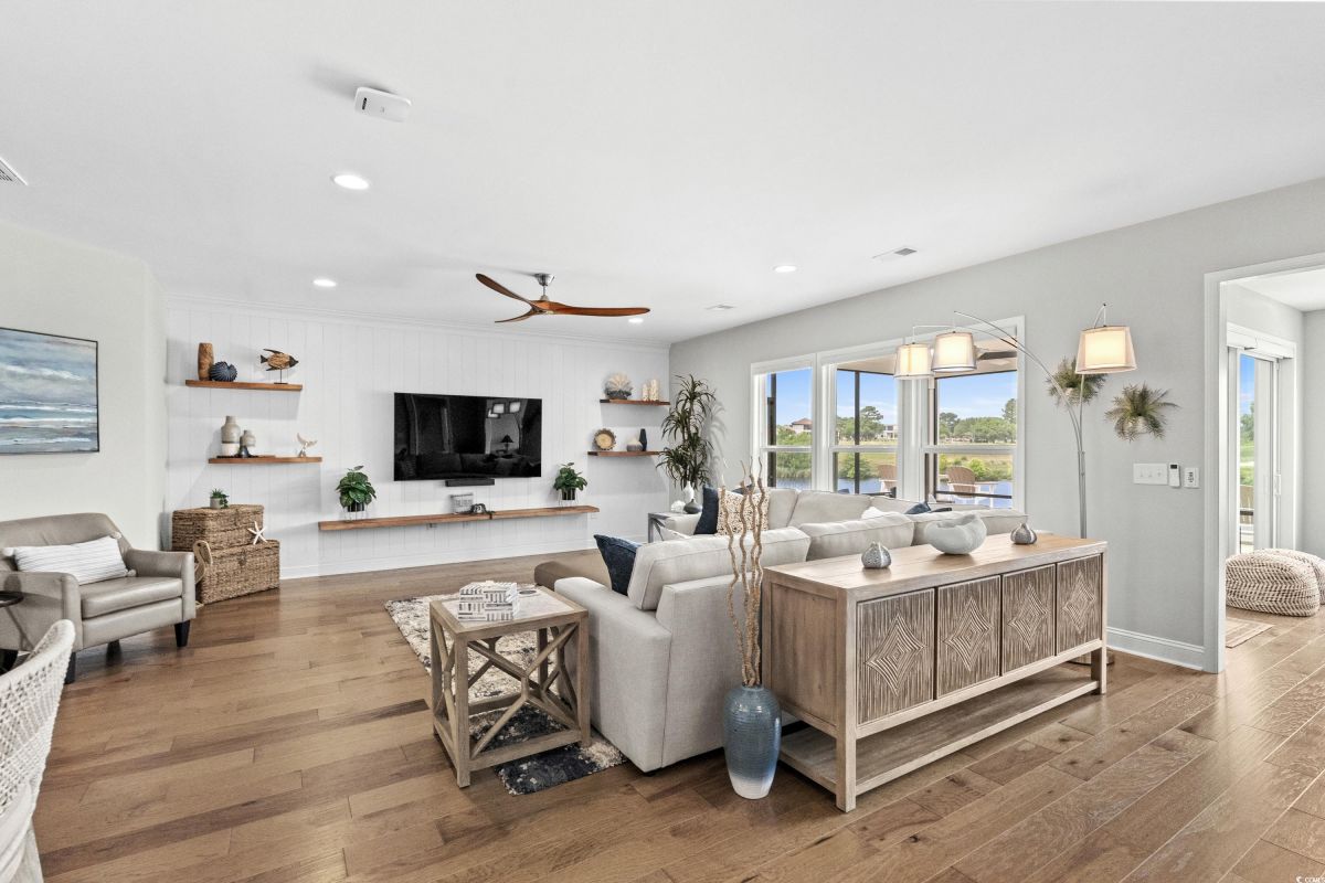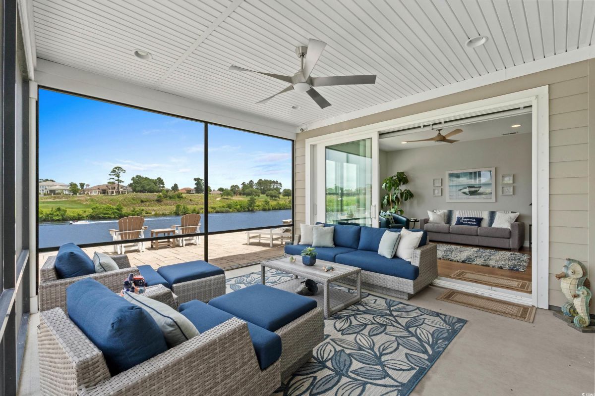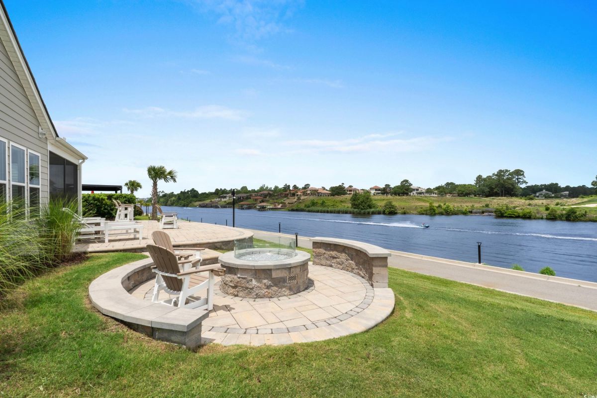 Experience waterway living at its finest at 7374 Sarteano Dr, a refined Grande Dunes residence where sophistication meets serenity. Nestled in the prestigious Del Webb neighborhood and situated on one of the premier ICW homesites, this one of a kind, immaculate 3 Bedroom, 3 bath home offers unmatched sunset views down the waterway and amazing golf views of the signature hole on the resort course. Upon entering this open plan, you'll immediately notice the custom upgrades and details that resonate throughout this exquisite residence. Natural light pours through the homes many windows, and added sunroom, perfect for watching the boats cruise by or golfers tee up on the green. The great room and owners suite come alive with custom shiplap accent walls, custom Cypress floating shelves in great room and a unique barn door in the primary. So many improvements in this place, including wood flooring throughout, full pull out cabinets, top of the line appliances, a custom vanity in the owners bath, and automated blinds for your convenience. Indulge in the craftsmanship of designer lighting & ceiling fans, the durability of a coated garage floor, security cameras, as well as whole house and A/C surge protectors...the list of enhancements is endless. Outside, enjoy your slice of paradise with an expansive stone patio featuring a custom gas fire pit, a grilling area, and plenty of room to chill, just an ideal combination for entertaining the family or serene evenings under the stars. Residents of this amenity-rich neighborhood enjoy a vibrant lifestyle with access to community features that cater to the 55+ market, ensuring that there’s always something to do and new friends to meet. Del Webb, a natural gas community, offers an indoor heated pool, an outdoor resort style pool, a fulltime activities director, pickleball and tennis courts, bocce ball court, a fitness center, a fire pit, walking trails and day docks for fishing or boating. Your lawn care is also included so you can spend your time savoring life. As an owner in Grande Dunes you have access to the 25,000 square foot Ocean Club where you can enjoy fine dining, happy hour outings, oceanfront pools with food and beverage service, private beach entrance, beach chair service, and other fun activities. Additionally, the community has two 18-hole golf courses, deep water marina, and a Har-tru tennis facility.