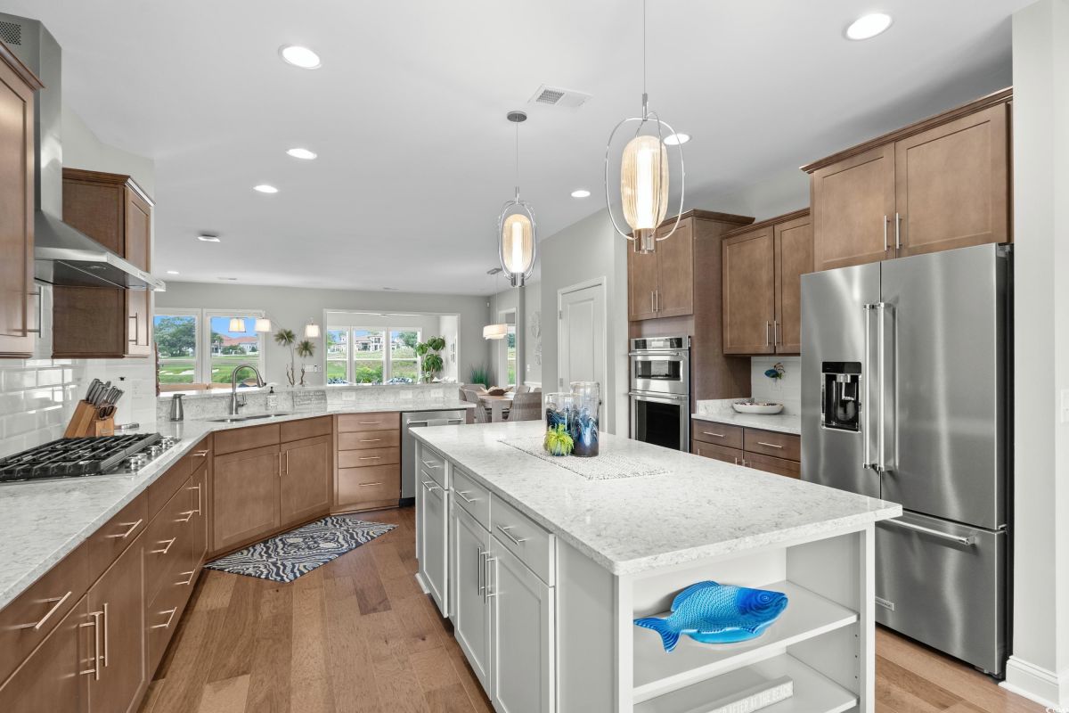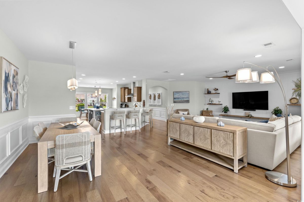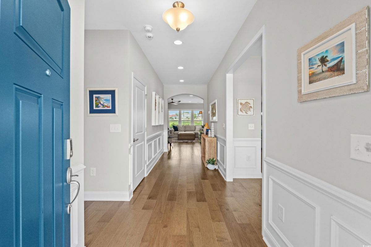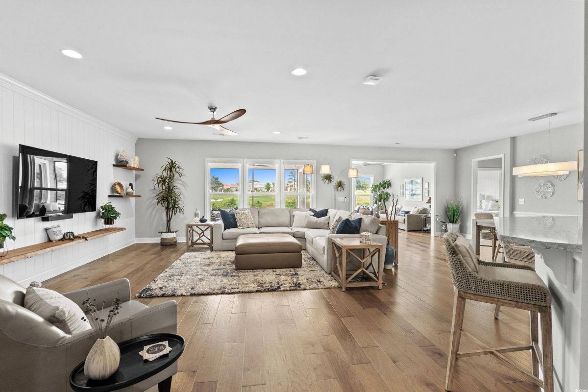 Experience waterway living at its finest at 7374 Sarteano Dr, a refined Grande Dunes residence where sophistication meets serenity. Nestled in the prestigious Del Webb neighborhood and situated on one of the premier ICW homesites, this one of a kind, immaculate 3 Bedroom, 3 bath home offers unmatched sunset views down the waterway and amazing golf views of the signature hole on the resort course. Upon entering this open plan, you'll immediately notice the custom upgrades and details that resonate throughout this exquisite residence. Natural light pours through the homes many windows, and added sunroom, perfect for watching the boats cruise by or golfers tee up on the green. The great room and owners suite come alive with custom shiplap accent walls, custom Cypress floating shelves in great room and a unique barn door in the primary. So many improvements in this place, including wood flooring throughout, full pull out cabinets, top of the line appliances, a custom vanity in the owners bath, and automated blinds for your convenience. Indulge in the craftsmanship of designer lighting & ceiling fans, the durability of a coated garage floor, security cameras, as well as whole house and A/C surge protectors...the list of enhancements is endless. Outside, enjoy your slice of paradise with an expansive stone patio featuring a custom gas fire pit, a grilling area, and plenty of room to chill, just an ideal combination for entertaining the family or serene evenings under the stars. Residents of this amenity-rich neighborhood enjoy a vibrant lifestyle with access to community features that cater to the 55+ market, ensuring that there’s always something to do and new friends to meet. Del Webb, a natural gas community, offers an indoor heated pool, an outdoor resort style pool, a fulltime activities director, pickleball and tennis courts, bocce ball court, a fitness center, a fire pit, walking trails and day docks for fishing or boating. Your lawn care is also included so you can spend your time savoring life. As an owner in Grande Dunes you have access to the 25,000 square foot Ocean Club where you can enjoy fine dining, happy hour outings, oceanfront pools with food and beverage service, private beach entrance, beach chair service, and other fun activities. Additionally, the community has two 18-hole golf courses, deep water marina, and a Har-tru tennis facility.