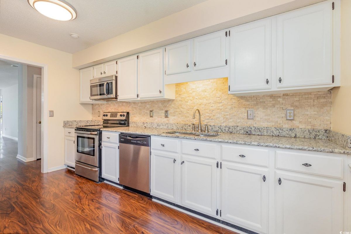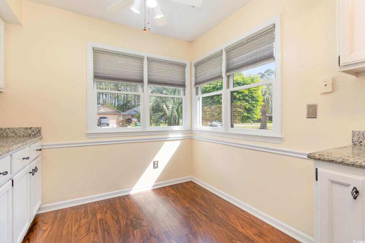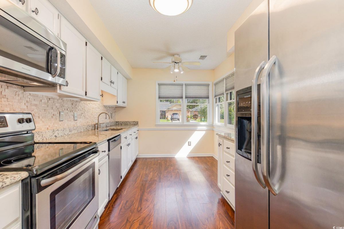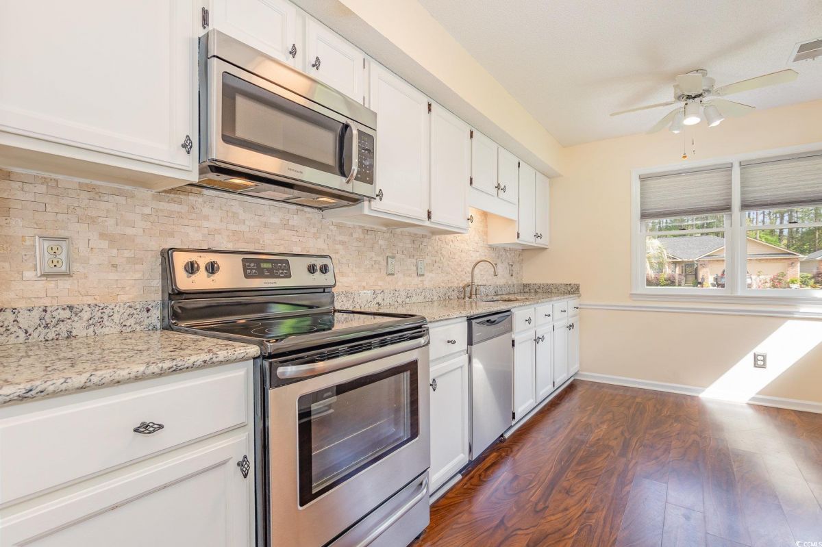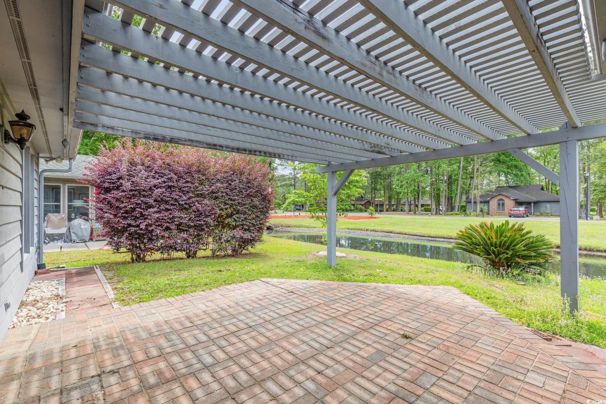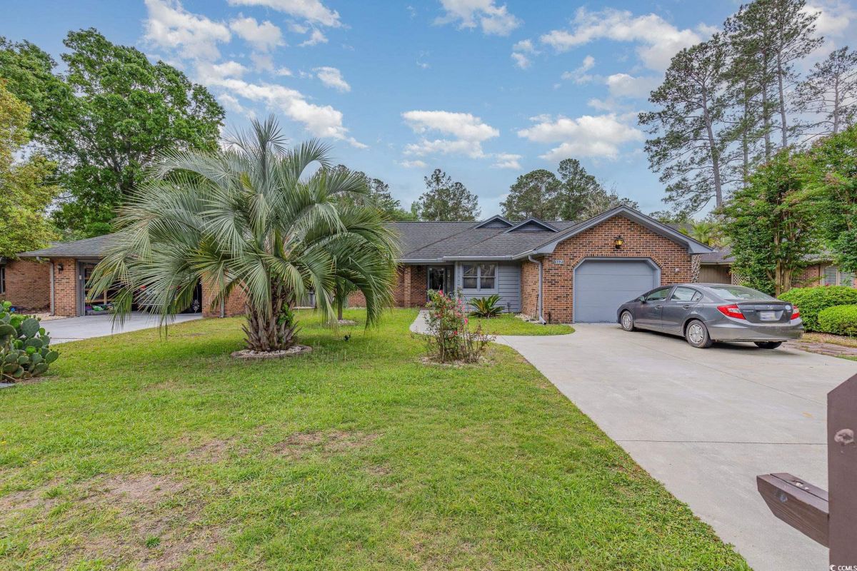 This beautiful home offers the perfect blend of comfort, style, and active living. Nestled in one of the area's most sought-after 55+ communities, Myrtle Trace. You'll enjoy incredible amenities including a sparkling community pool, basketball hoop, shuffleboard courts, and more. Step inside to find a spacious, open-concept layout with large living areas perfect for entertaining or relaxing. The updated kitchen features elegant granite countertops, newer stainless steel appliances, and ample cabinet space. This home features a large living room, sunroom, and split floorplan. The master suite is a large, open room with access to the sunroom. The master bathroom has been tastefully refinished, providing a spa-like retreat. The new counters and tiled shower complement the new flooring. Solid flooring flows throughout the home, adding warmth and durability. Enjoy your morning coffee or unwind in the evenings on the large covered porch with a charming pergola—offering peaceful views of the pond just beyond your backyard. The garage features a slop sink, cabinetry and shelving, finished floor, and a newer washer and dryer. This home has many positive features but will need some painting in the guest bedroom and a water leak repaired. Please reach out to your agent for details. This is an affordable opportunity to be in Myrtle Trace!