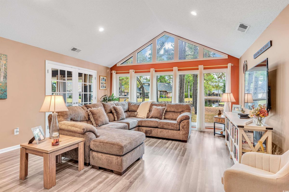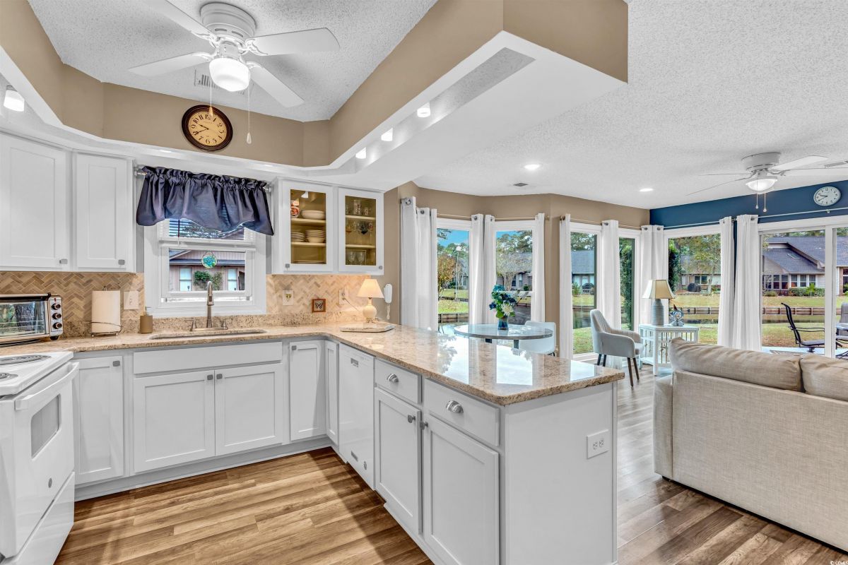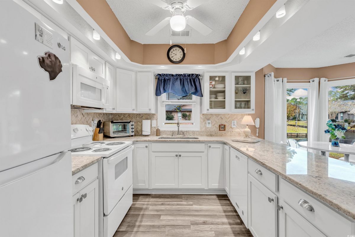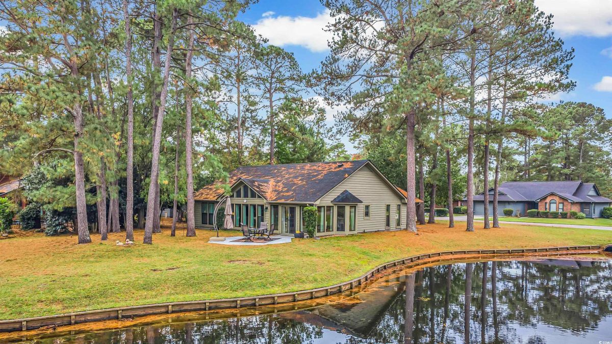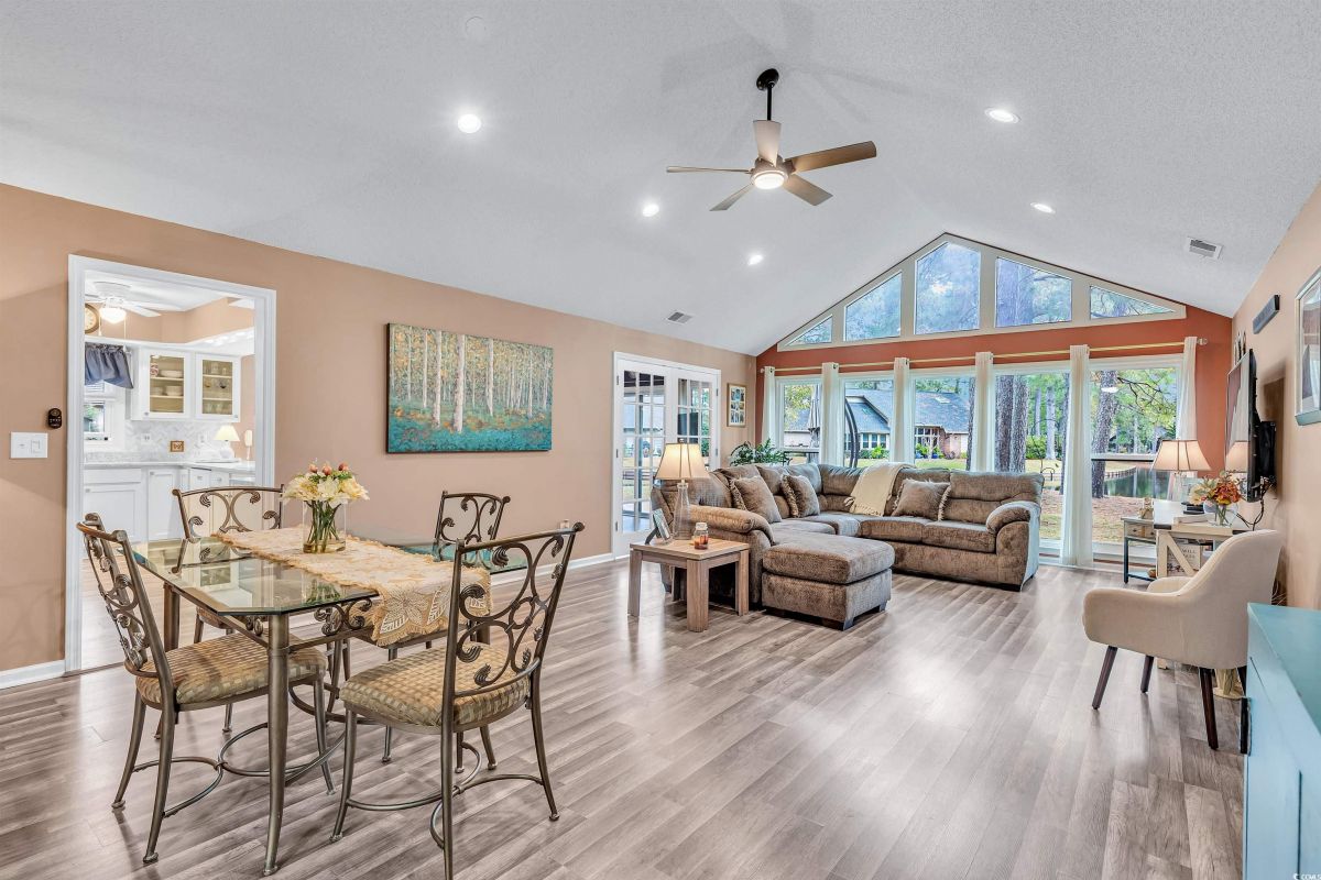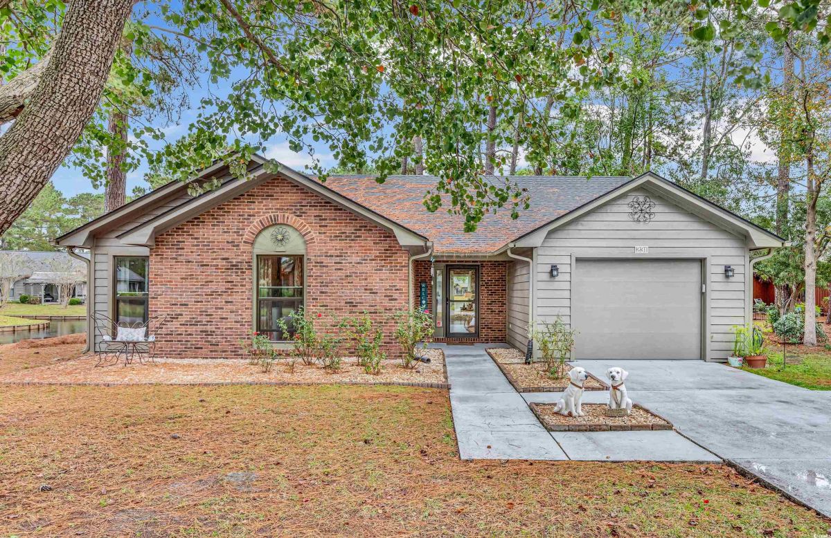 This beautifully maintained 3-bedroom, 2-bath ranch-style home is nestled in the highly desirable 55+ community of Myrtle Trace. Located on a spacious corner lot, it offers privacy and a stunning lakefront view, making it the perfect retreat. As you step inside, you're welcomed by soaring vaulted ceilings and an abundance of natural light that pours in through brand new, floor-to-ceiling windows. Freshly painted throughout and with new laminate flooring, the home boasts a modern elegance that's sure to impress. The expansive main living area is designed for both comfort and style, featuring a breathtaking view of the lake that seamlessly transitions into the charming eat-in breakfast nook and a fully renovated kitchen. No detail has been overlooked in the kitchen, which showcases stunning granite countertops, a stylish tile backsplash, custom glass-front cabinetry, and all-new appliances. The oversized master suite is a true sanctuary, complete with a large walk-in closet and an en-suite bath. The updated master bathroom features a new vanity and a beautiful walk-in shower. The thoughtful split floor plan provides privacy for the master bedroom while two additional spacious bedrooms share a fully renovated secondary bath, also featuring a walk-in shower with custom tile work. This home is packed with additional upgrades, including new ceiling fans throughout, a new garage door motor, recessed lighting, exterior timer lights, gutter guards, a storm door, and an attic fan with lights. Outside, the private backyard is an oasis, featuring a large octagon seating area perfect for relaxing or entertaining. This home truly must be seen in person to fully appreciate all its features. Call today to schedule your private showing, this one won't last long! All measurements and square footage are approximate and not guaranteed. Buyer/Buyers Agent is responsible for verification.