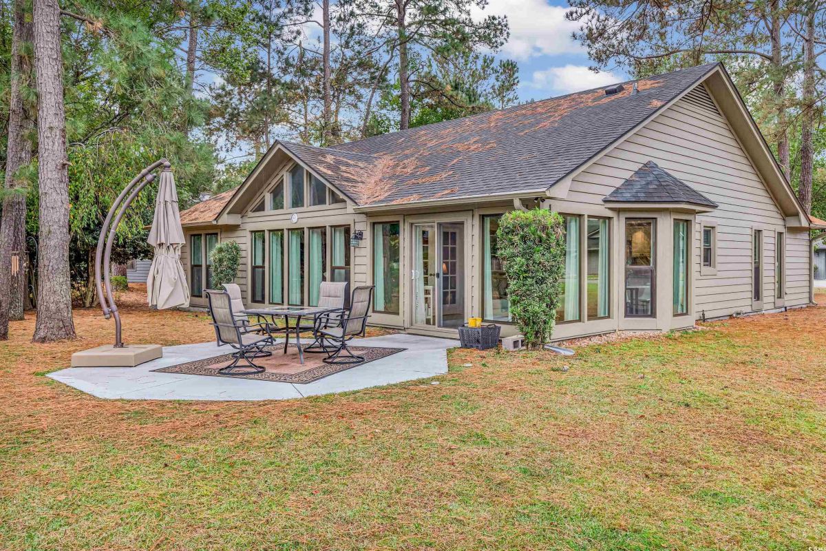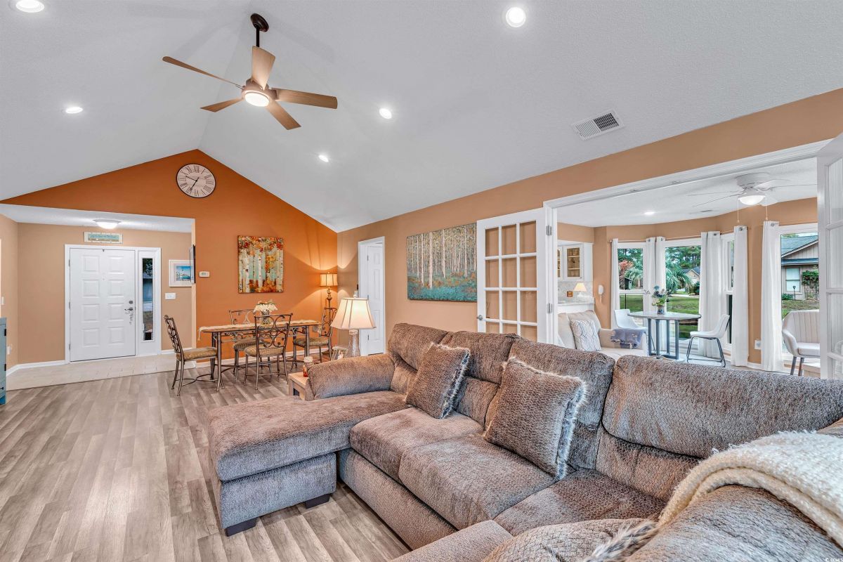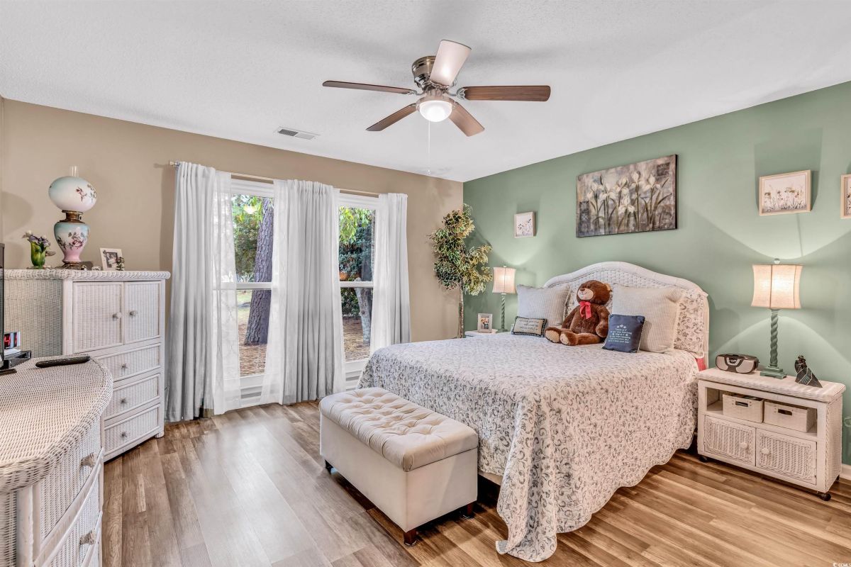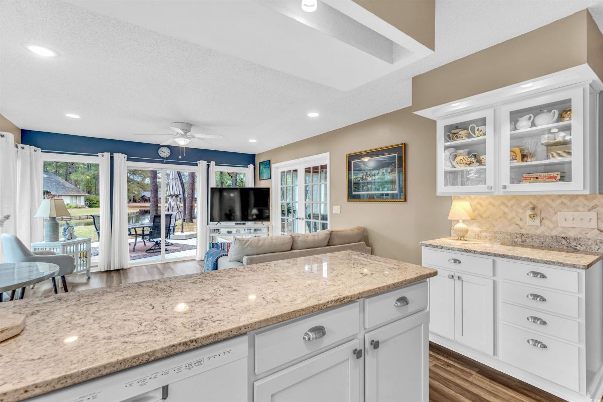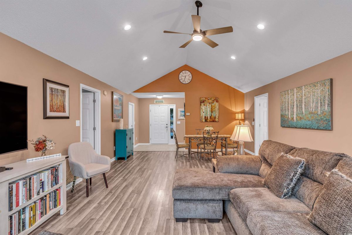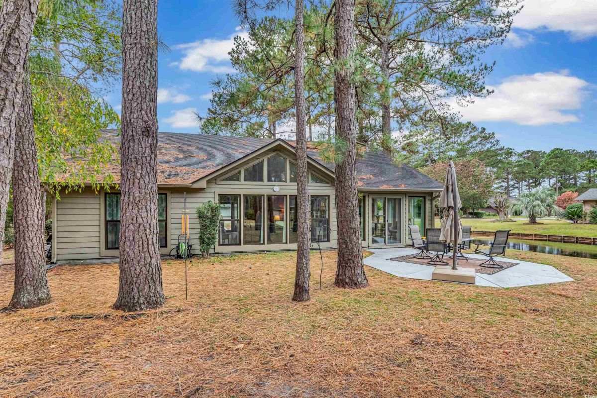 This beautifully maintained 3-bedroom, 2-bath ranch-style home is nestled in the highly desirable 55+ community of Myrtle Trace. Located on a spacious corner lot, it offers privacy and a stunning lakefront view, making it the perfect retreat. As you step inside, you're welcomed by soaring vaulted ceilings and an abundance of natural light that pours in through brand new, floor-to-ceiling windows. Freshly painted throughout and with new laminate flooring, the home boasts a modern elegance that's sure to impress. The expansive main living area is designed for both comfort and style, featuring a breathtaking view of the lake that seamlessly transitions into the charming eat-in breakfast nook and a fully renovated kitchen. No detail has been overlooked in the kitchen, which showcases stunning granite countertops, a stylish tile backsplash, custom glass-front cabinetry, and all-new appliances. The oversized master suite is a true sanctuary, complete with a large walk-in closet and an en-suite bath. The updated master bathroom features a new vanity and a beautiful walk-in shower. The thoughtful split floor plan provides privacy for the master bedroom while two additional spacious bedrooms share a fully renovated secondary bath, also featuring a walk-in shower with custom tile work. This home is packed with additional upgrades, including new ceiling fans throughout, a new garage door motor, recessed lighting, exterior timer lights, gutter guards, a storm door, and an attic fan with lights. Outside, the private backyard is an oasis, featuring a large octagon seating area perfect for relaxing or entertaining. This home truly must be seen in person to fully appreciate all its features. Call today to schedule your private showing, this one won't last long! All measurements and square footage are approximate and not guaranteed. Buyer/Buyers Agent is responsible for verification.