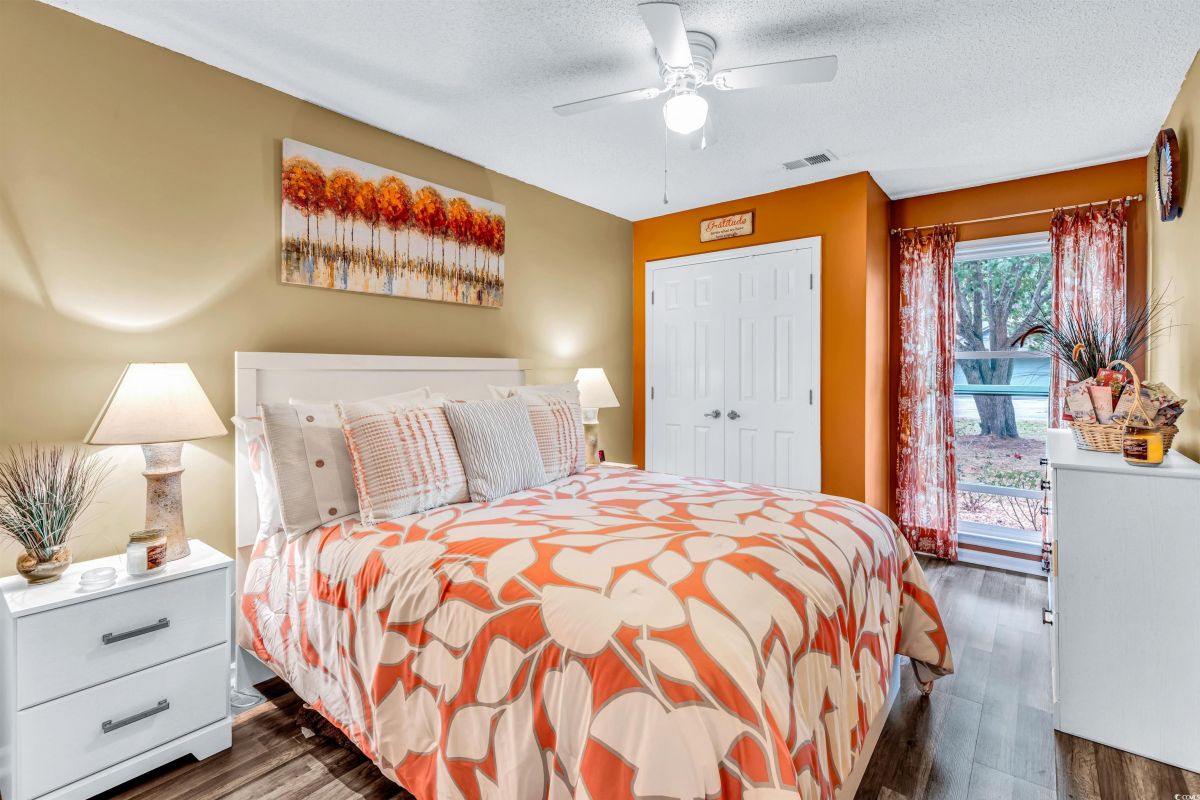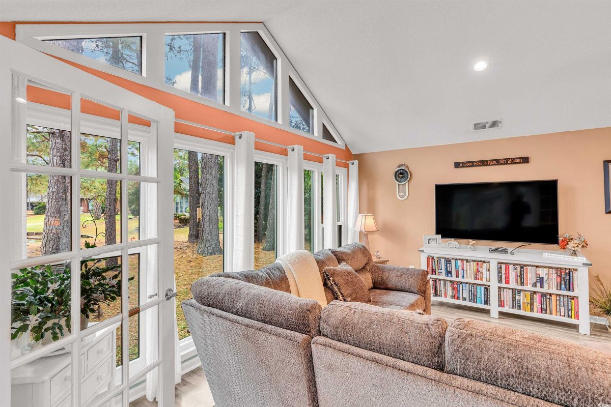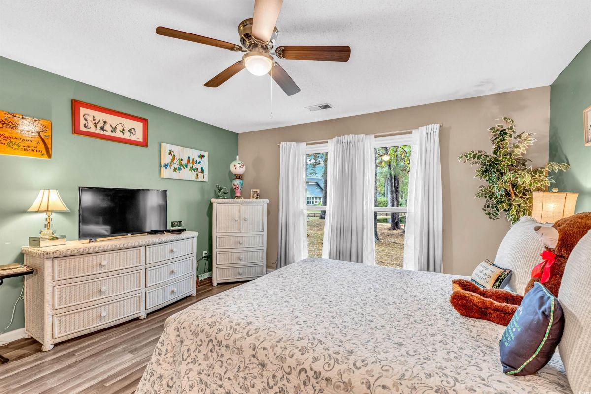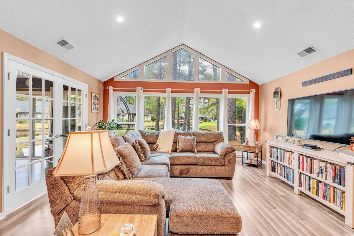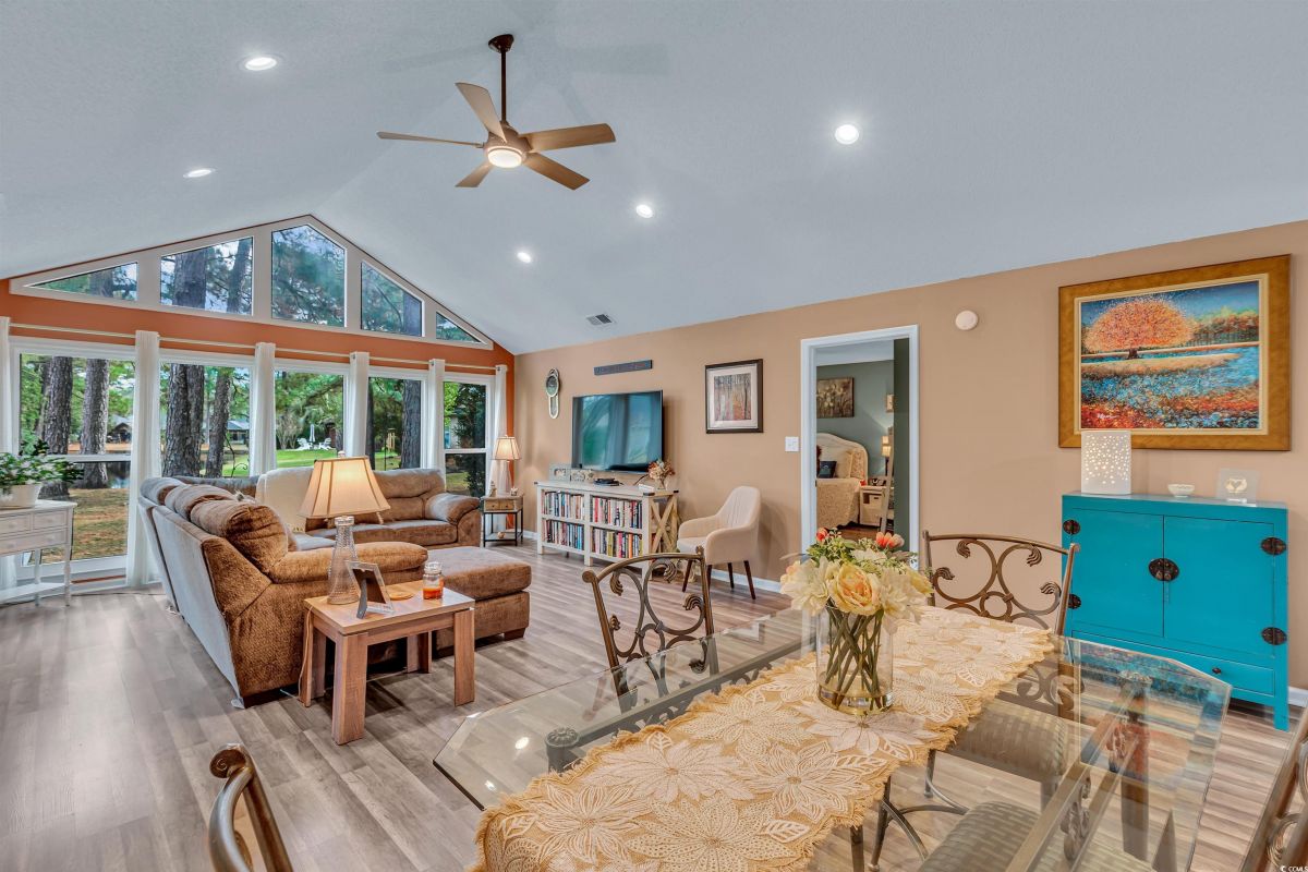 This beautifully maintained 3-bedroom, 2-bath ranch-style home is nestled in the highly desirable 55+ community of Myrtle Trace. Located on a spacious corner lot, it offers privacy and a stunning lakefront view, making it the perfect retreat. As you step inside, you're welcomed by soaring vaulted ceilings and an abundance of natural light that pours in through brand new, floor-to-ceiling windows. Freshly painted throughout and with new laminate flooring, the home boasts a modern elegance that's sure to impress. The expansive main living area is designed for both comfort and style, featuring a breathtaking view of the lake that seamlessly transitions into the charming eat-in breakfast nook and a fully renovated kitchen. No detail has been overlooked in the kitchen, which showcases stunning granite countertops, a stylish tile backsplash, custom glass-front cabinetry, and all-new appliances. The oversized master suite is a true sanctuary, complete with a large walk-in closet and an en-suite bath. The updated master bathroom features a new vanity and a beautiful walk-in shower. The thoughtful split floor plan provides privacy for the master bedroom while two additional spacious bedrooms share a fully renovated secondary bath, also featuring a walk-in shower with custom tile work. This home is packed with additional upgrades, including new ceiling fans throughout, a new garage door motor, recessed lighting, exterior timer lights, gutter guards, a storm door, and an attic fan with lights. Outside, the private backyard is an oasis, featuring a large octagon seating area perfect for relaxing or entertaining. This home truly must be seen in person to fully appreciate all its features. Call today to schedule your private showing, this one won't last long! All measurements and square footage are approximate and not guaranteed. Buyer/Buyers Agent is responsible for verification.