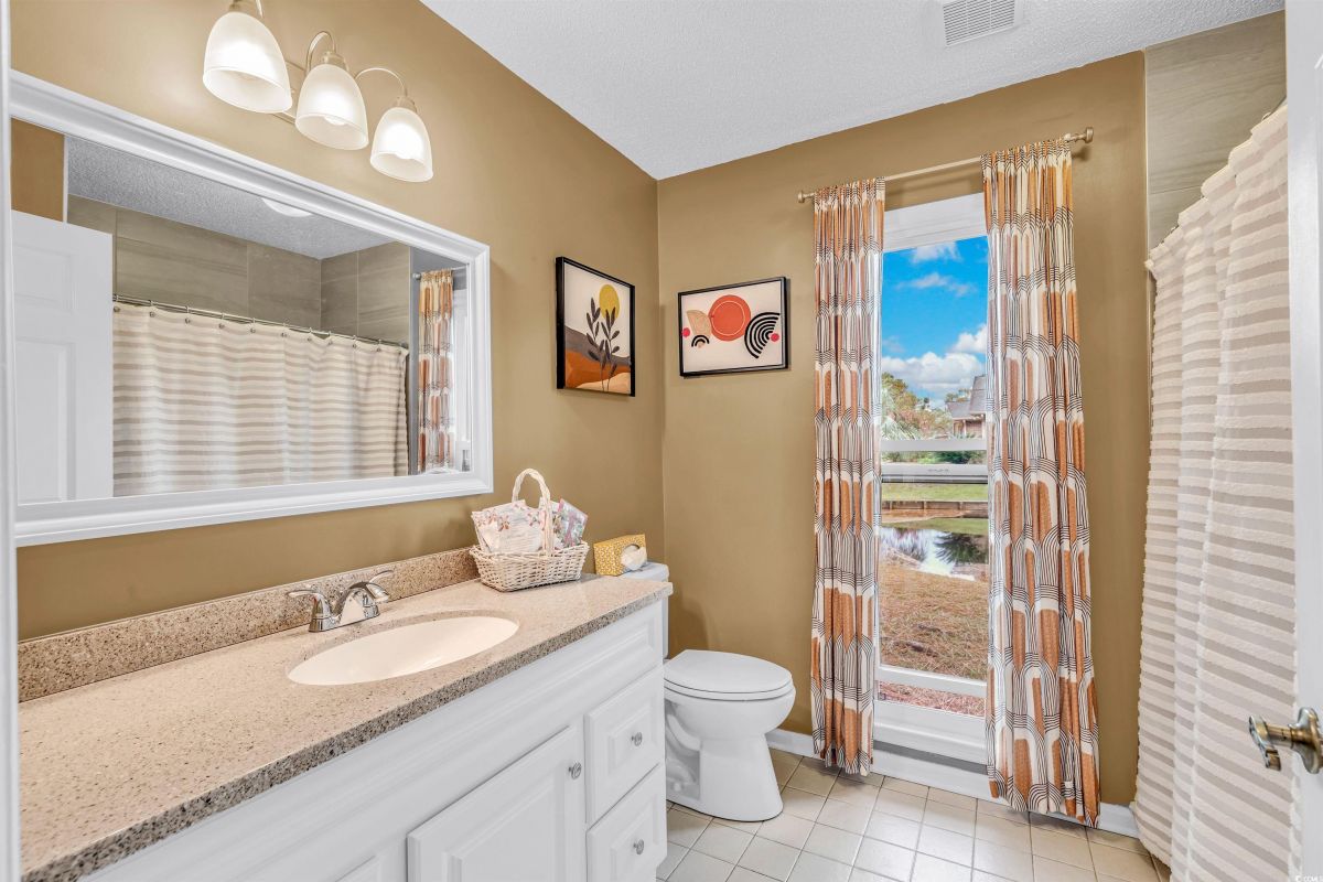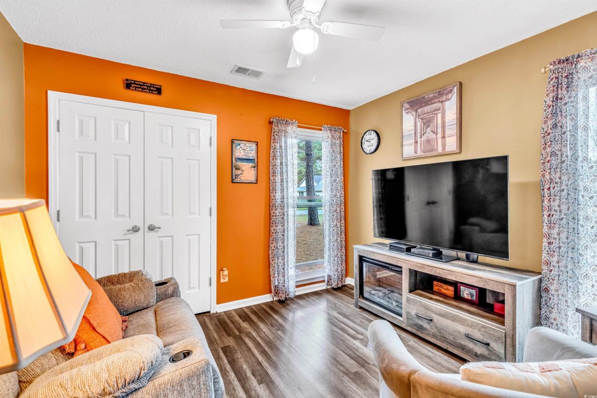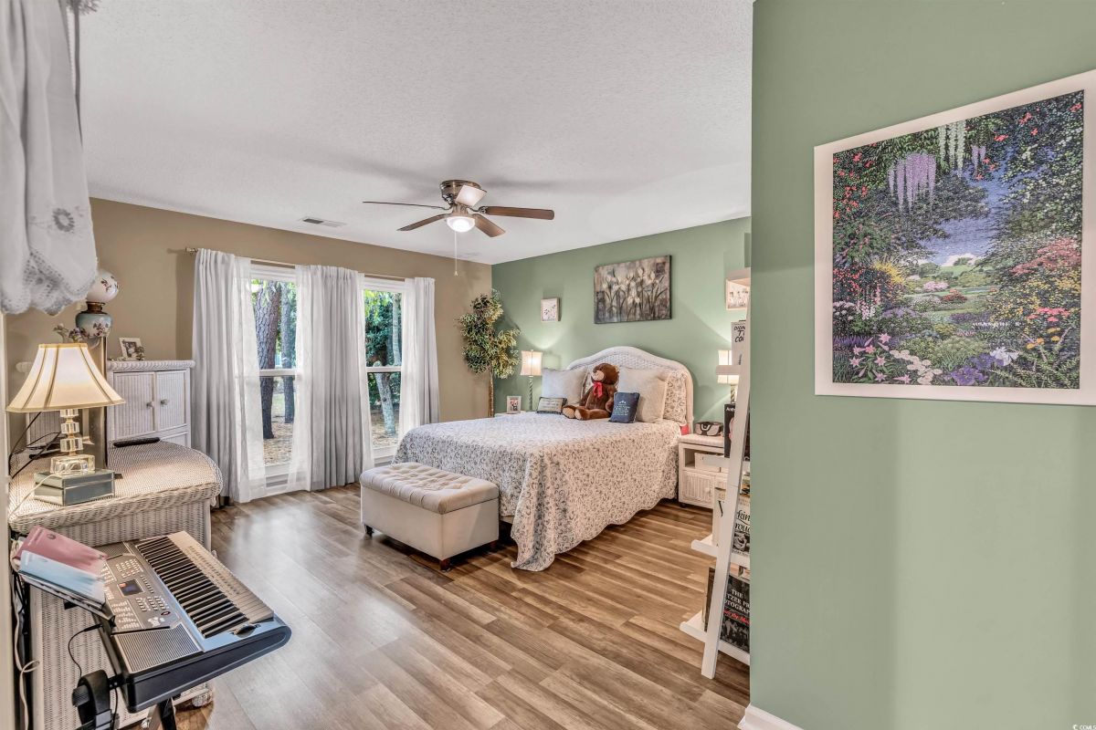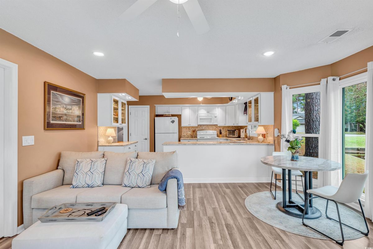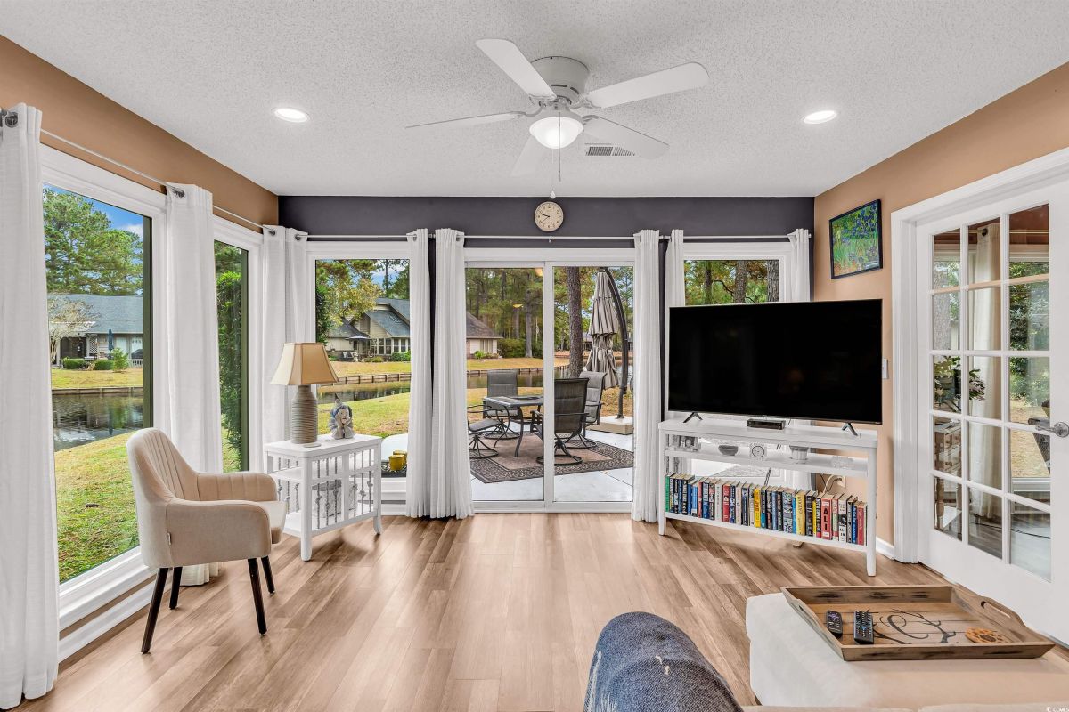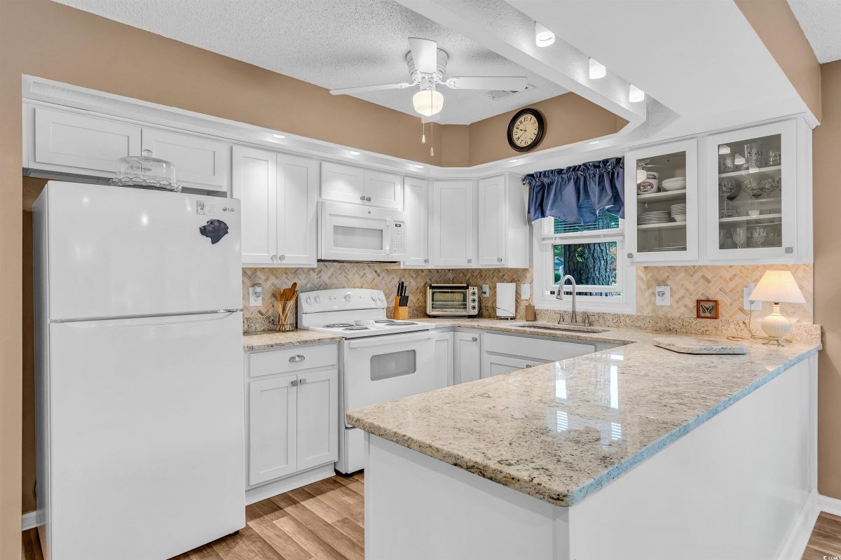 This beautifully maintained 3-bedroom, 2-bath ranch-style home is nestled in the highly desirable 55+ community of Myrtle Trace. Located on a spacious corner lot, it offers privacy and a stunning lakefront view, making it the perfect retreat. As you step inside, you're welcomed by soaring vaulted ceilings and an abundance of natural light that pours in through brand new, floor-to-ceiling windows. Freshly painted throughout and with new laminate flooring, the home boasts a modern elegance that's sure to impress. The expansive main living area is designed for both comfort and style, featuring a breathtaking view of the lake that seamlessly transitions into the charming eat-in breakfast nook and a fully renovated kitchen. No detail has been overlooked in the kitchen, which showcases stunning granite countertops, a stylish tile backsplash, custom glass-front cabinetry, and all-new appliances. The oversized master suite is a true sanctuary, complete with a large walk-in closet and an en-suite bath. The updated master bathroom features a new vanity and a beautiful walk-in shower. The thoughtful split floor plan provides privacy for the master bedroom while two additional spacious bedrooms share a fully renovated secondary bath, also featuring a walk-in shower with custom tile work. This home is packed with additional upgrades, including new ceiling fans throughout, a new garage door motor, recessed lighting, exterior timer lights, gutter guards, a storm door, and an attic fan with lights. Outside, the private backyard is an oasis, featuring a large octagon seating area perfect for relaxing or entertaining. This home truly must be seen in person to fully appreciate all its features. Call today to schedule your private showing, this one won't last long! All measurements and square footage are approximate and not guaranteed. Buyer/Buyers Agent is responsible for verification.