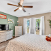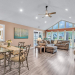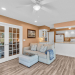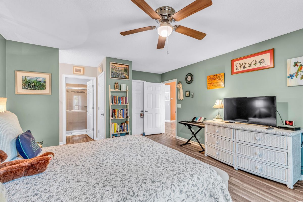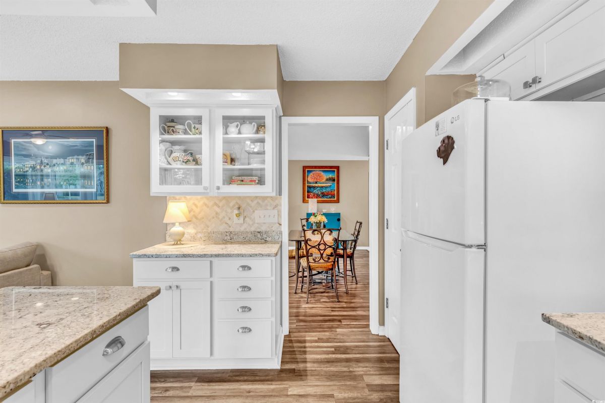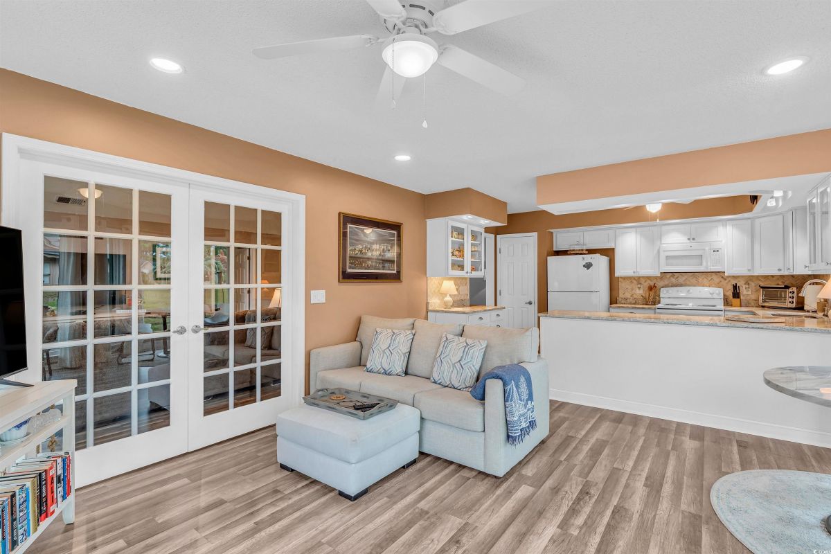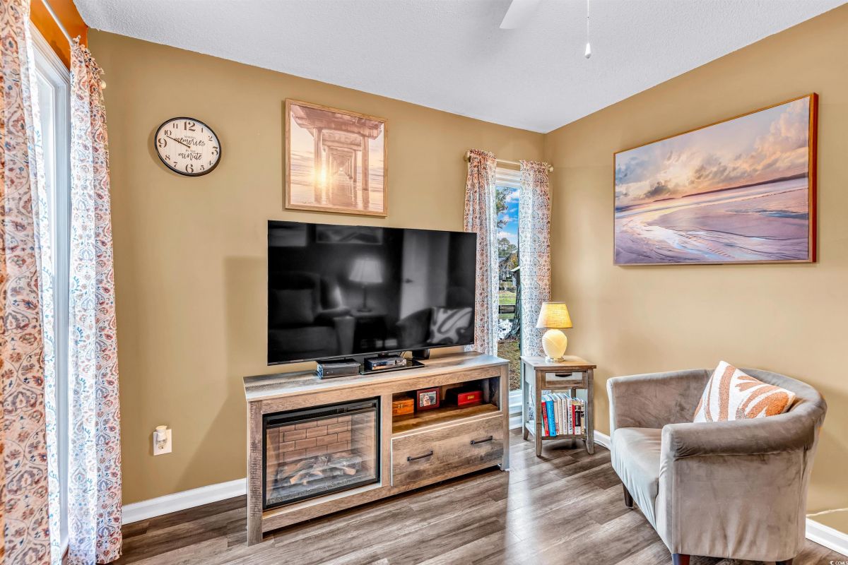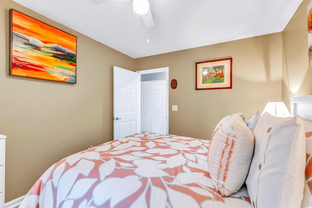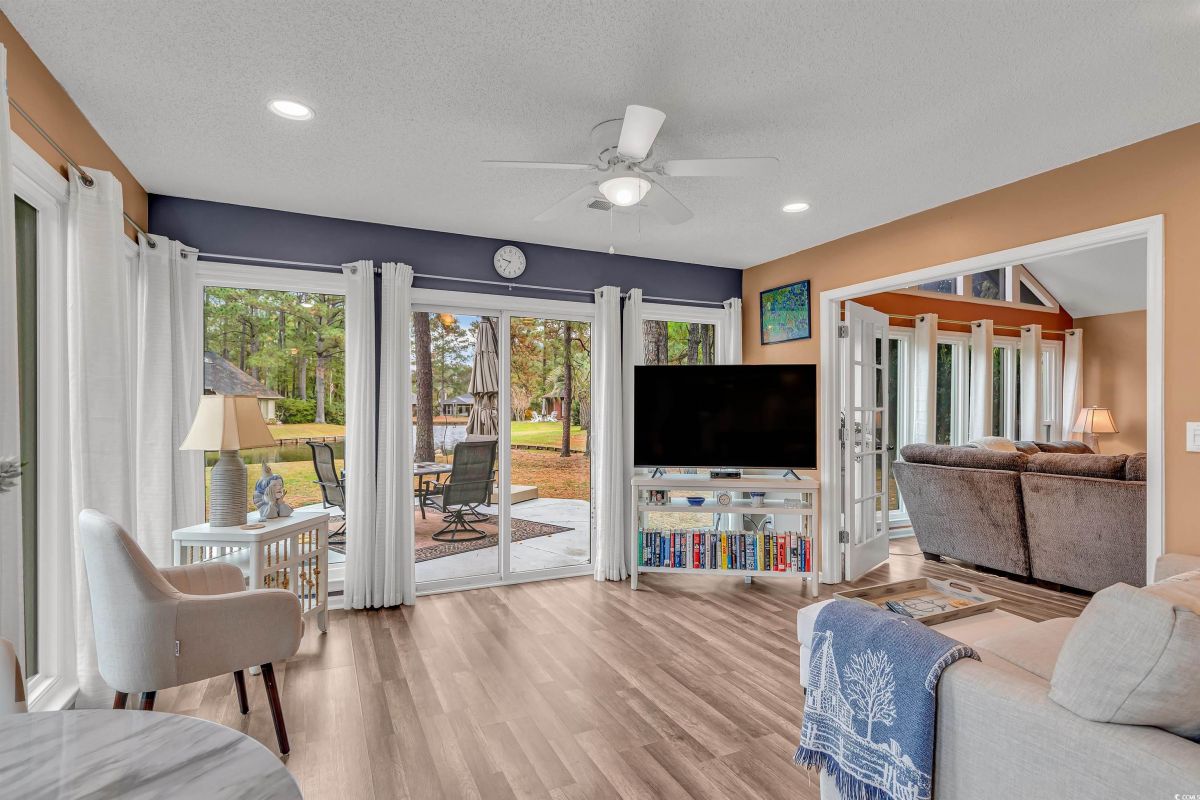 This beautifully maintained 3-bedroom, 2-bath ranch-style home is nestled in the highly desirable 55+ community of Myrtle Trace. Located on a spacious corner lot, it offers privacy and a stunning lakefront view, making it the perfect retreat. As you step inside, you're welcomed by soaring vaulted ceilings and an abundance of natural light that pours in through brand new, floor-to-ceiling windows. Freshly painted throughout and with new laminate flooring, the home boasts a modern elegance that's sure to impress. The expansive main living area is designed for both comfort and style, featuring a breathtaking view of the lake that seamlessly transitions into the charming eat-in breakfast nook and a fully renovated kitchen. No detail has been overlooked in the kitchen, which showcases stunning granite countertops, a stylish tile backsplash, custom glass-front cabinetry, and all-new appliances. The oversized master suite is a true sanctuary, complete with a large walk-in closet and an en-suite bath. The updated master bathroom features a new vanity and a beautiful walk-in shower. The thoughtful split floor plan provides privacy for the master bedroom while two additional spacious bedrooms share a fully renovated secondary bath, also featuring a walk-in shower with custom tile work. This home is packed with additional upgrades, including new ceiling fans throughout, a new garage door motor, recessed lighting, exterior timer lights, gutter guards, a storm door, and an attic fan with lights. Outside, the private backyard is an oasis, featuring a large octagon seating area perfect for relaxing or entertaining. This home truly must be seen in person to fully appreciate all its features. Call today to schedule your private showing, this one won't last long! All measurements and square footage are approximate and not guaranteed. Buyer/Buyers Agent is responsible for verification.