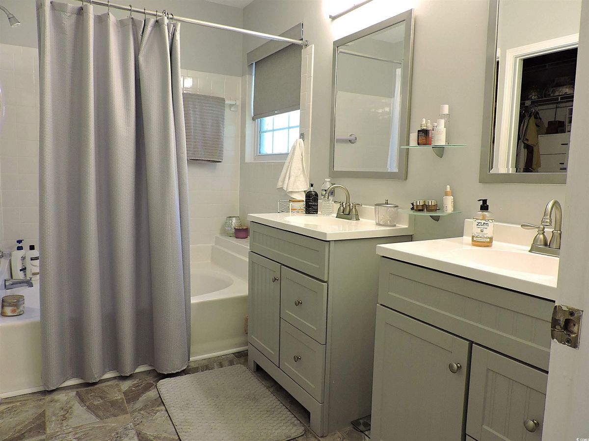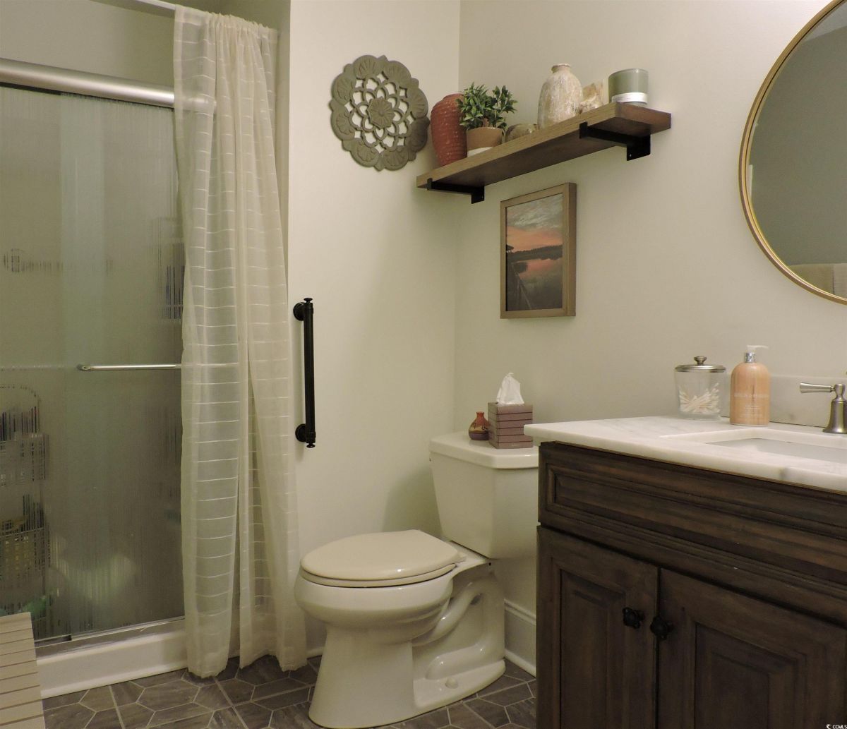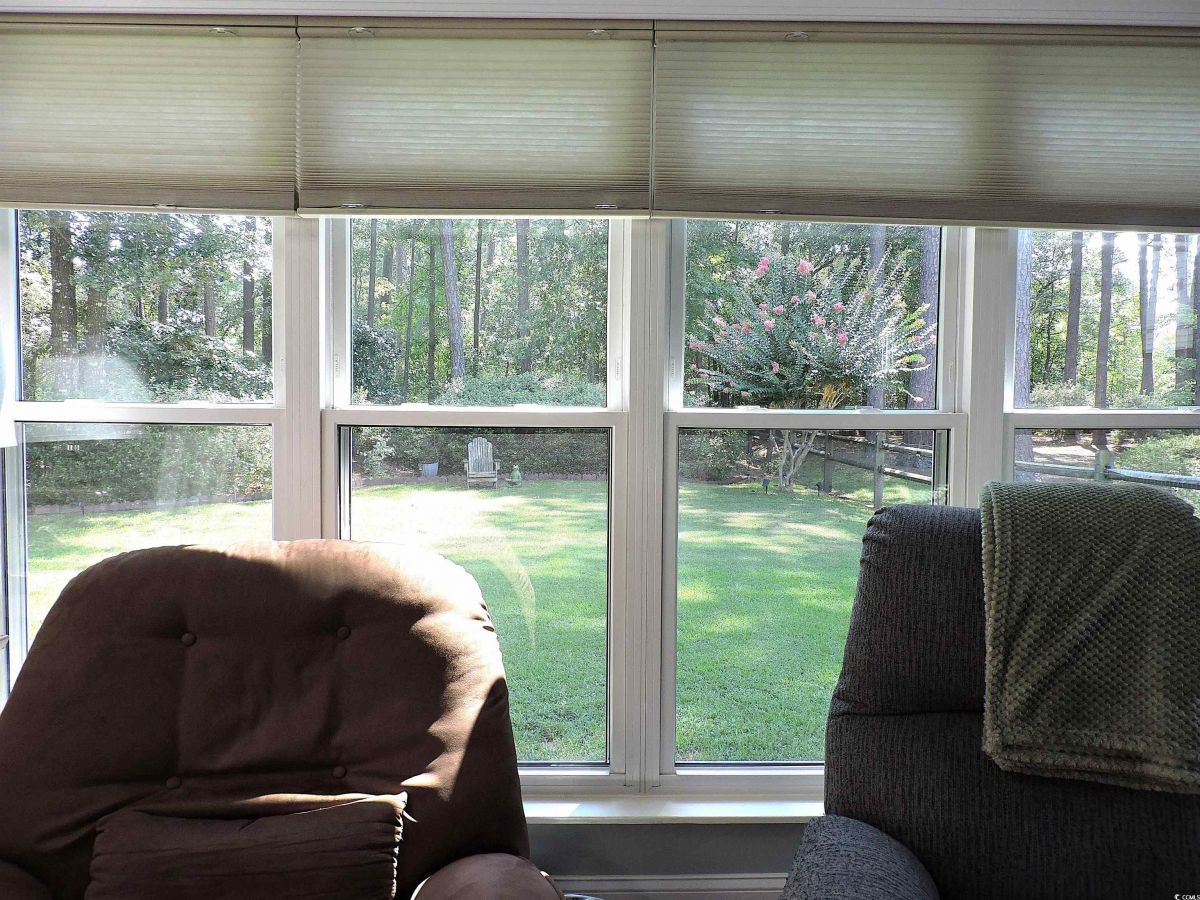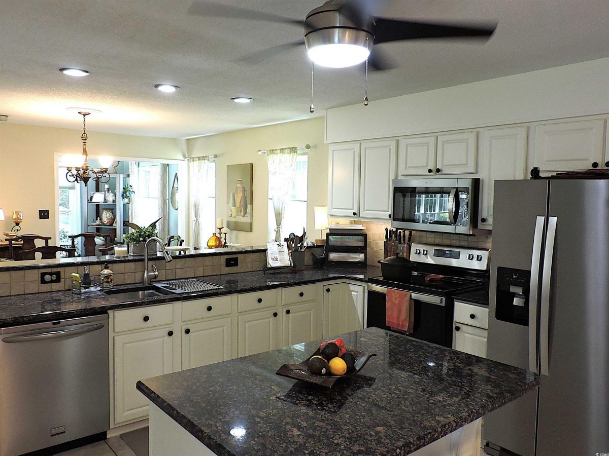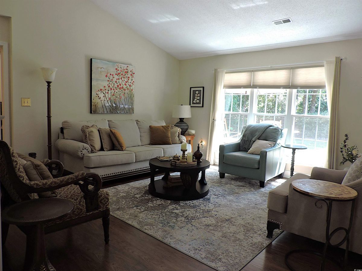 This wonderfully updated three bedroom two bath home is located in the 55+ community Woodlake Village of Murrells Inlet. Once you park, you'll notice the two car garage and beautifully landscaped lawn. Walk up to the front of the home and the front courtyard is inviting with a gate and tall roof line. Beautiful for sitting, walk inside to the spacious bright living room with open dining room and kitchen. Flooring is laminate hardwood thru the main living spaces. The kitchen with travertine tile and stainless steel appliances were all recently updated. Granite countertops throughout the kitchen and an island for additional countertop space. An eat in kitchen space with windows makes for the perfect breakfast nook for seating. Off the kitchen is the two car garage with space for two cars to park. A door off the garage makes trash and access easier. Back inside, the dining room opens to your sunroom with a wall of windows and skylights. Outside the oversized porch provides lots of space. Back yard is fenced in and spacious, being one of the larger lots in the neighborhood and backing up to the woods. There is a lot of privacy. Inside, the master bedroom is off the hallway. Master is spacious and located on the back of the home. Master bathroom has a double vanity and closet. Down the hallway is the second bathroom and two additional bedrooms. You wont want to miss seeing this home! Book your appointment today!