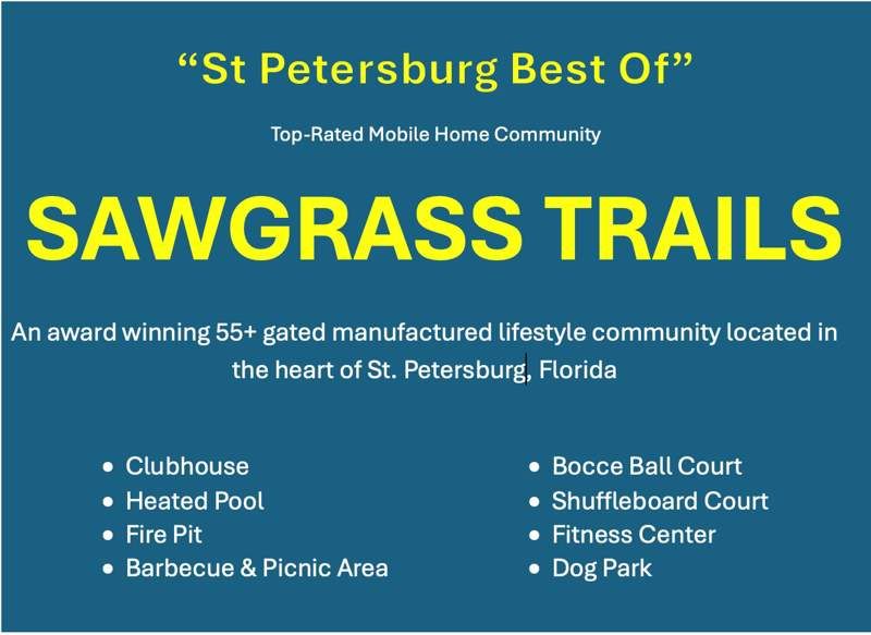 Space, comfort, and luxury touches—this is your home. Start your mornings with coffee on the front porch and unwind with evening cocktails in the shady lanai. This stunning home is sold turnkey fully furnished. Some wall art and accessories are not included. I have a list with pictures of those items. Inside, you’ll find cathedral ceilings, sheet rock walls, marble window sills, crown molding, baseboards, and classic six-panel doors throughout. The open-concept kitchen, living, and dining areas are spacious, light, and airy—perfect for entertaining. Stainless steel kitchen appliances complete the space. The primary bedroom easily accommodates a king-size bed with additional furniture and features a huge walk-in closet. The en-suite bath offers a double-sink vanity with designer lighting, ceramic flooring, and a beautifully tiled walk-in shower with built-in seat. Ceiling fan with remote control. The guest bedroom includes a ceiling fan and comfortably fits a full-size bed. The guest bath features ceramic flooring, a designer tub/shower, and a stylish vanity with updated lighting. Additional highlights include an indoor laundry closet, new HVAC (2019), preventative termite treatment (2017), and hot water heater installed in 2008. The two-car carport is fully screened to protect vehicles, and a large storage shed with shelving provides ample extra storage. EV charging station on carport as well. A perfect blend of space, comfort, and thoughtful upgrades—ready for you to enjoy. Sawgrass Trails at Lowe's City is an active, resort style, 55+ community in the vibrant city of St Petersburg. Close to relaxing area beaches as well as all the exciting downtown activities of St Pete, our gated community features a newly renovated clubhouse, heated pool, game courts, planned activities, bingo, cards, parties, potlucks, etc.. Relax by the scenic pond. Homeowners have 24 hour access to club house with media room, billiards room, library with living room, exercise center and pickle ball court. Fur Babies Welcome! Yes, we allow up to 2 pets, 25lbs ea, to live with you in Sawgrass Trails. We have a wonderful Bark Park and a very social dog owner community. Only 15 minutes to scenic Downtown St. Pete and 25 minutes to area beaches.